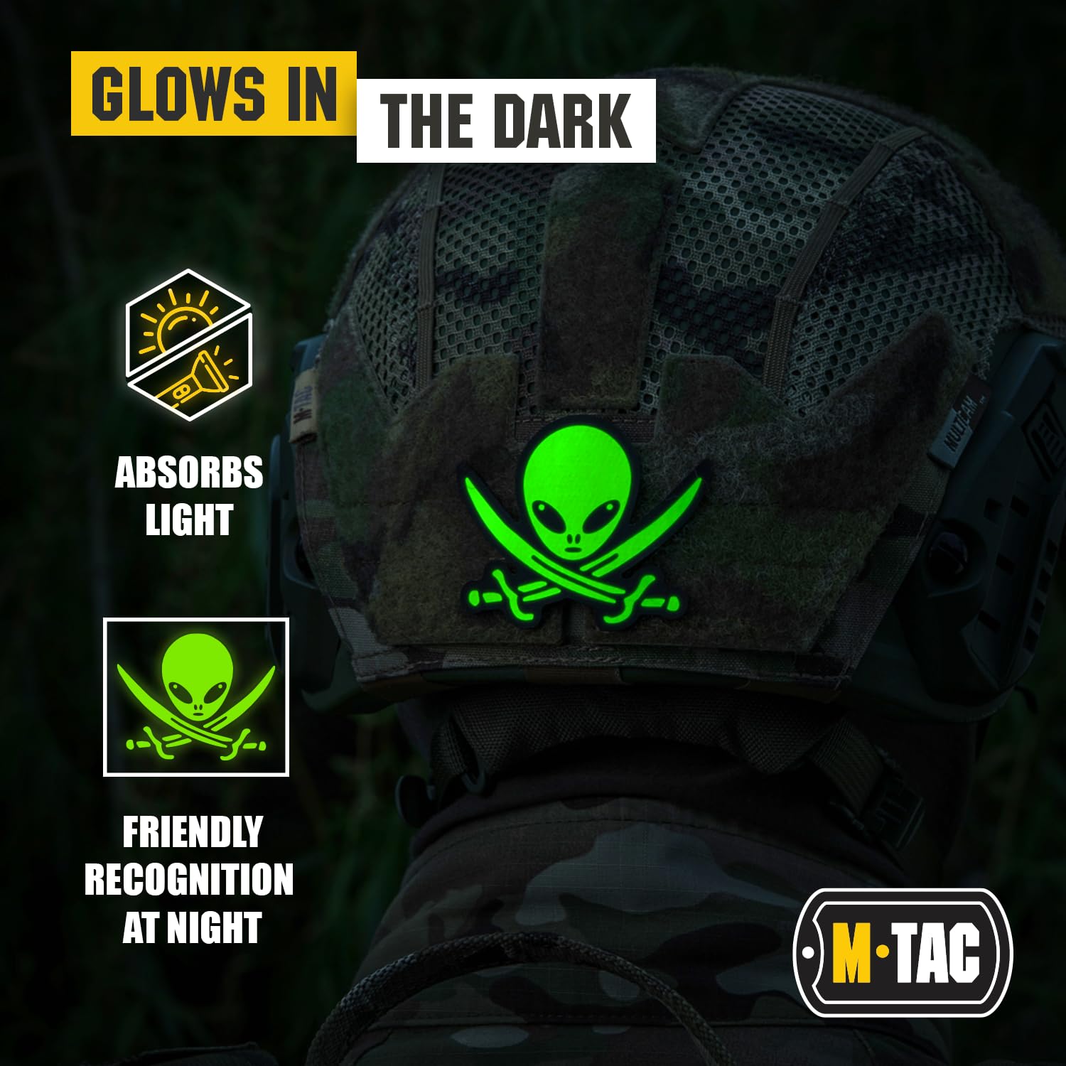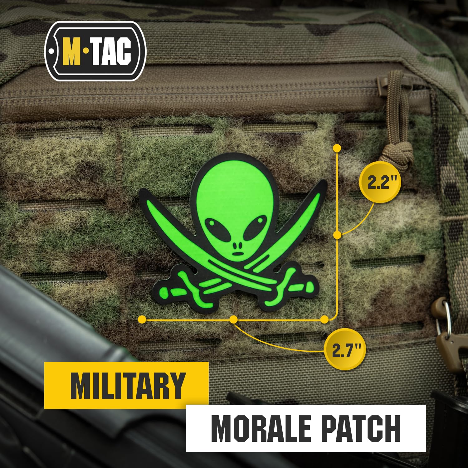 Whether you're in the military, law enforcement, or an outdoor enthusiast, this patch is the ideal way to customize your equipment and stand out. Features: Durable Cordura construction. Laser-cut design for precision. Glow-in-the-dark alien motif. Hook-and-loop backing for easy attachment. Size: 2.75 x 2.16 inches.