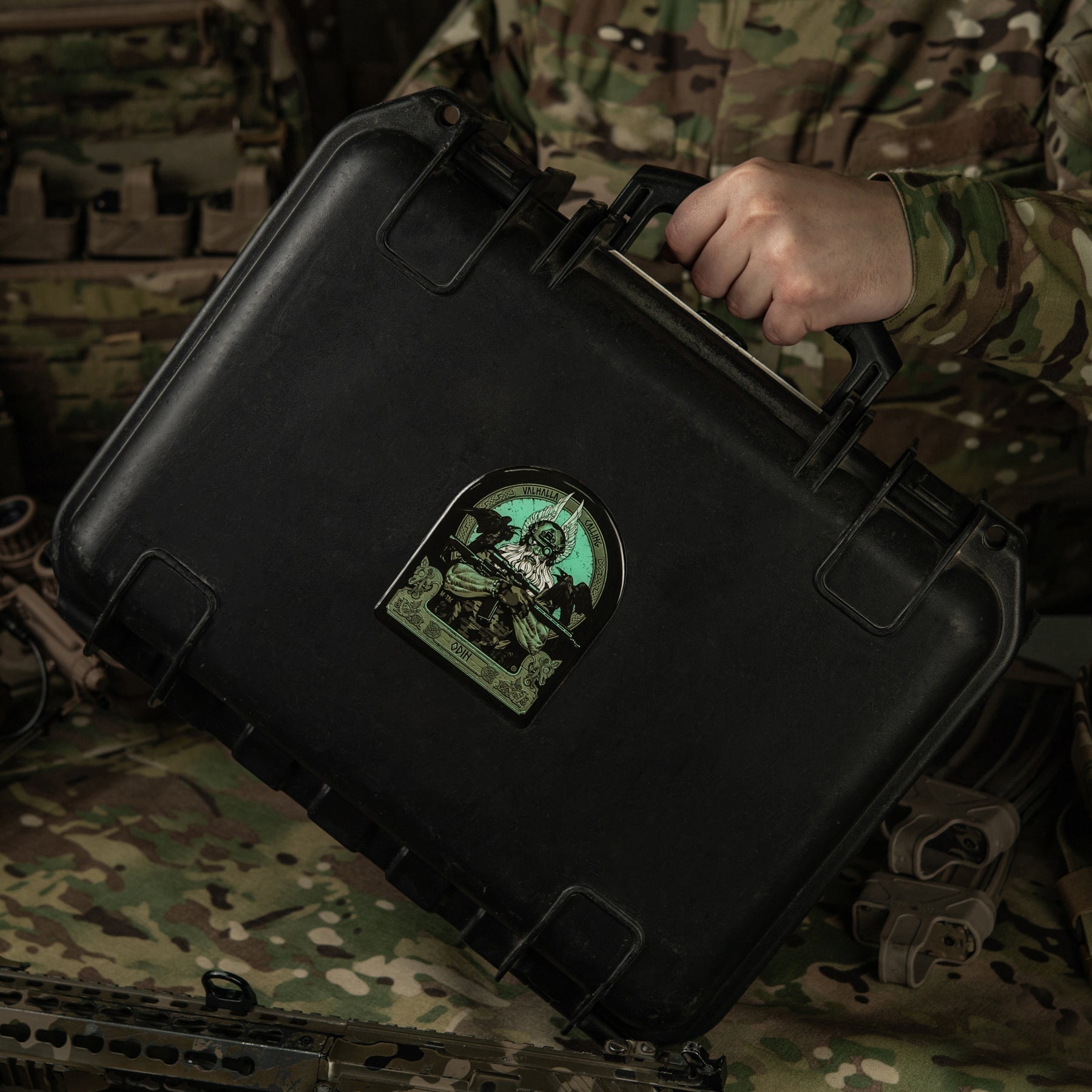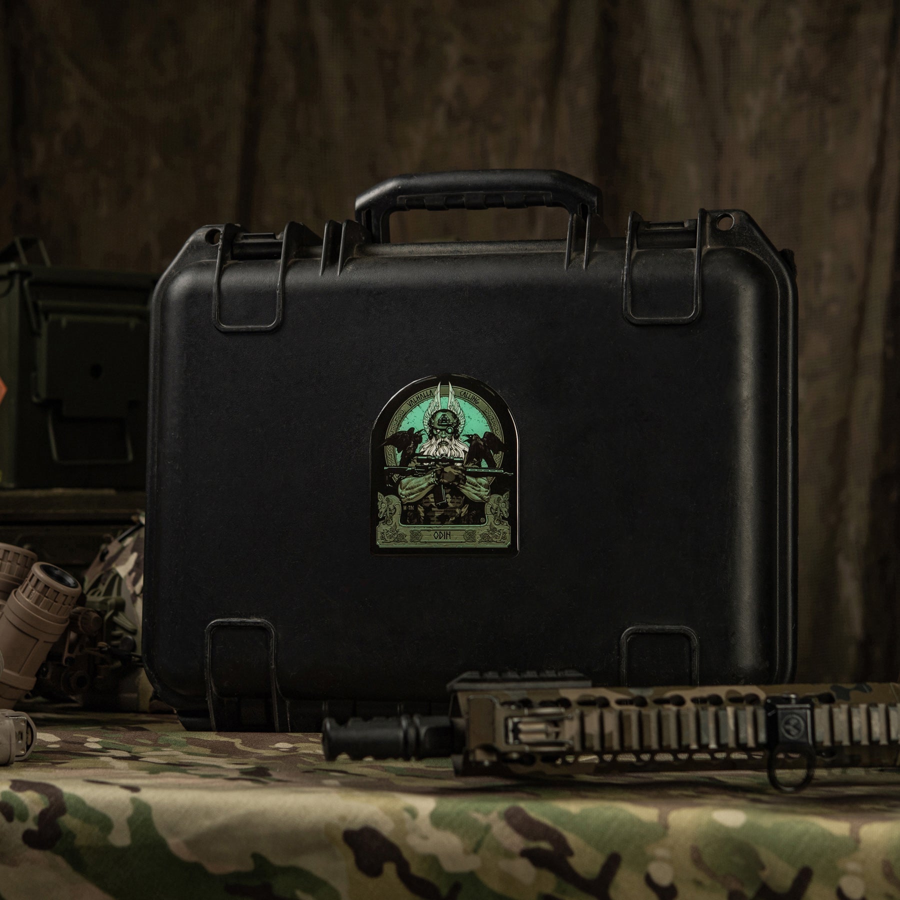 The sticker depicts a determined Odin who has traded his traditional spear (Gungnir) for an AR-15 rifle. Dressed in modern combat gear and a helmet with night vision, he is ready to lead his warriors into the final battle. On Odin’s shoulders sit his loyal companions — the ravens Huginn (thought) and Muninn (memory), who fly across the 9 worlds each day and report everything they see to the Allfather.