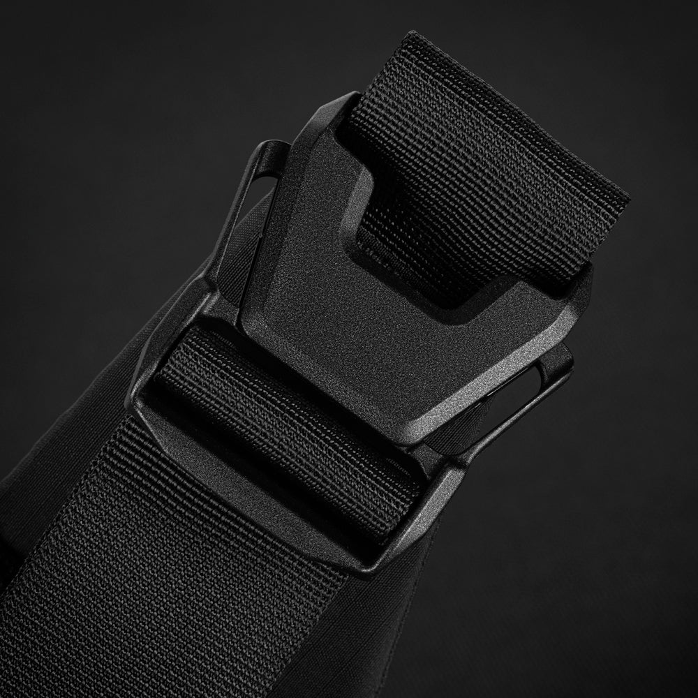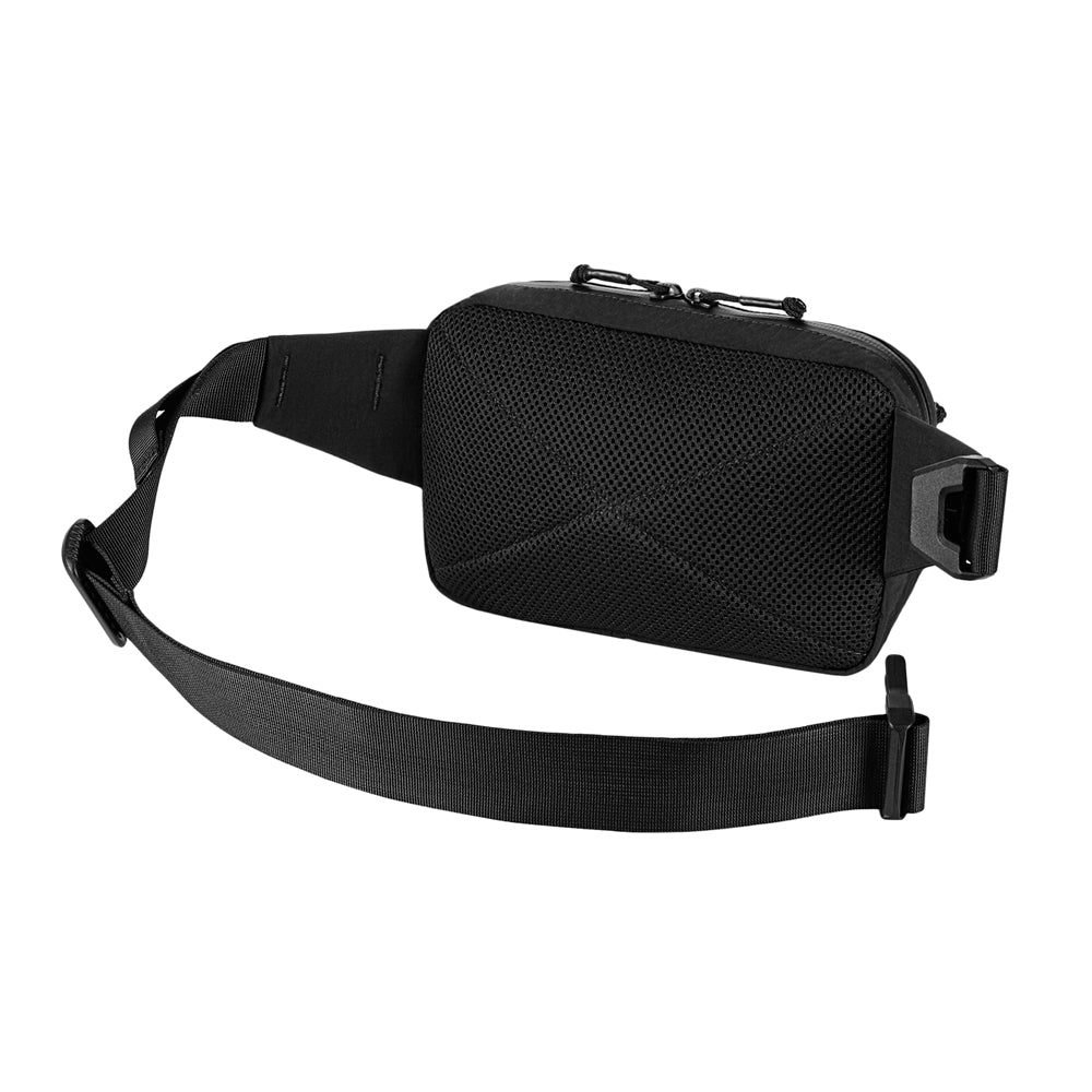 The main compartment features two distinct sections: an outer mesh pocket and an inner wall lined with loop fabric. This allows the user to customize the internal space with various modular inserts (sold separately). The front of the bag features a zippered pocket, a panel for ID markers or patches, and a decorative webbing strap. The adjustable strap, equipped with a reliable Woojin fastex buckle, allows the bag to be worn comfortably either over the shoulder or around the waist.