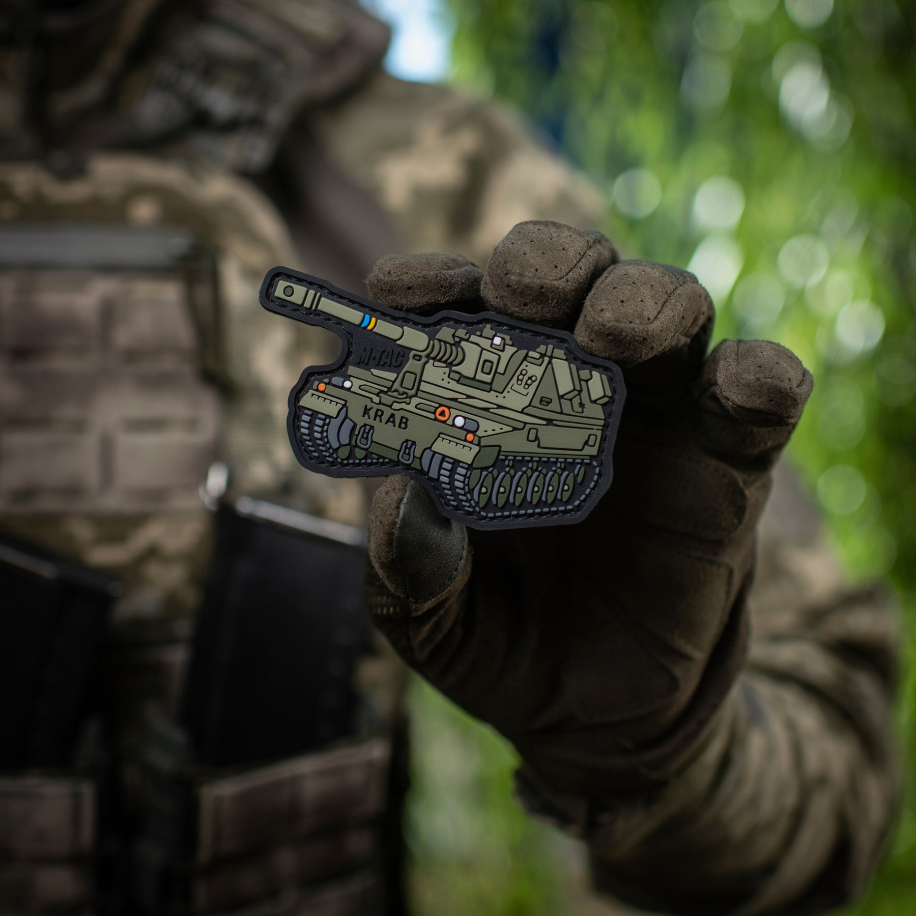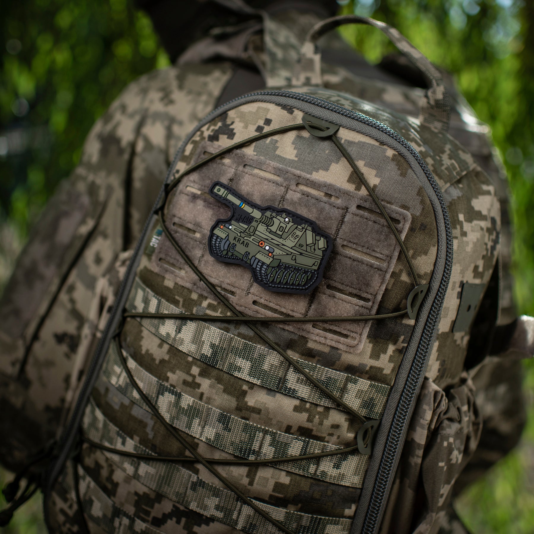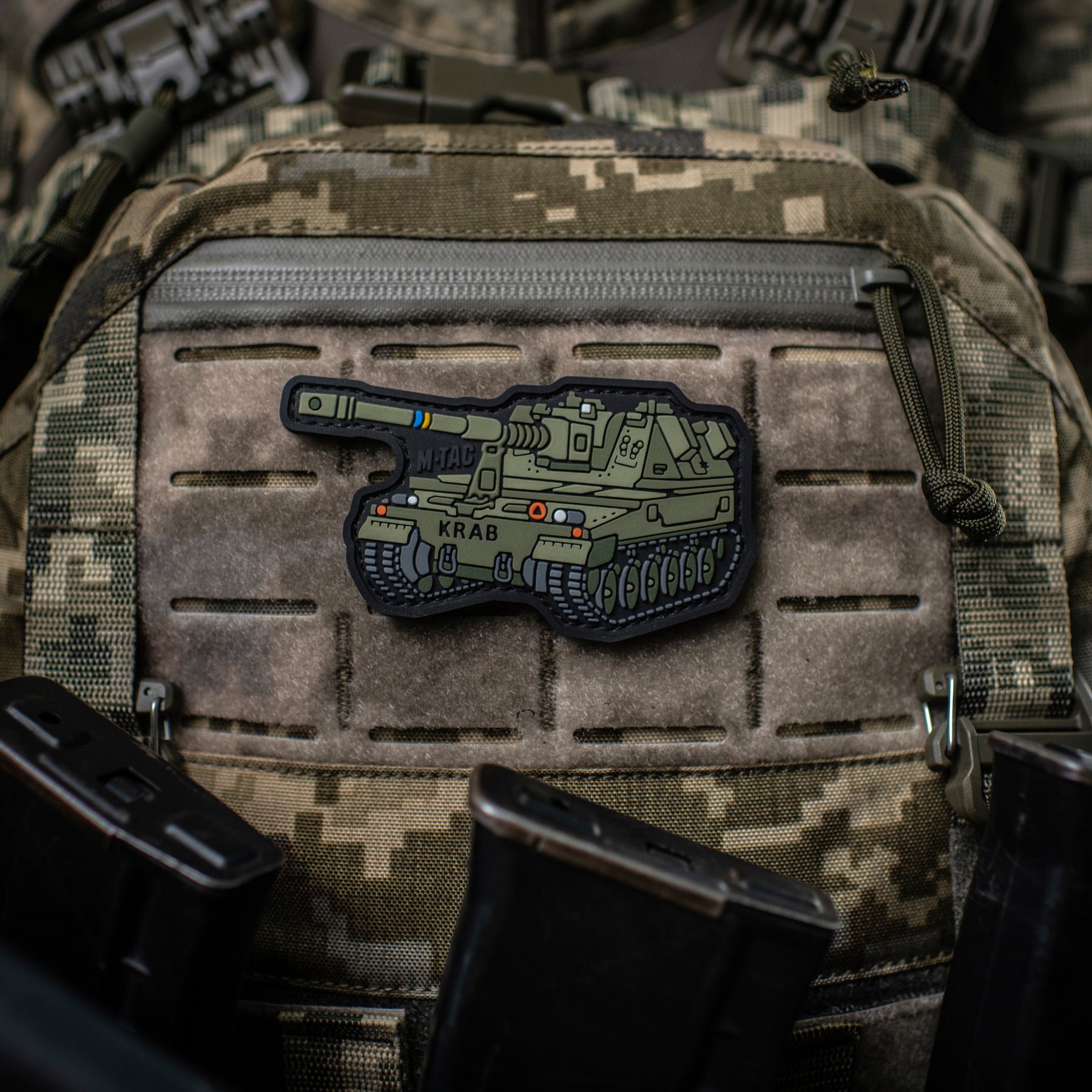 The patch is made in the shape of the self-propelled howitzer AHS KRAB — a powerful armored combat vehicle that effectively “devours” enemy equipment and infantry on the frontline. Due to its mobility and high technical characteristics, the AHS Krab can easily deliver devastating fire on enemy positions and quickly relocate after completing the mission.