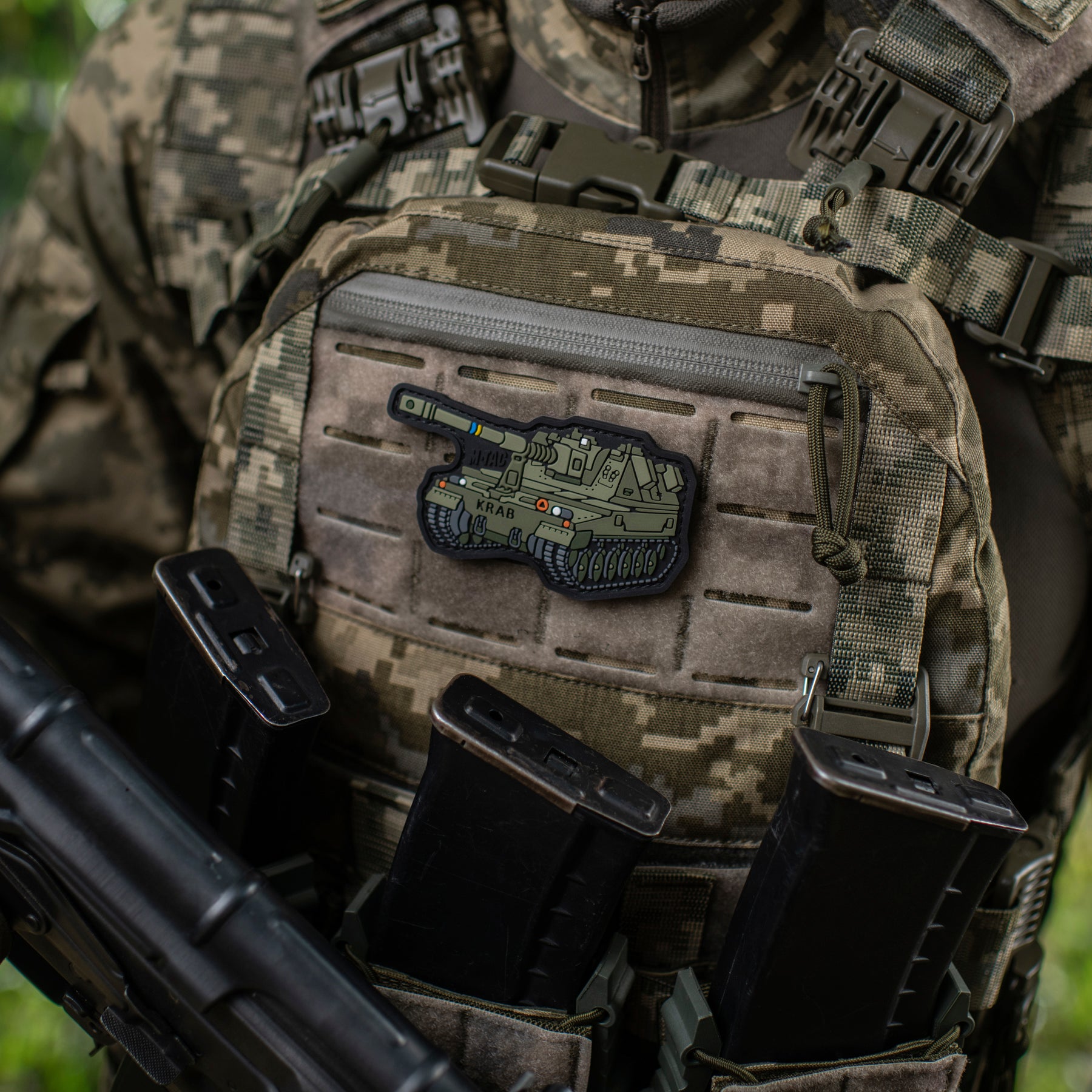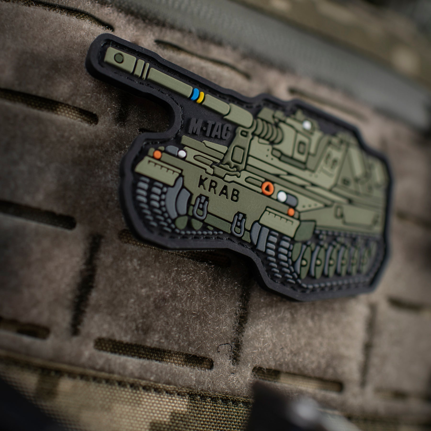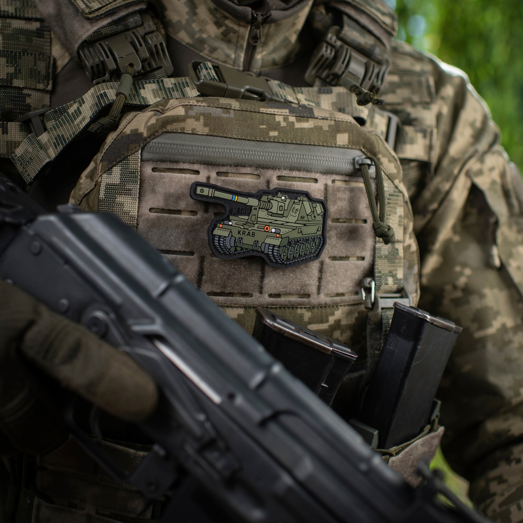 The patch is made in the shape of the self-propelled howitzer AHS KRAB — a powerful armored combat vehicle that effectively “devours” enemy equipment and infantry on the frontline. Due to its mobility and high technical characteristics, the AHS Krab can easily deliver devastating fire on enemy positions and quickly relocate after completing the mission.