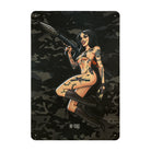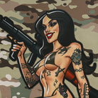 The panel features a charismatic and striking Pin-Up–style girl. Her graceful appearance hides iron determination, while the RPG-7 on her shoulder symbolizes her readiness to enter the fight at any moment. Her body is covered in themed tattoos that reflect her fierce warrior spirit.