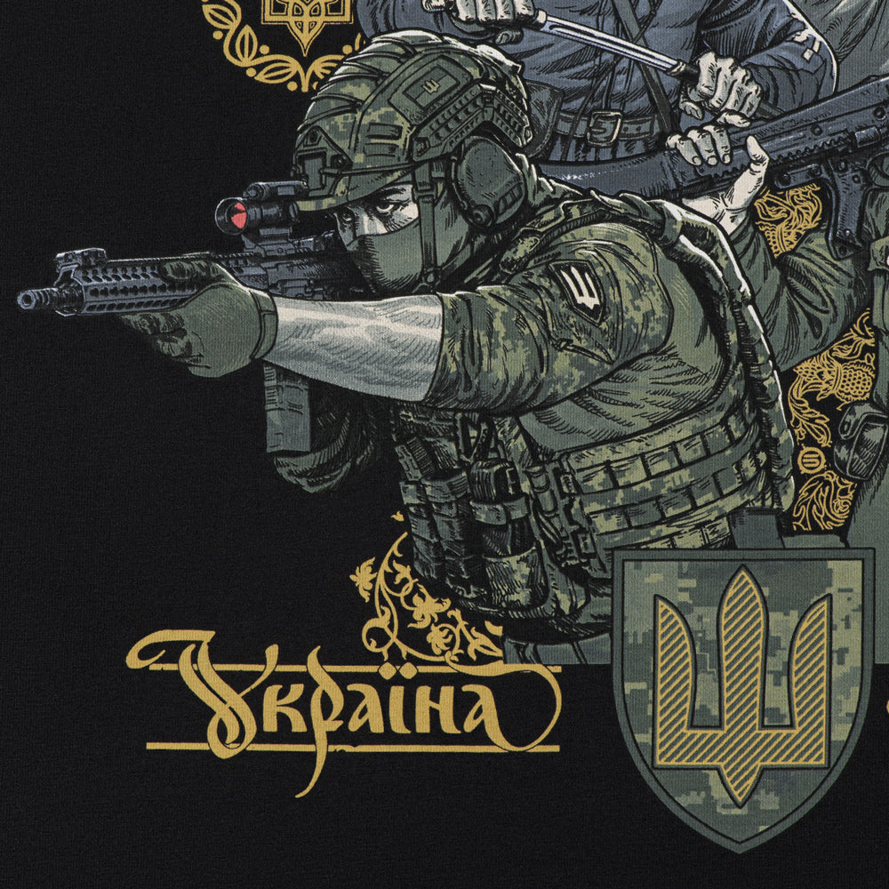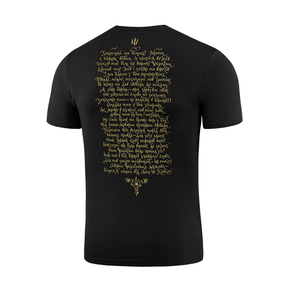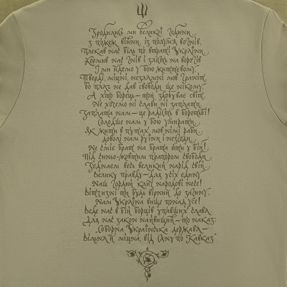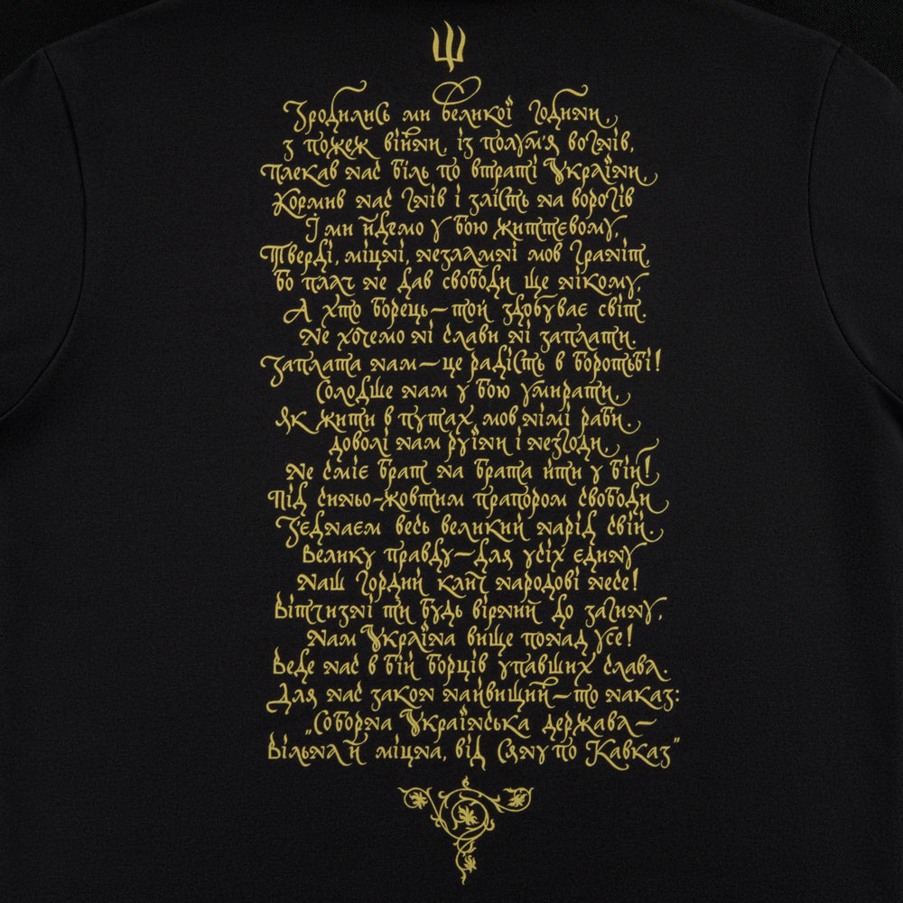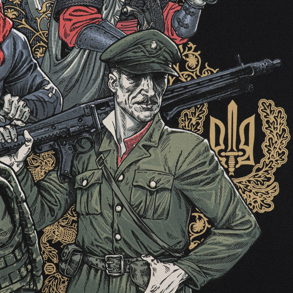 The front graphic features multiple generations of Ukrainian fighters united by one mission — the fight for a free Ukraine. On the back, the shirt displays lines from the “March of Ukrainian Nationalists”, the OUN anthem that has long symbolized the spirit of liberation.