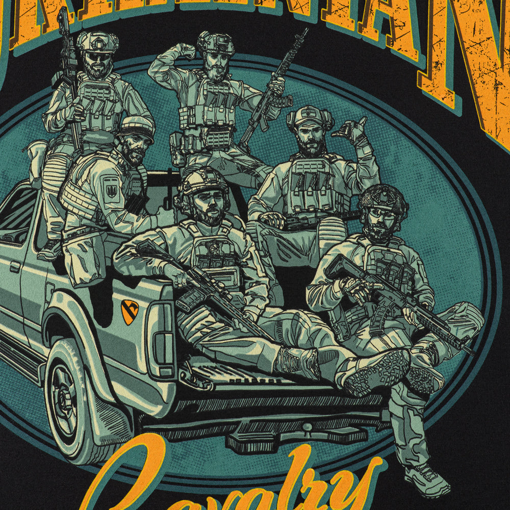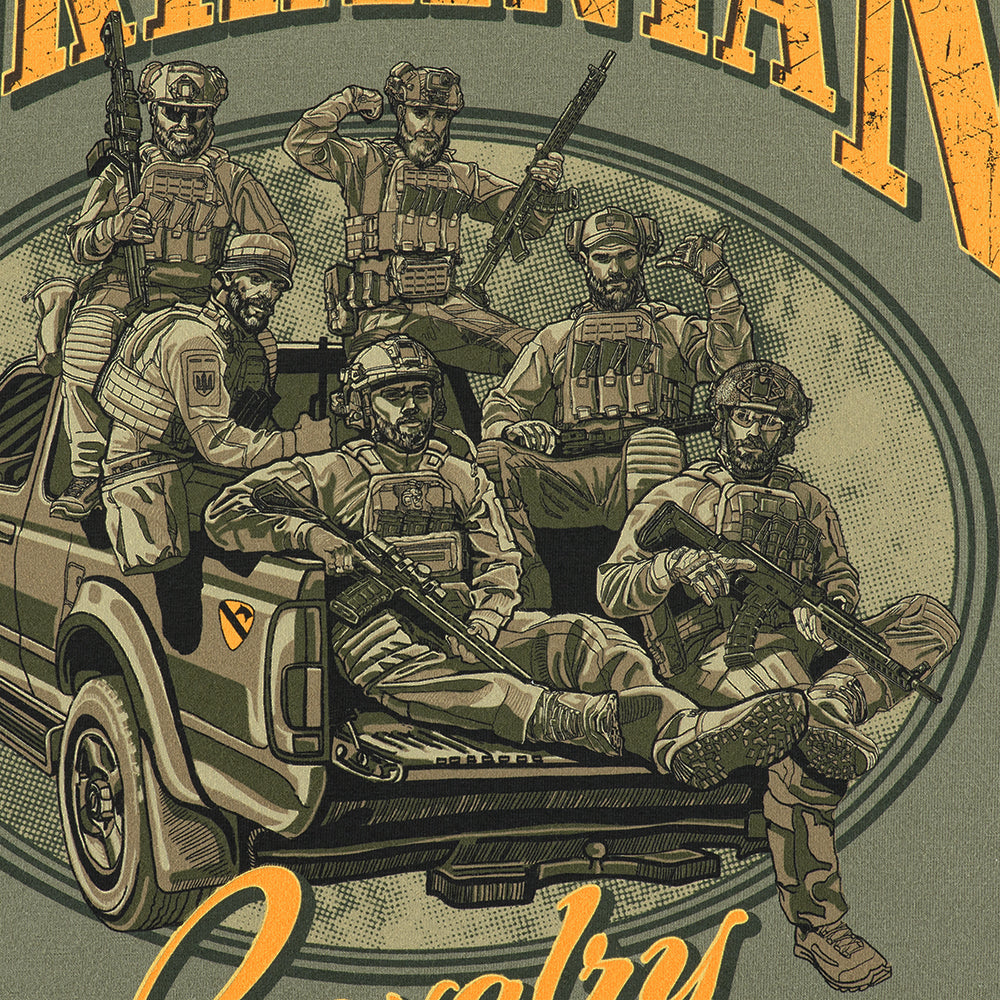The soldiers depicted on the T-shirt are the heirs of a proud legacy, a powerful force in today’s fiercest combat operations. The decal on their steel “mount,” inspired by the shoulder patch of the U.S. 1st Cavalry Division, symbolically reflects the unbreakable connection between past and present.