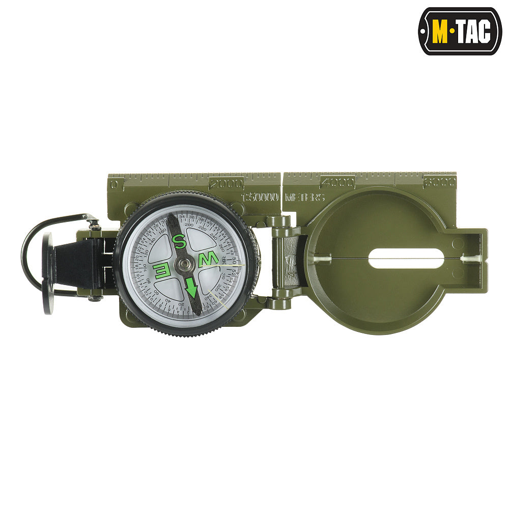 This M-Tac compass features a durable folding aluminum frame (which includes the cover with a sighting wire and the base housing the rotating capsule with the dial and needle). The frame is used to accurately set the azimuth. To take an azimuth reading, align the long side of the compass with your landmark, rotate the dial capsule until the magnetic North arrow aligns with the North marking on the dial. The numerical azimuth value is then read at the mark on the end of the frame facing the landmark.