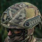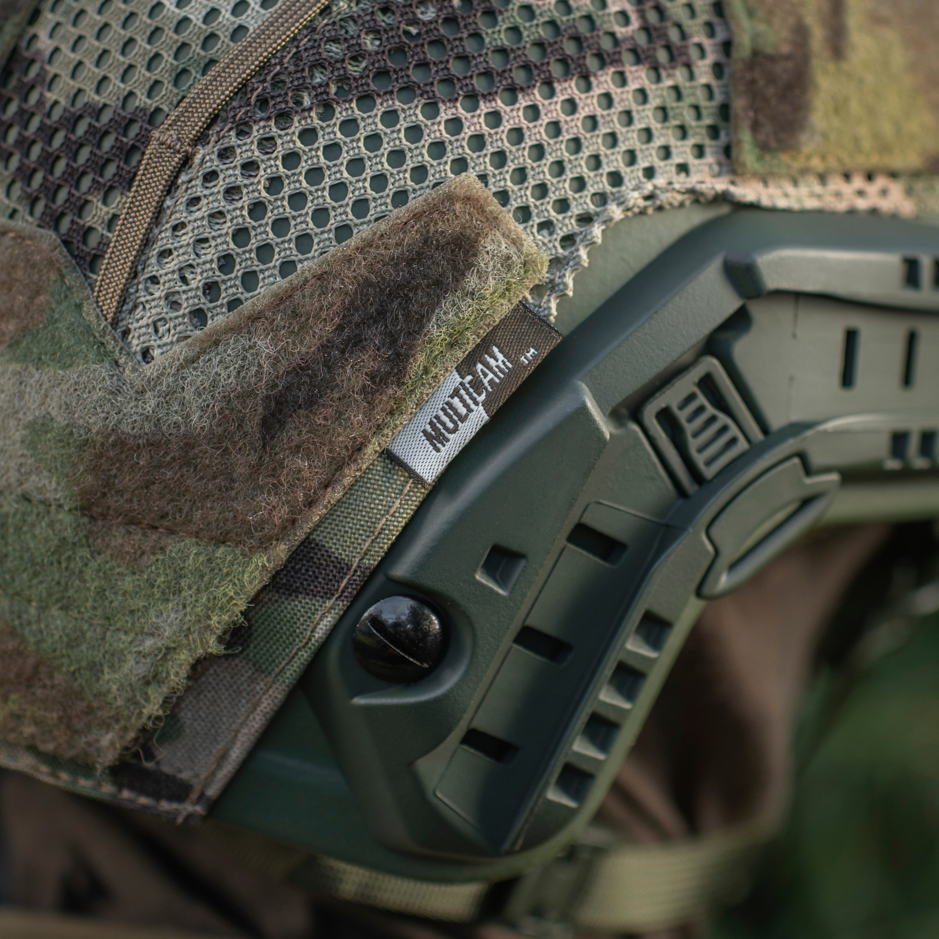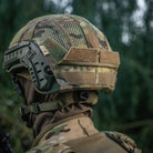 A crucial feature of this design is the integrated cutouts, which provide unhindered access to the NVG (Night Vision Goggle) mount on the helmet shroud. The cover is easily secured to the helmet and is equipped with Hook-and-Loop (Velcro) panels strategically placed on the sides, rear, and top. These panels are perfect for attaching identifiers, strobe lights, and various morale patches. Specialized webbing strips running along the cover allow for convenient routing of cables or the addition of extra camouflage elements.