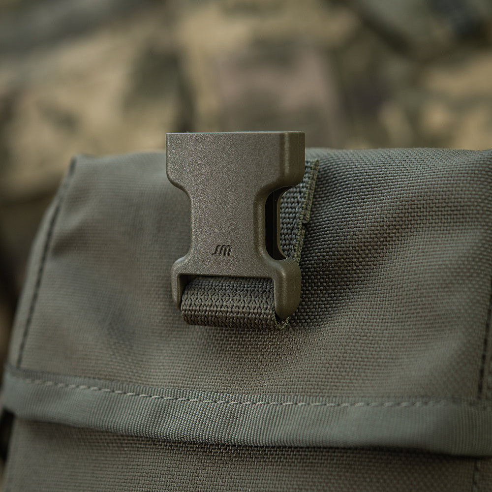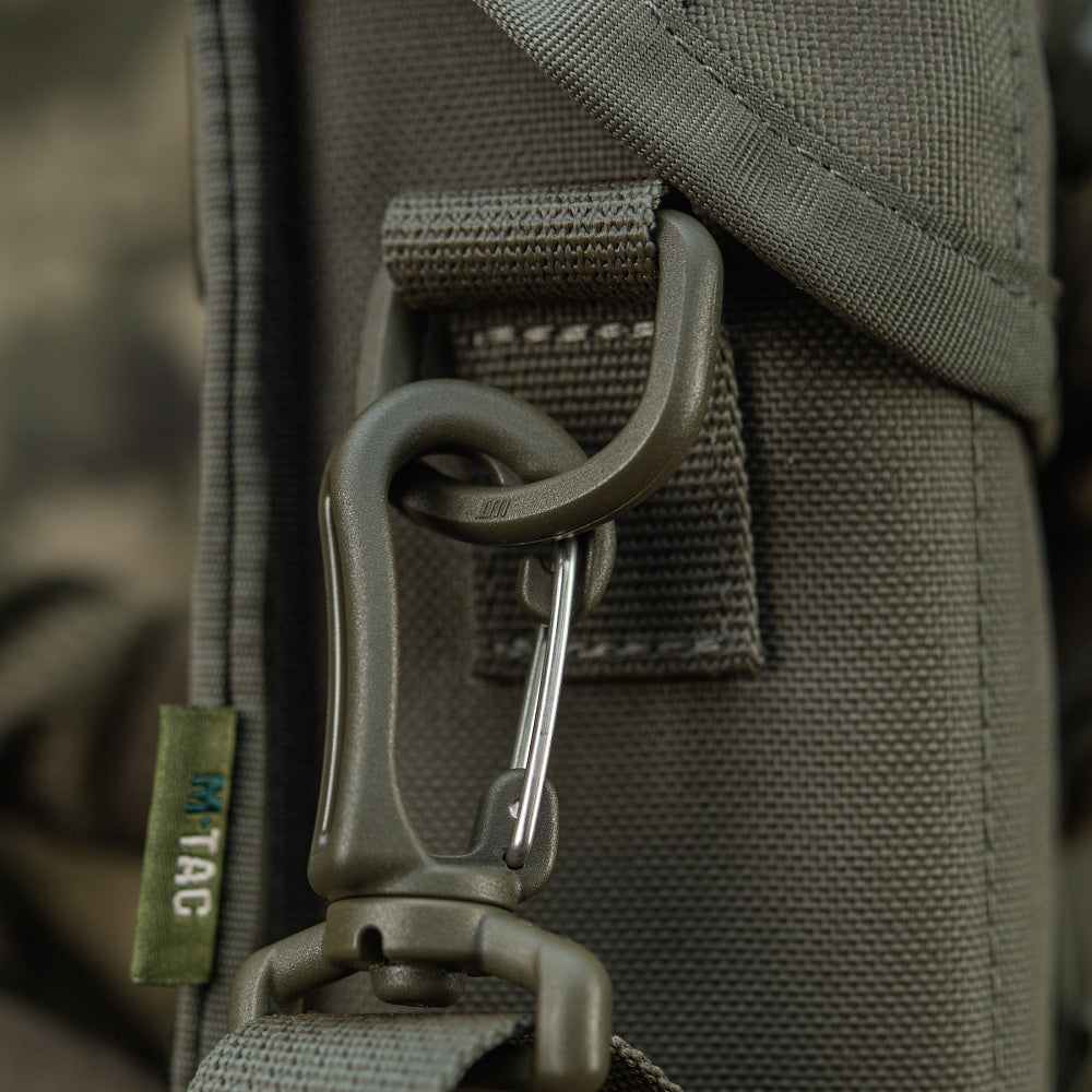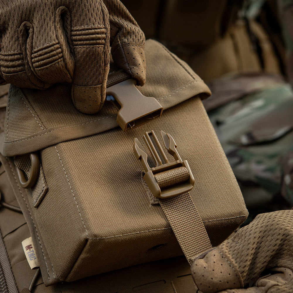 The pouch attaches to equipment via a MOLLE interface. With the included detachable strap, it can also be worn crossbody or over the shoulder.