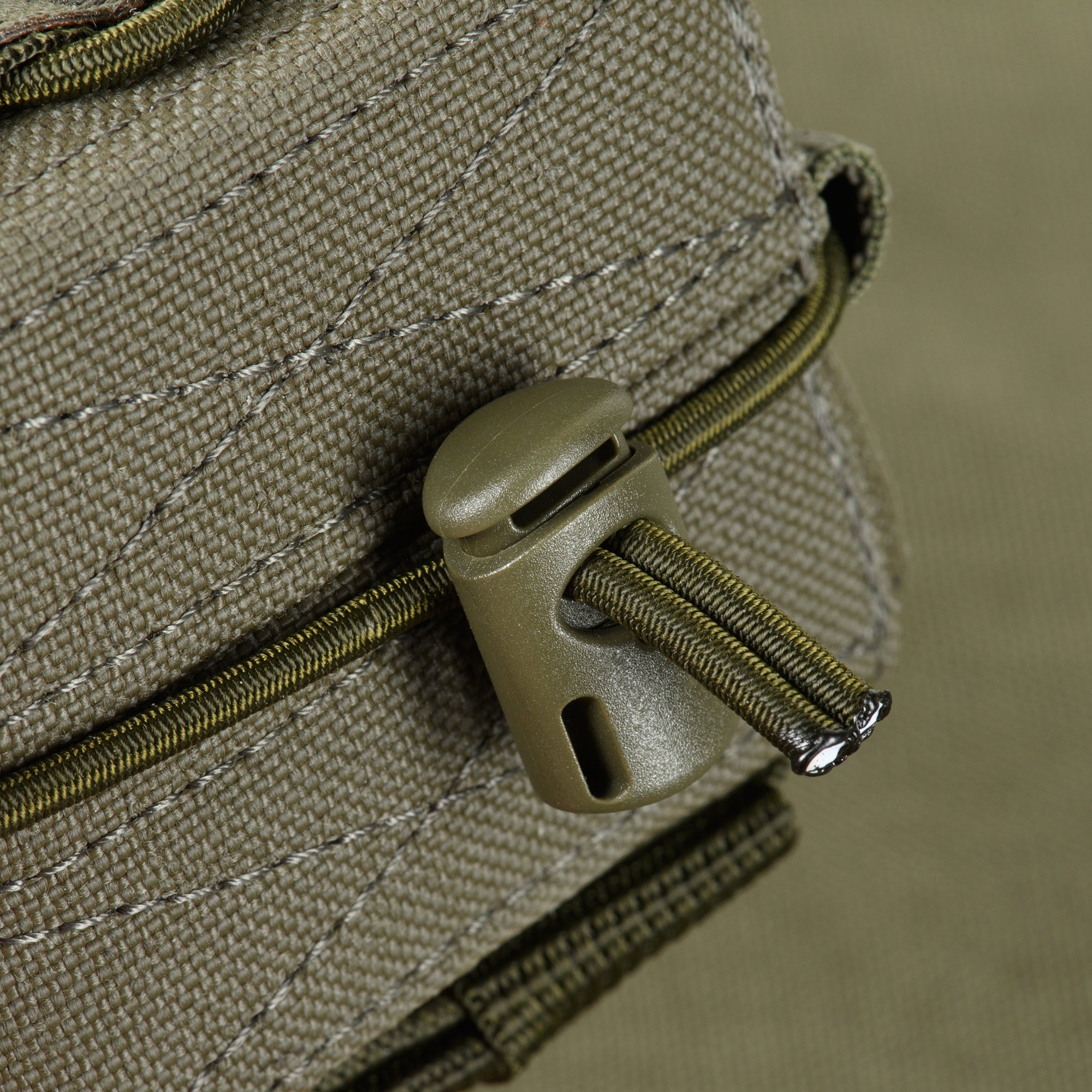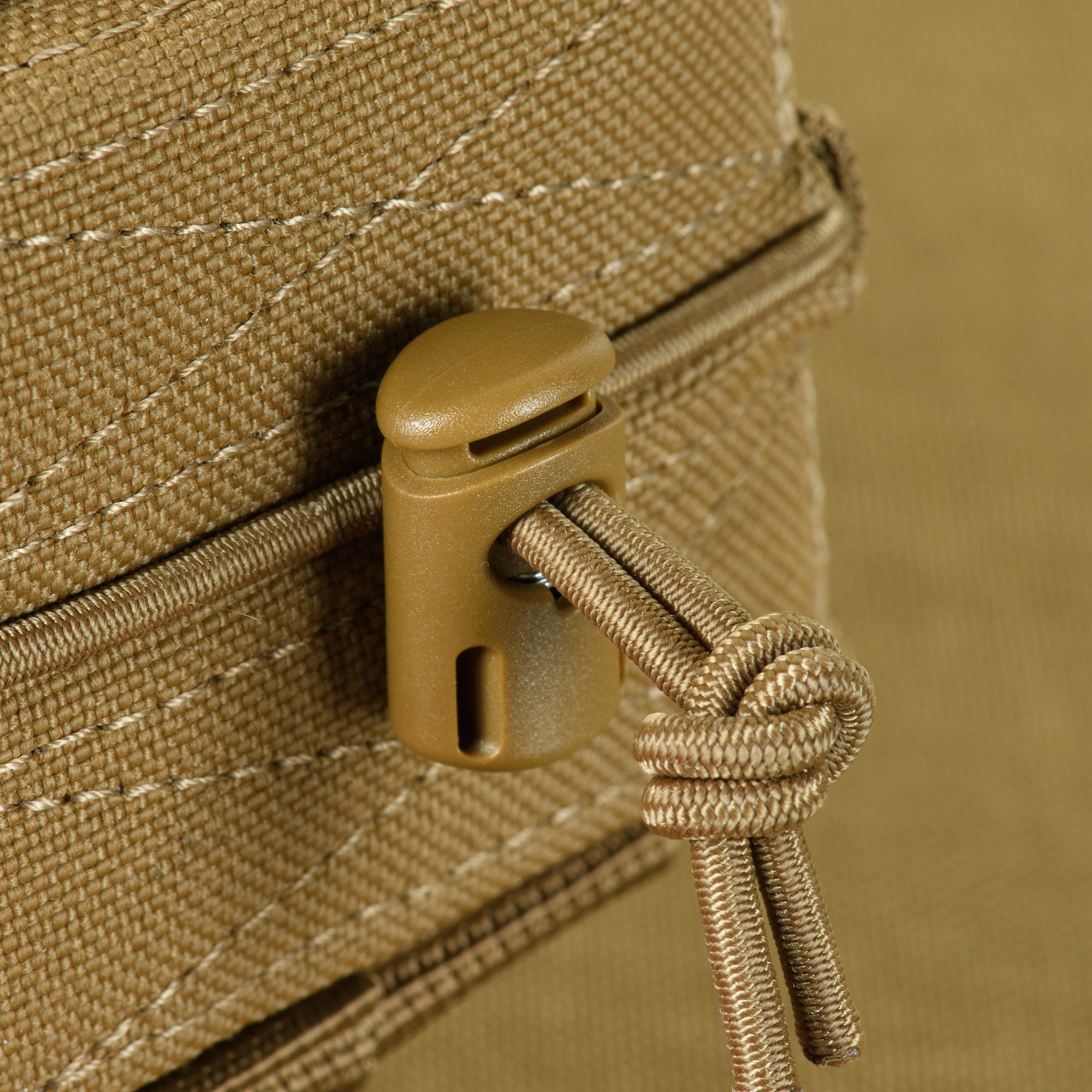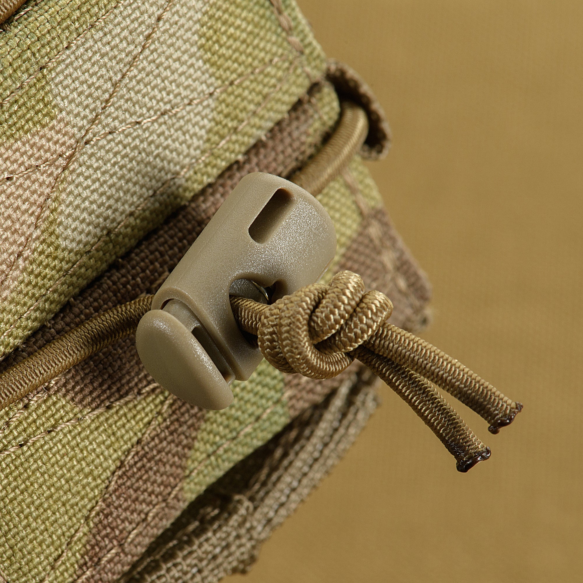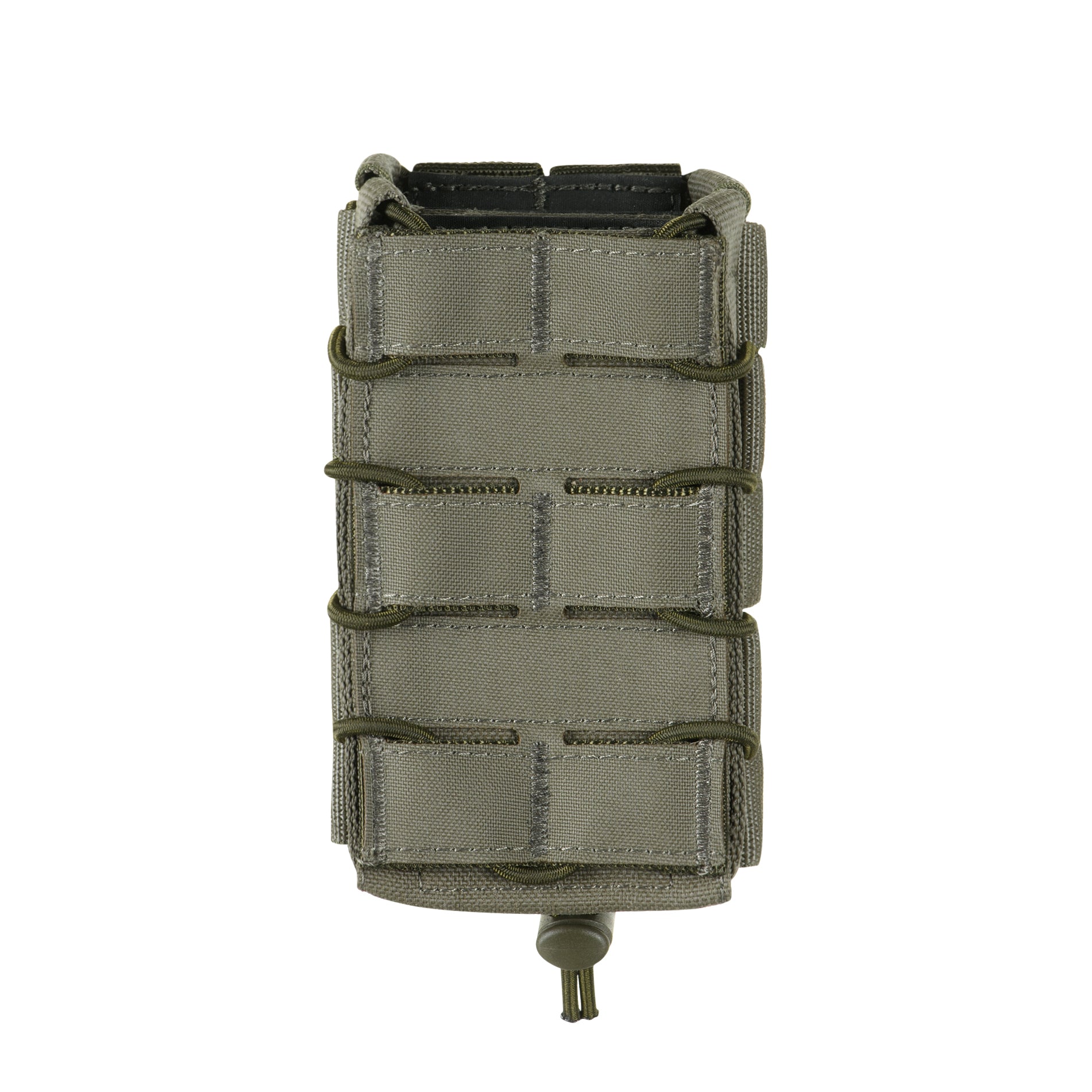 It attaches to gear using the MOLLE system. The pouch volume is adjustable with an elastic cord and a stopper located at the bottom of the pouch.