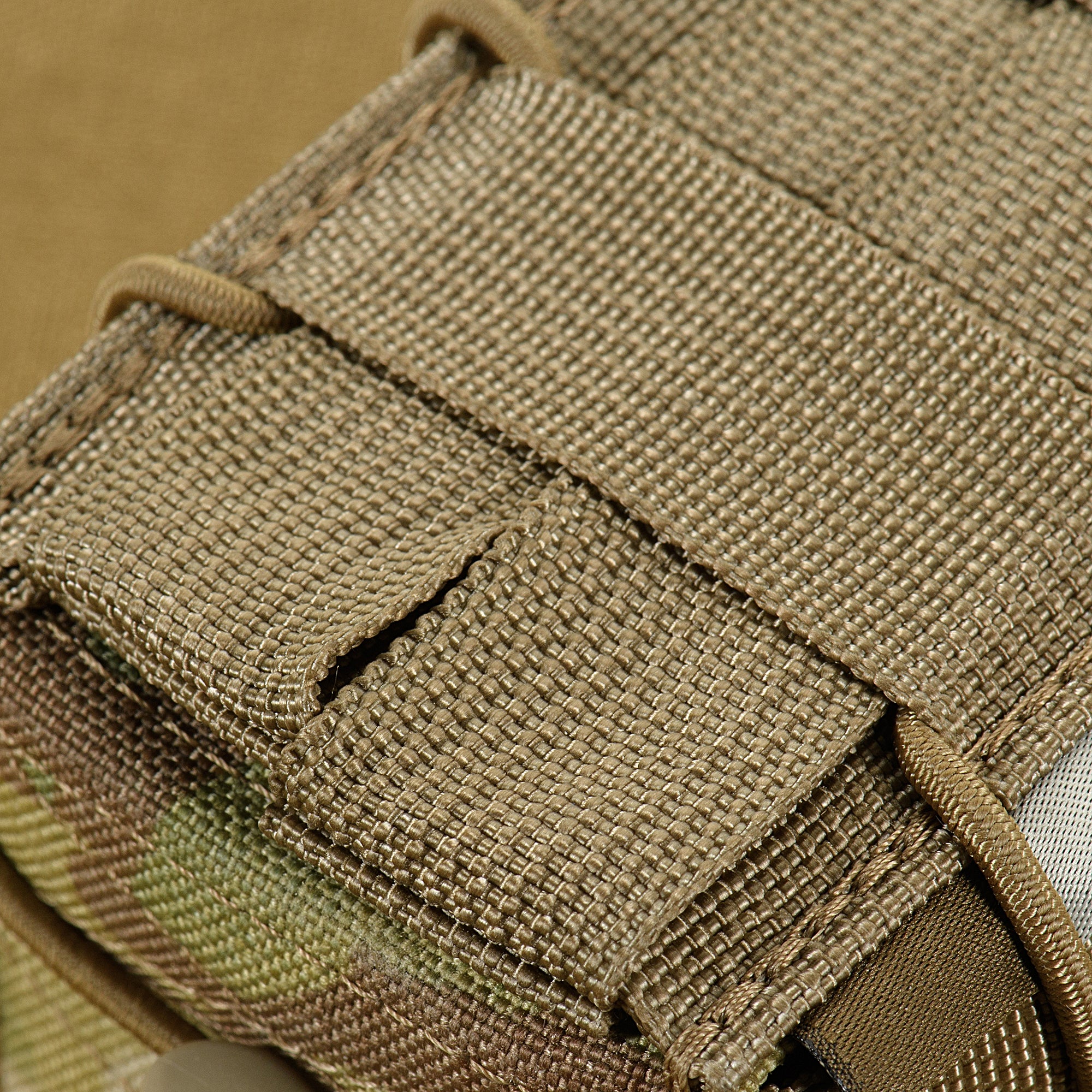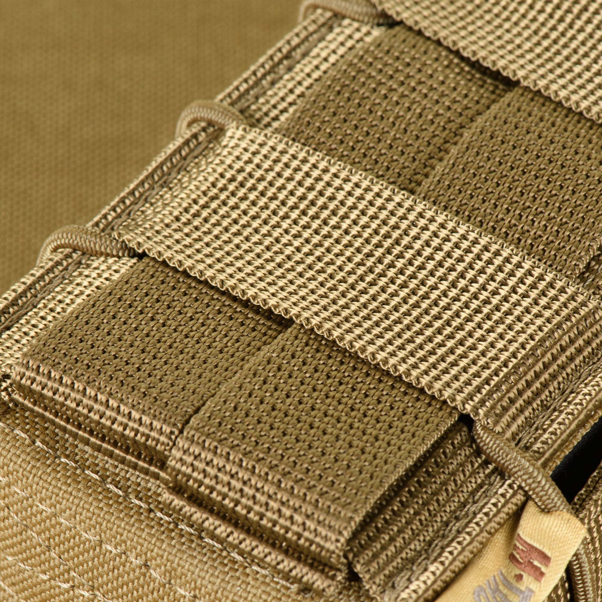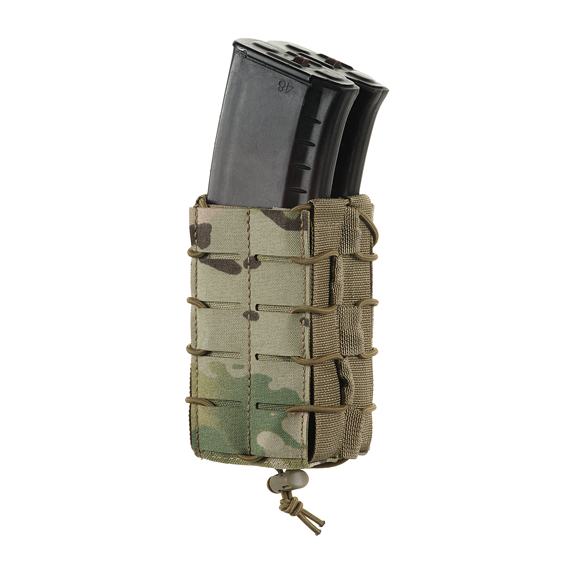 The pouch is designed to hold two AR or AK-type magazines. Its thoughtful shape provides secure retention and prevents magazines from falling out during active movement. The front MOLLE interface, made with Laser Cut technology, enables attachment of additional gear. Nylon webbing on the side walls ensures smooth magazine extraction.