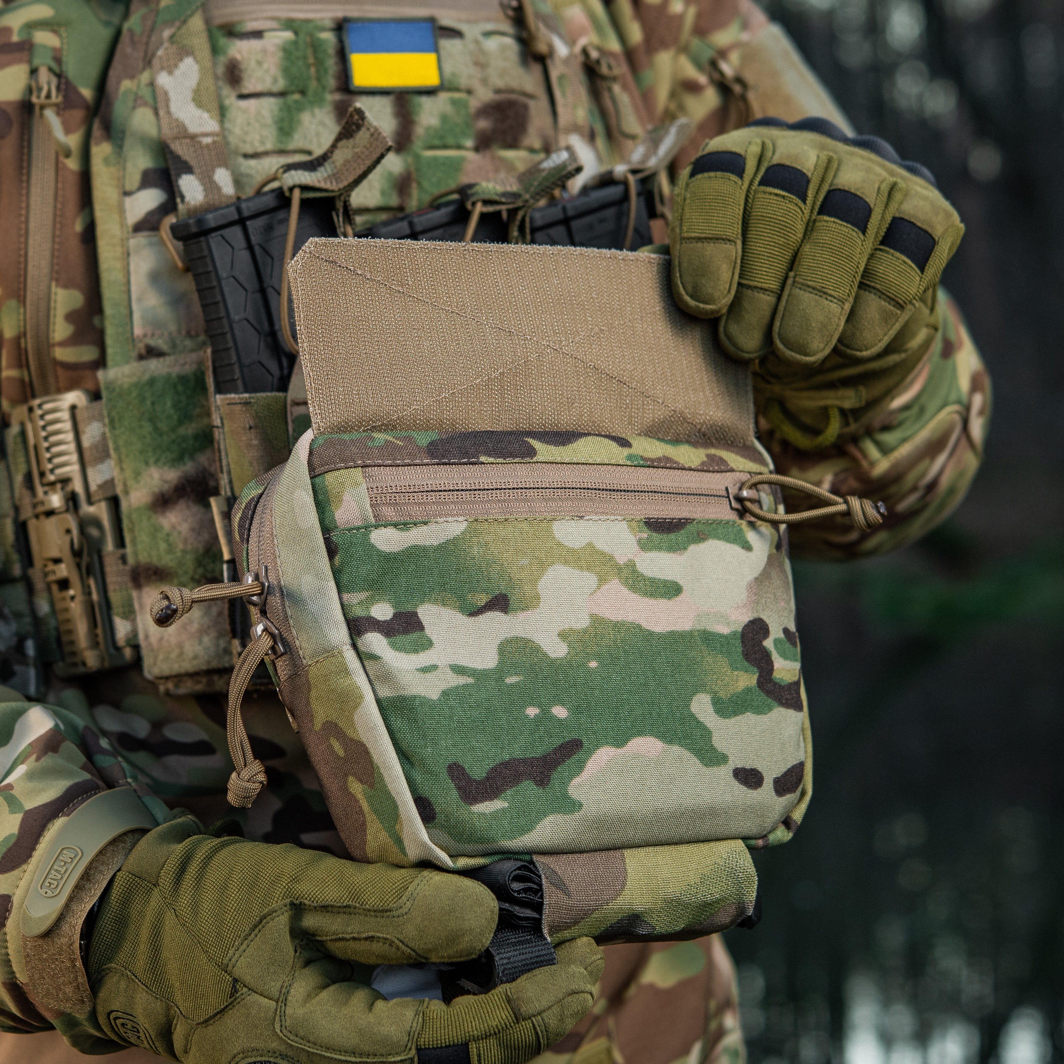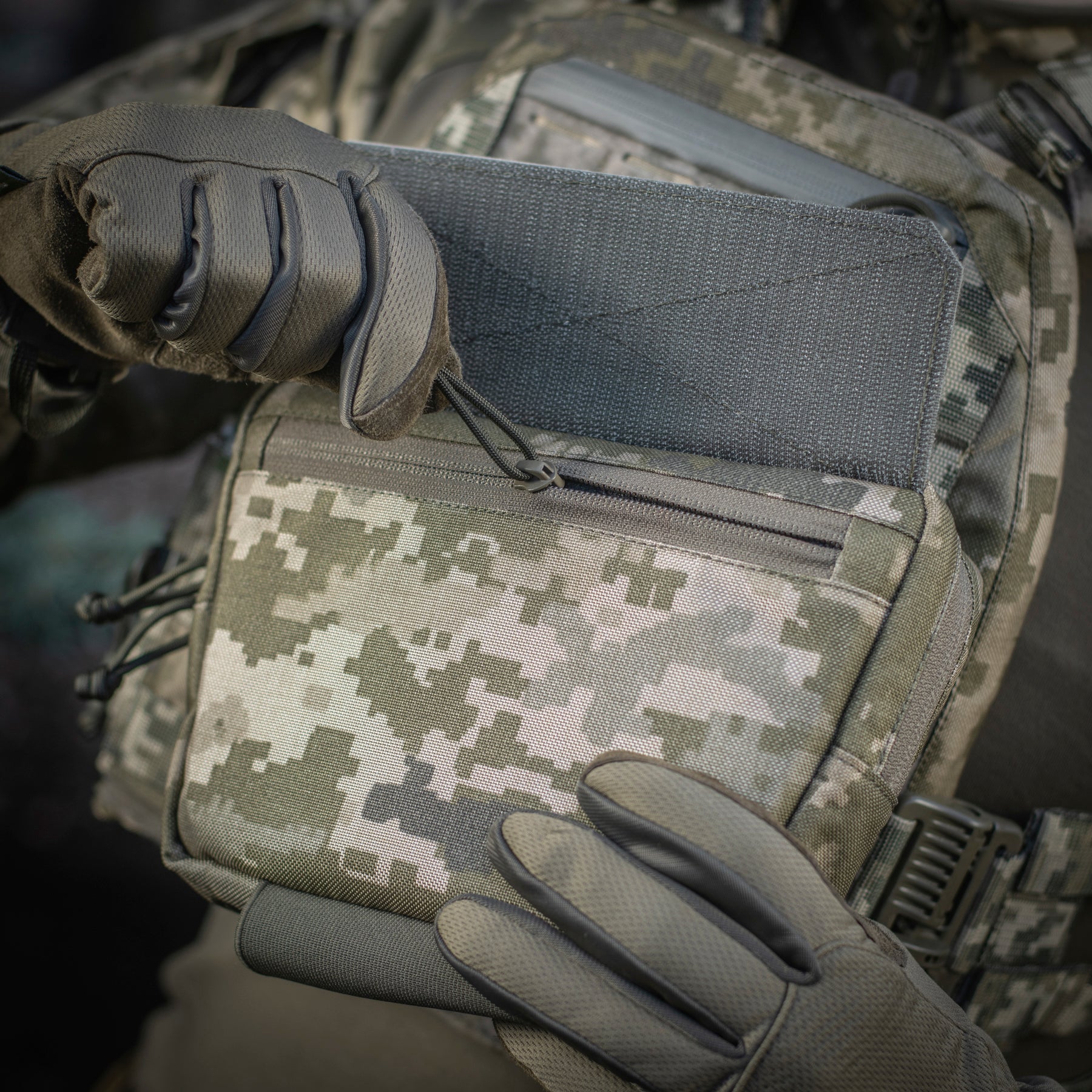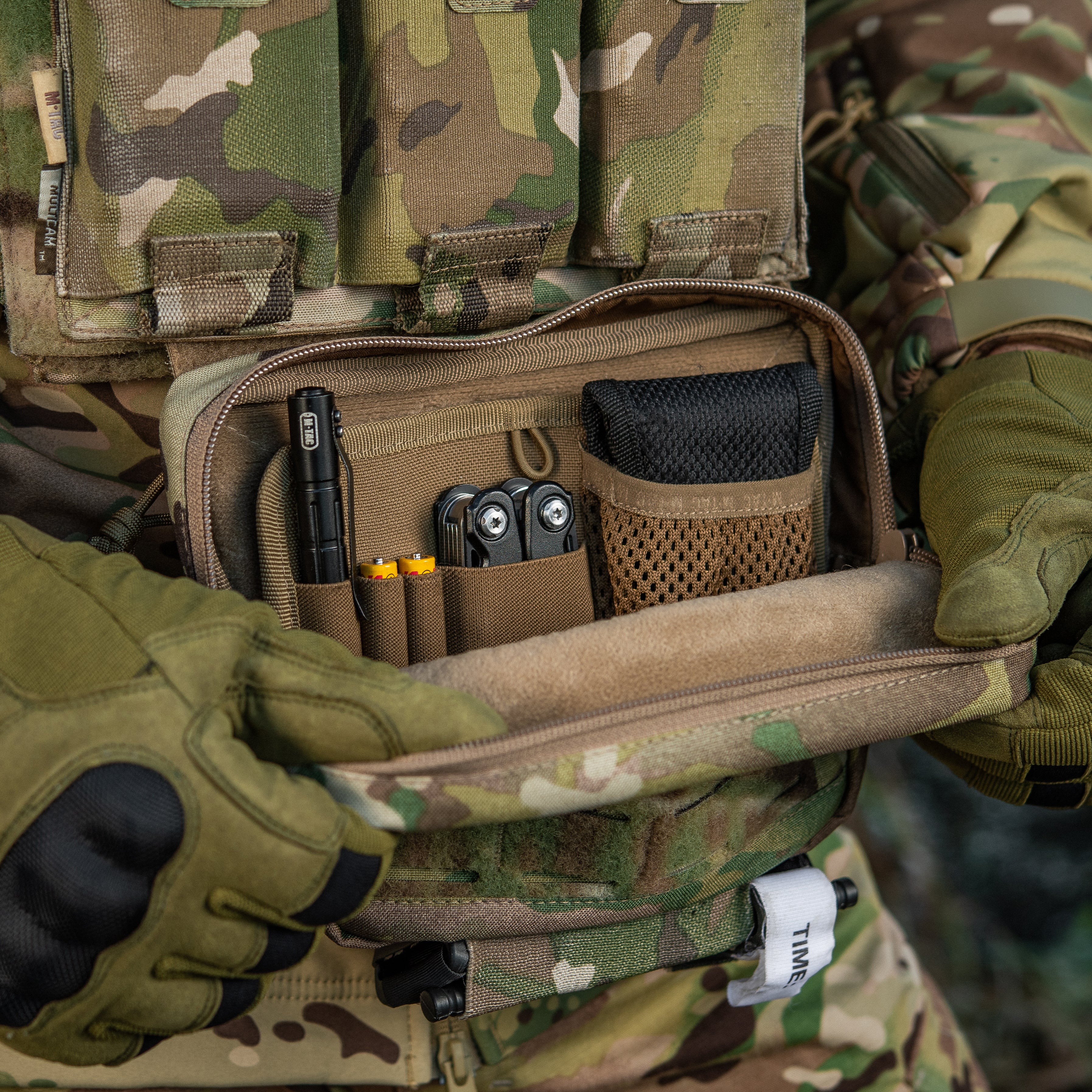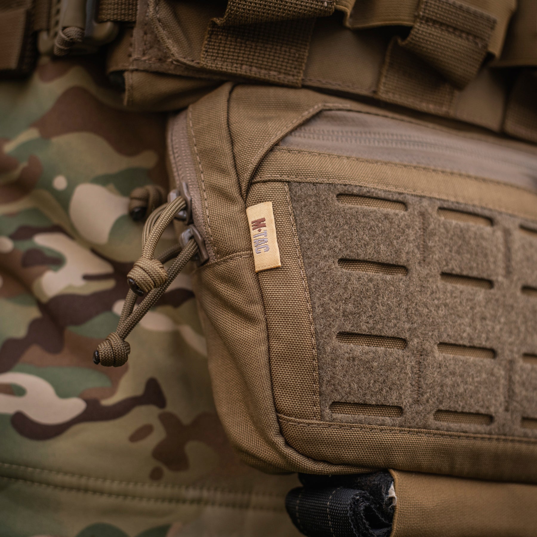 The Hanger Pouch includes three compartments for storing essential items. On the front, there’s a LaserCut loop panel for attaching patches or additional gear. The rear compartment can also accommodate an M-Tac ballistic insert - not included. Additionally, an elastic holder for a tourniquet is integrated into the bottom of the bag.