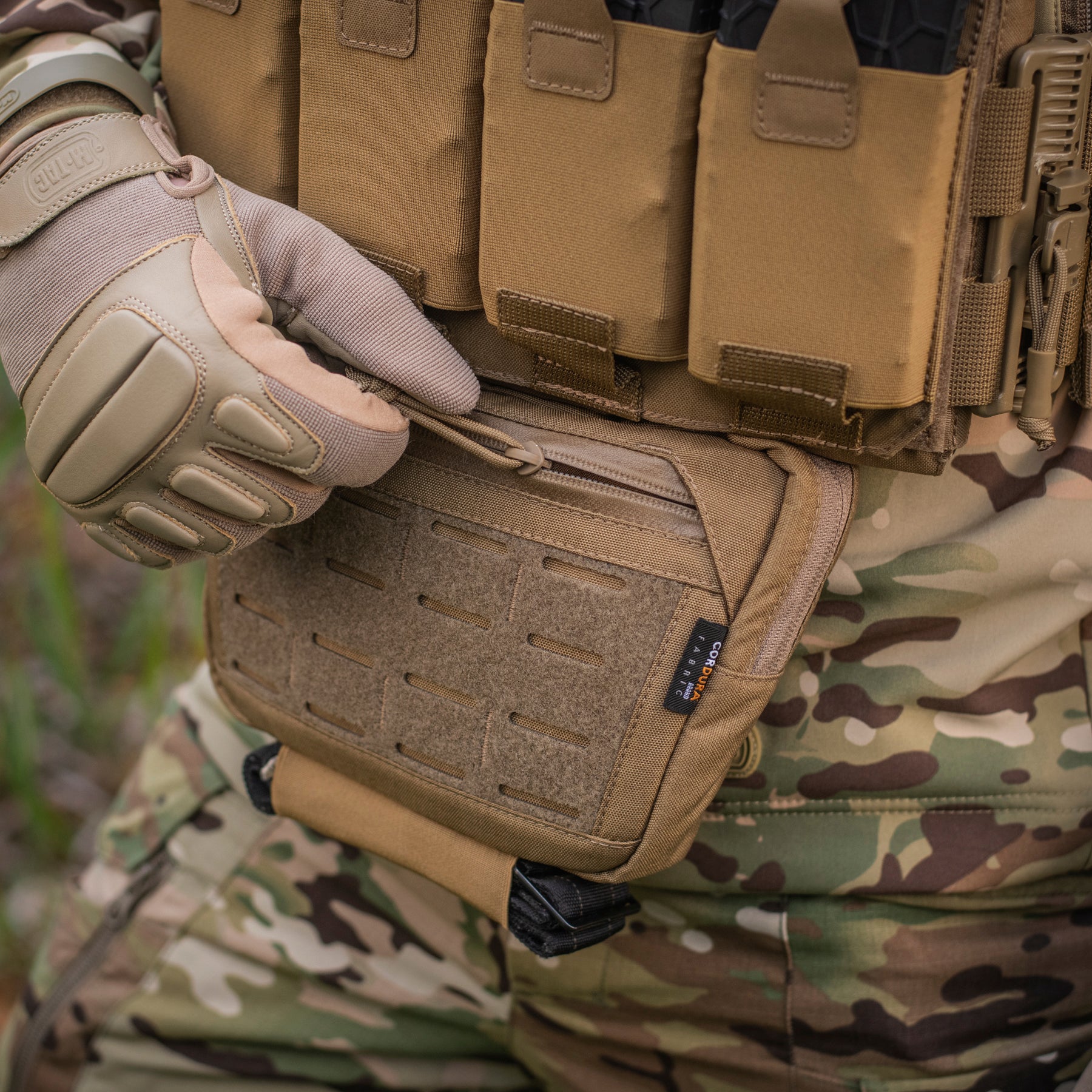 This model features a full-length VELCRO® Brand hook-and-loop panel designed to attach to the frontal loop surface under the flap of a plate carrier or body armor, thus expanding its overall functionality.
