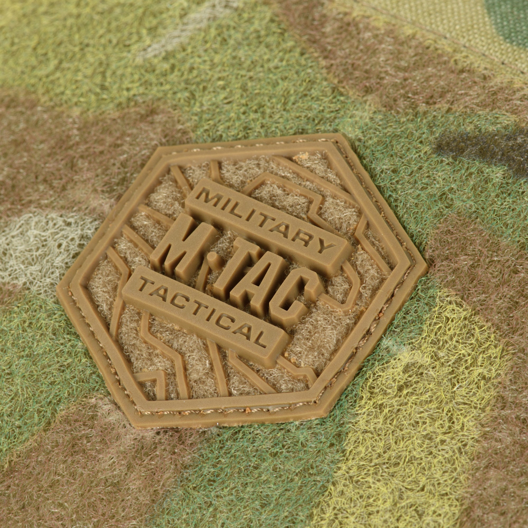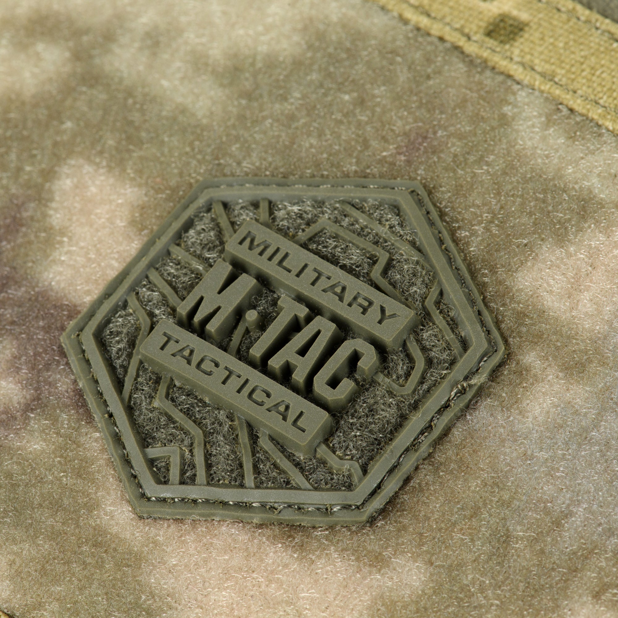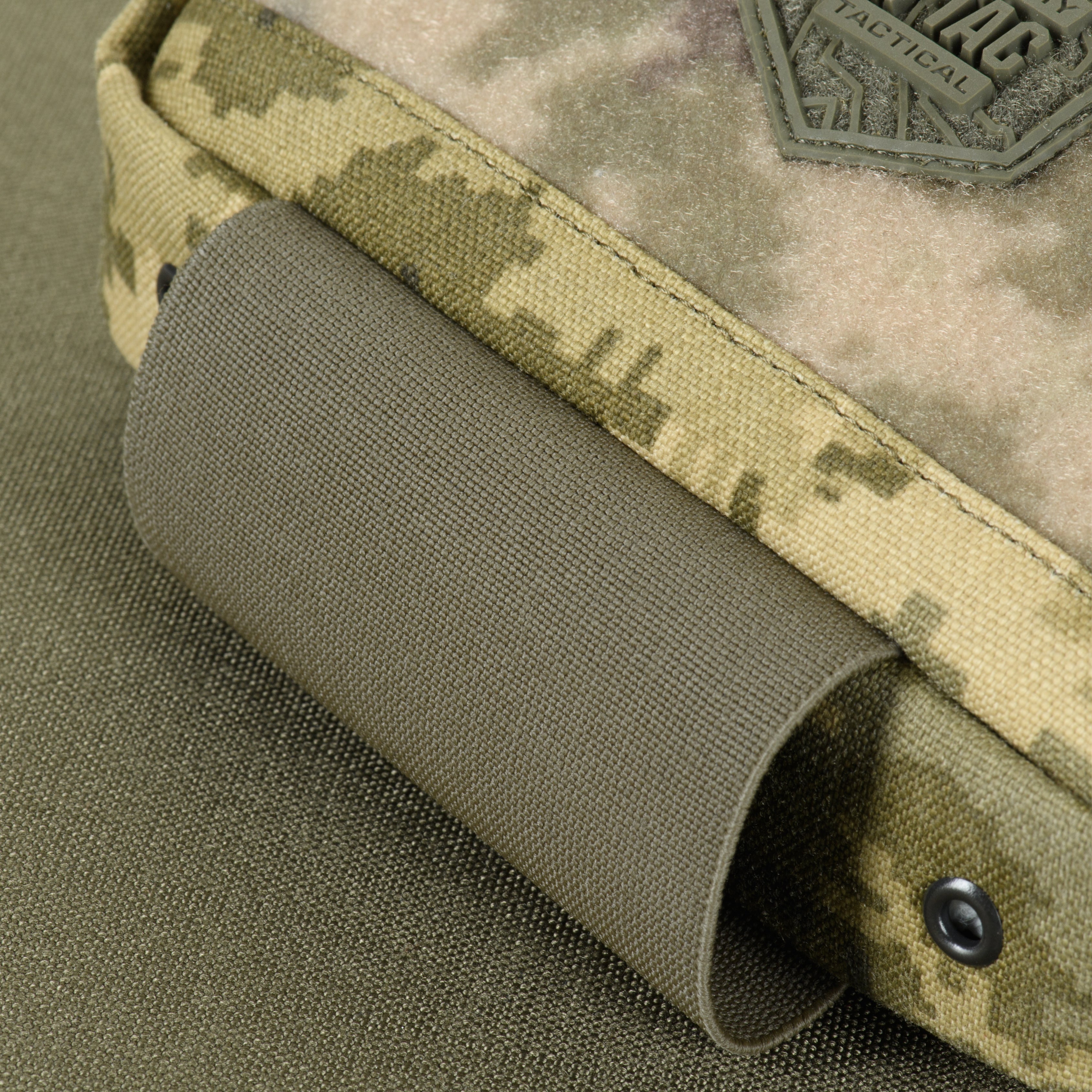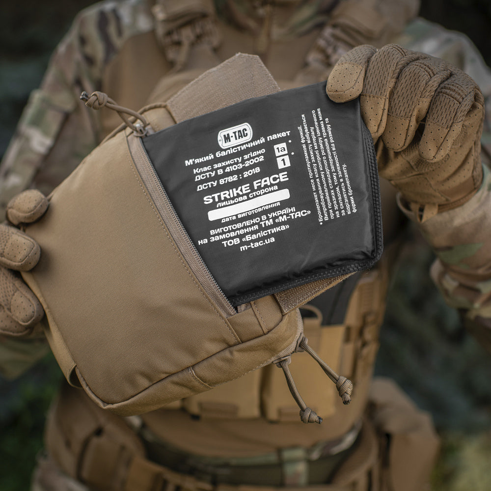The lower bag includes three compartments for organizing essential items. The front features a Velcro panel with a signature M-Tac hexagon logo. The rear section accommodates an M-Tac Class 1A ballistic package (not included), adding optional ballistic protection. An elastic tourniquet holder is integrated at the bottom for quick emergency access.