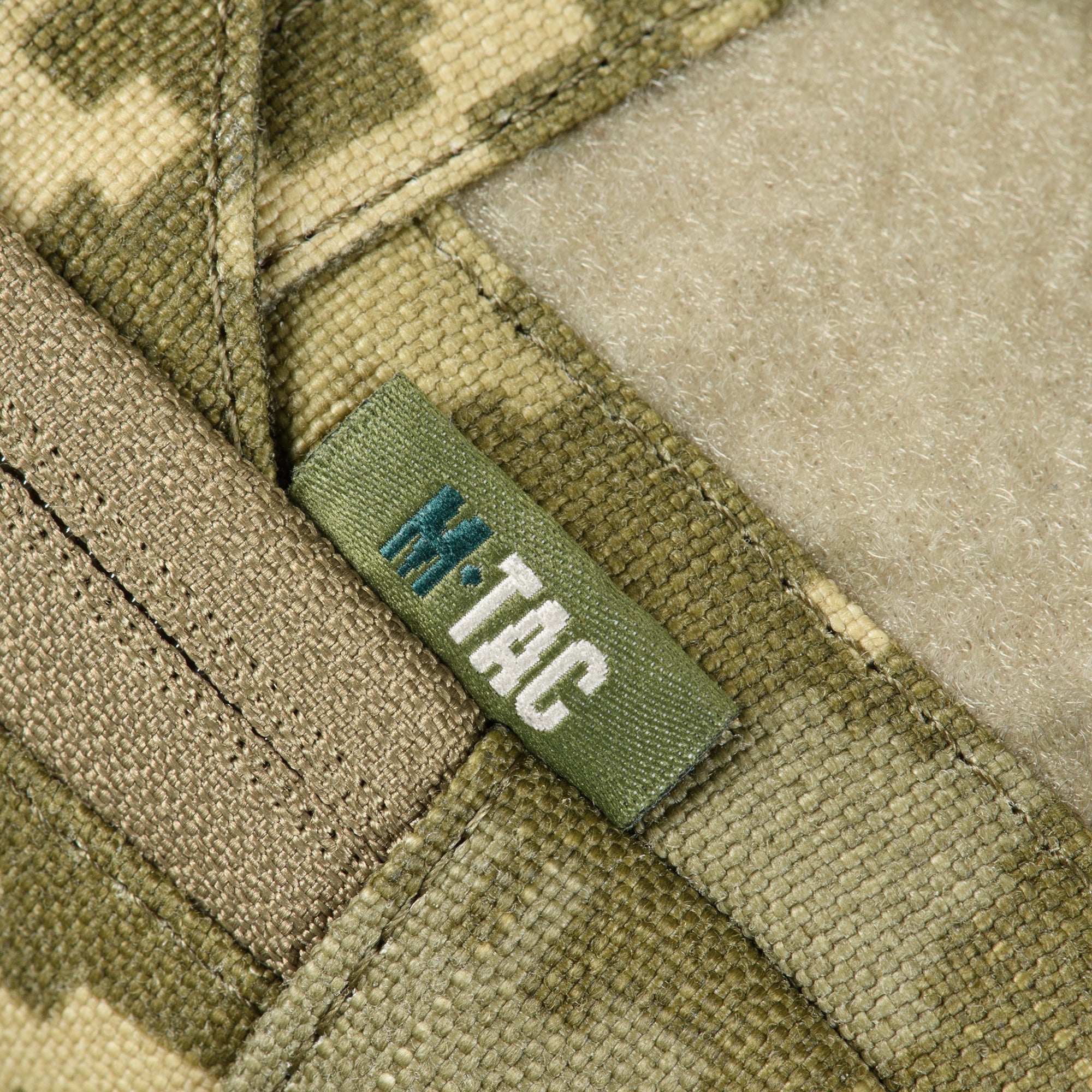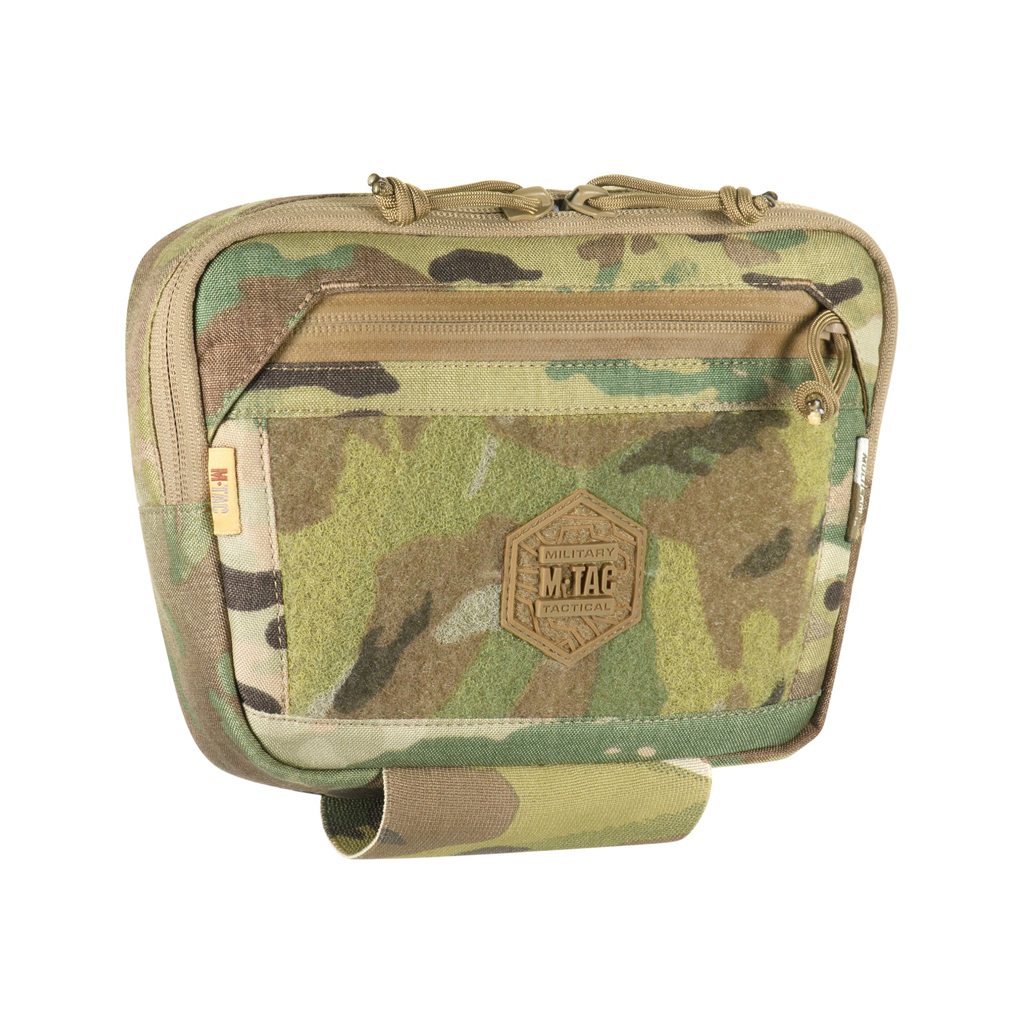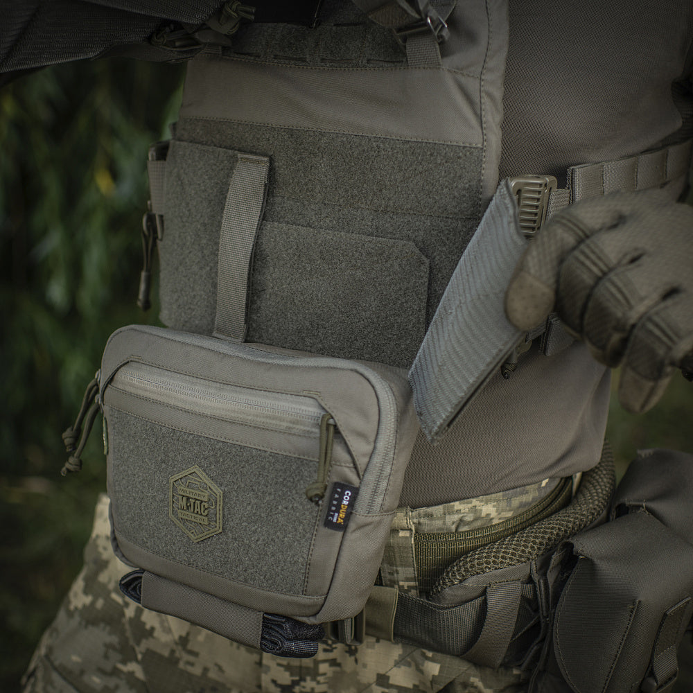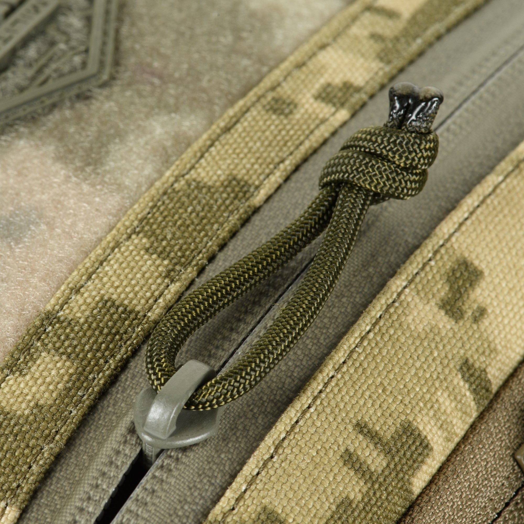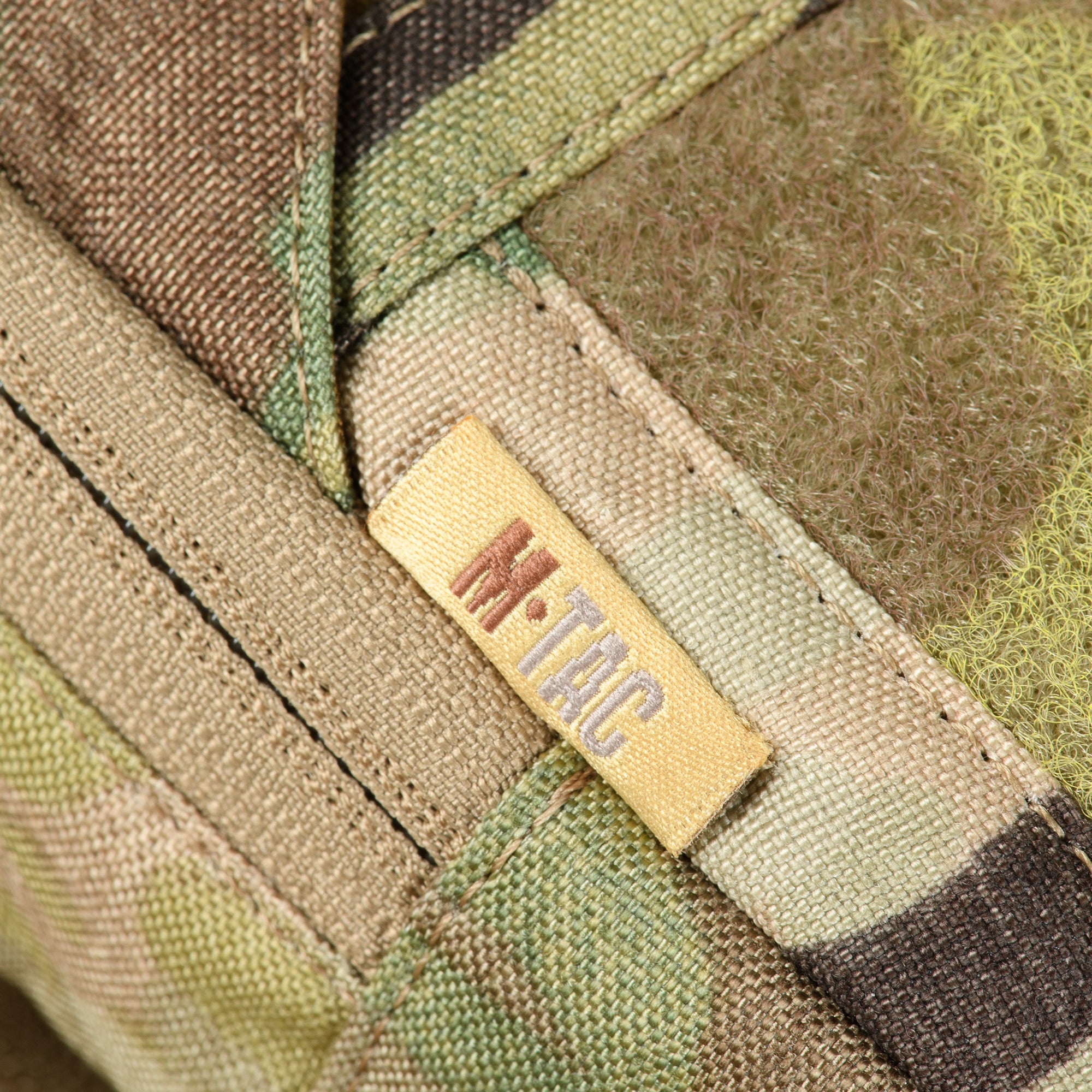 The lower bag includes three compartments for organizing essential items. The front features a VELCRO® Brand panel with a signature M-Tac hexagon logo. The rear section accommodates an M-Tac Class 1A ballistic package (not included), adding optional ballistic protection. An elastic tourniquet holder is integrated at the bottom for quick emergency access.