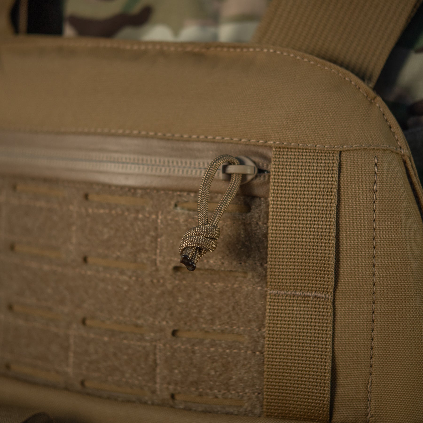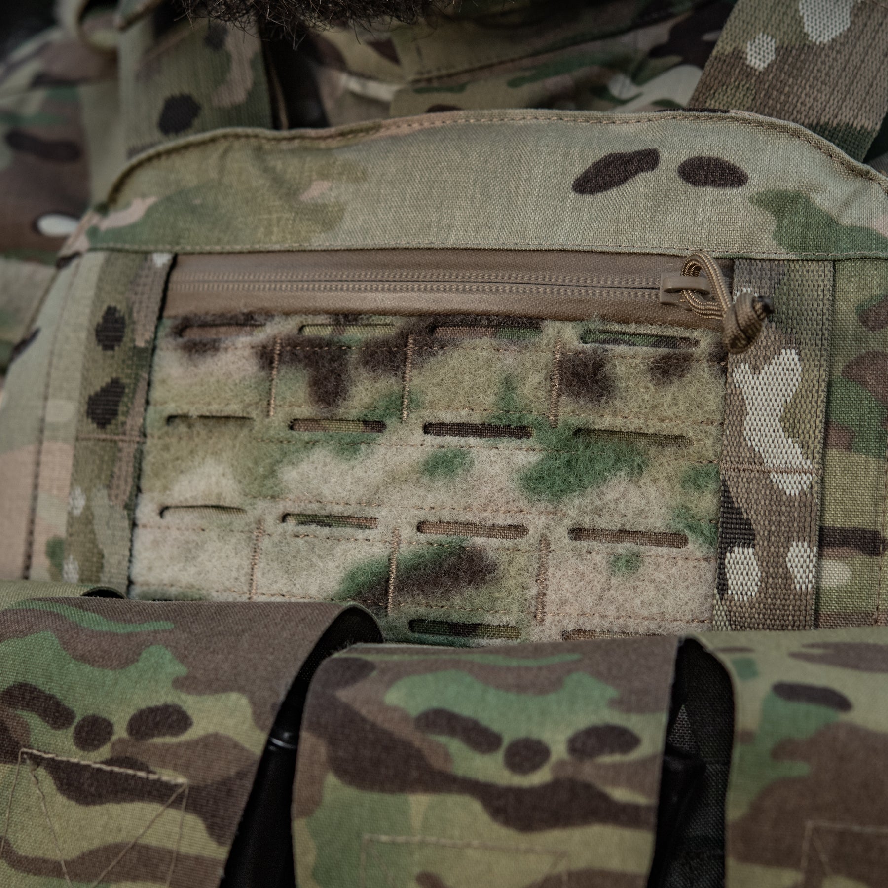 The top of the carrier features a small administrative pocket secured with a water-resistant AquaGuard zipper, suitable for storing ID cards, permits, or similar-sized items. A Velcro panel with slits allows you to attach your favorite patches or other MOLLE-compatible gear.
