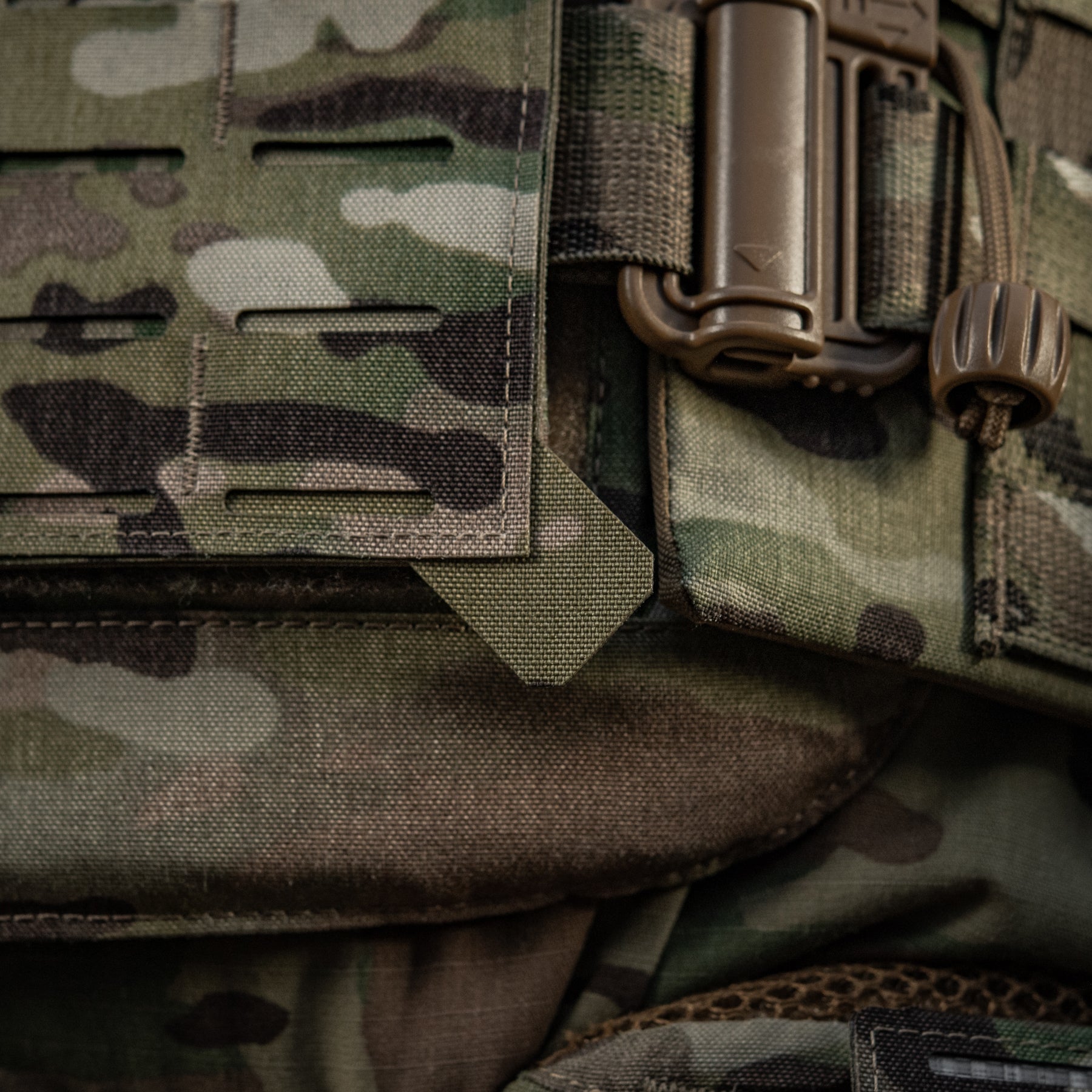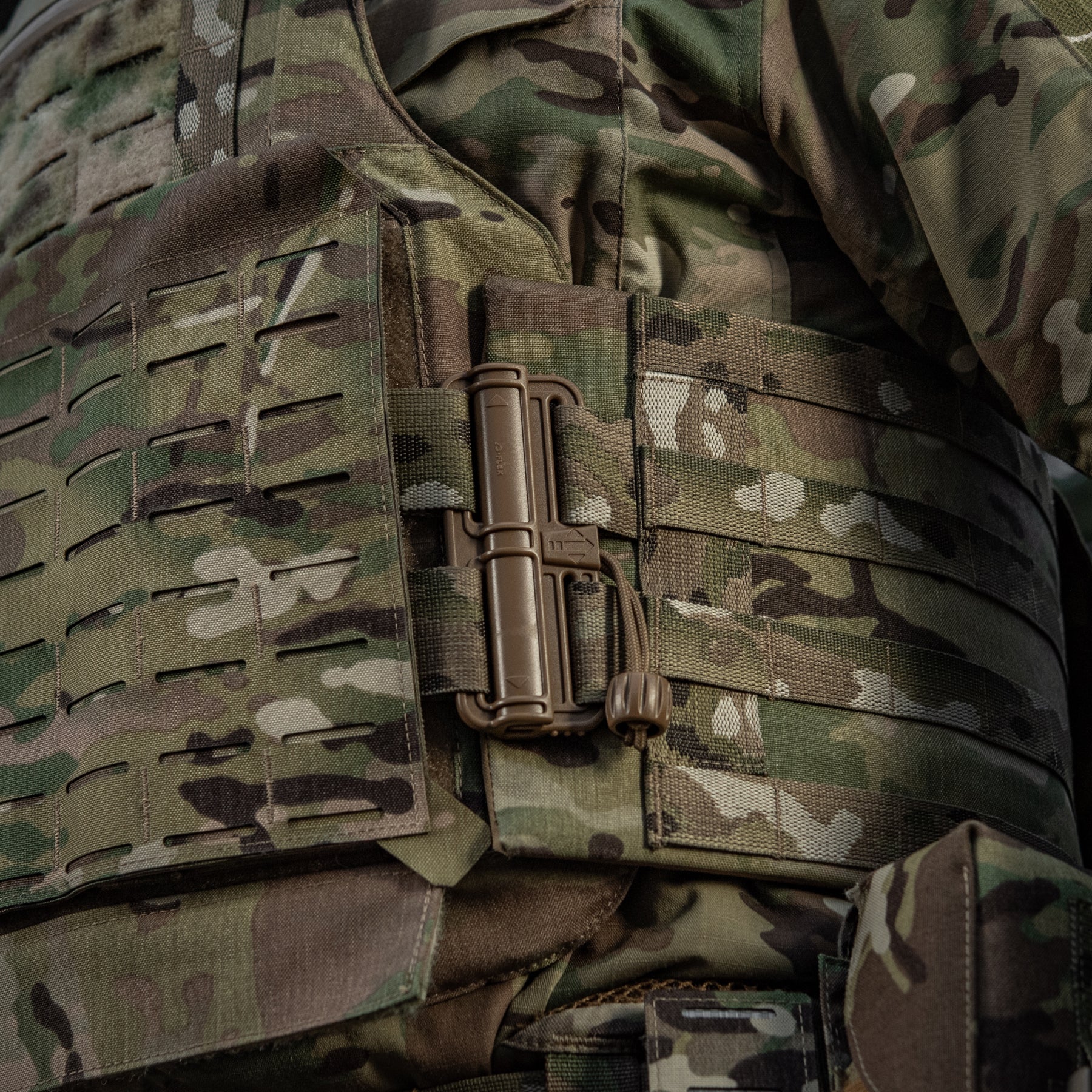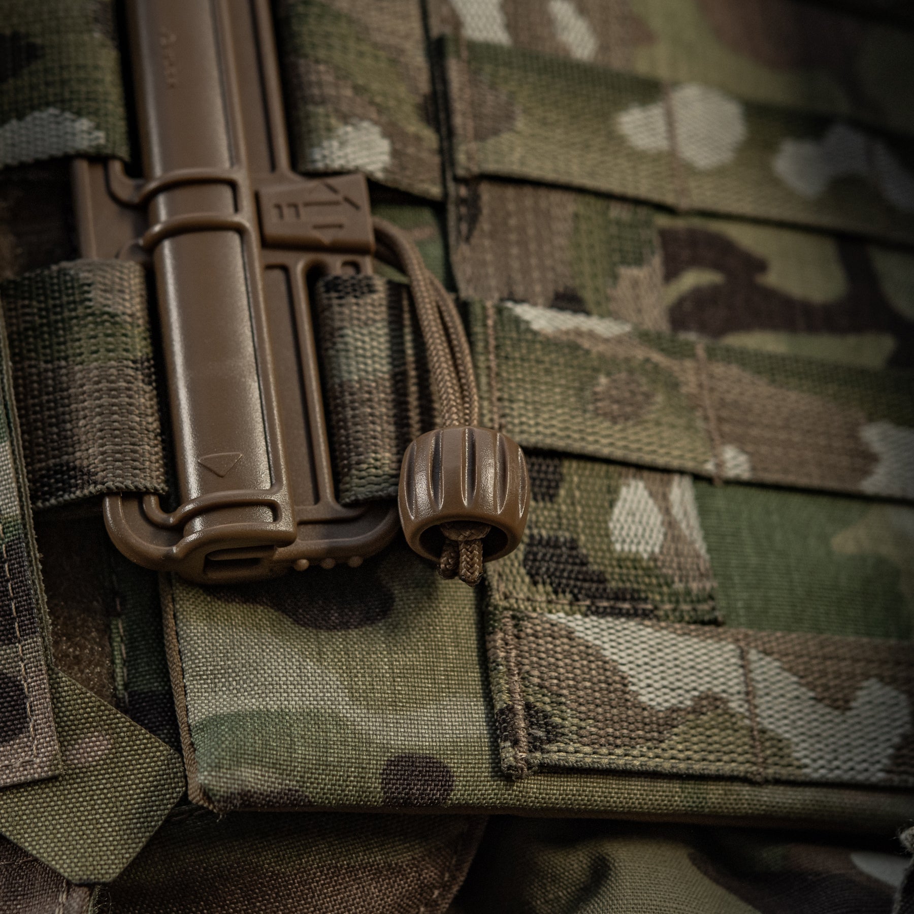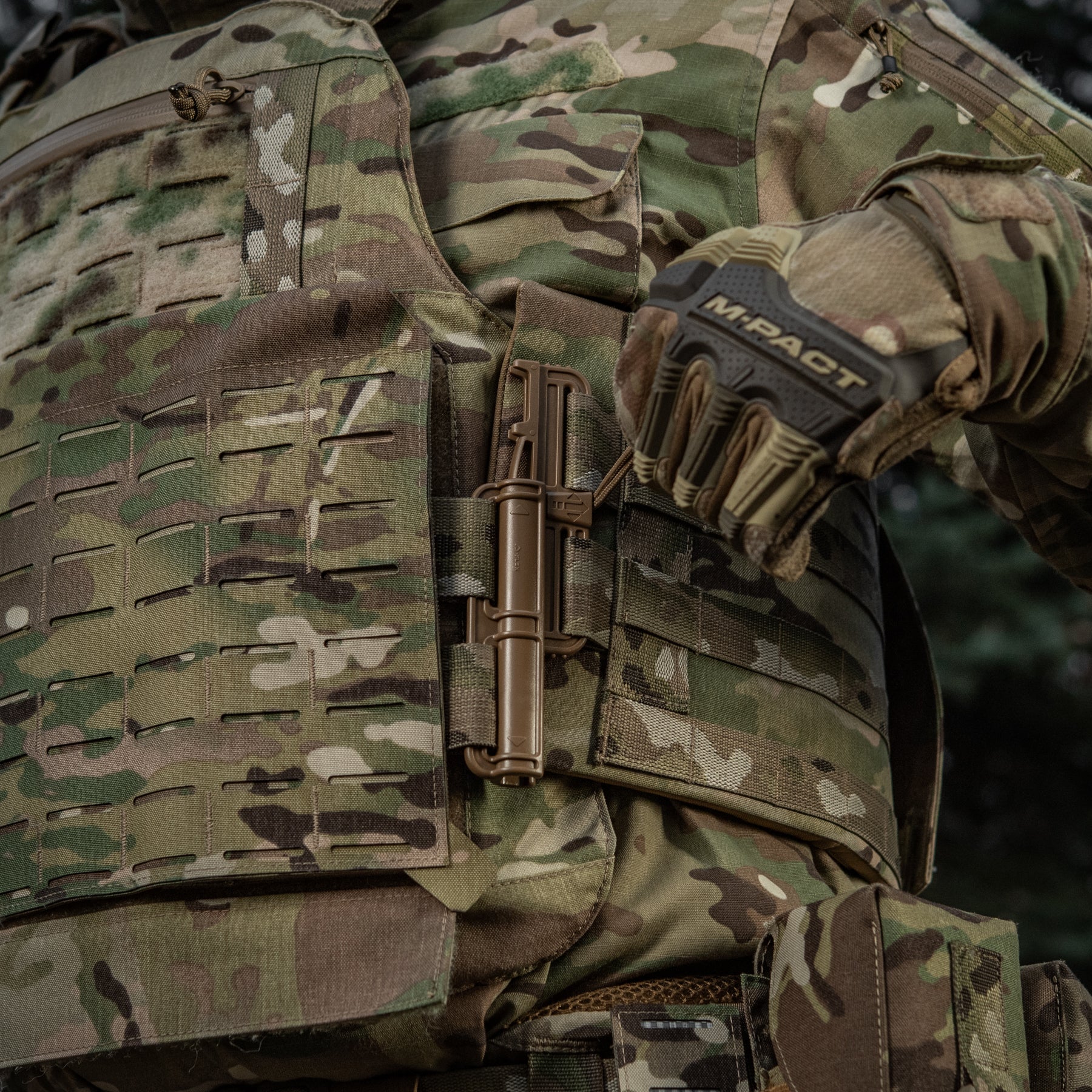 A key distinguishing feature of the M-Tac Plate Carrier Cover Sturm Gen.II Elite—and its main difference from previous generations—is the inclusion of quick-release Duraflex buckles on the cummerbund. These premium fasteners combine a simplified locking/unlocking system with low weight and exceptional strength (able to withstand high loads). The system allows for rapid donning and doffing with a swift upward or downward pull on the designated strap.