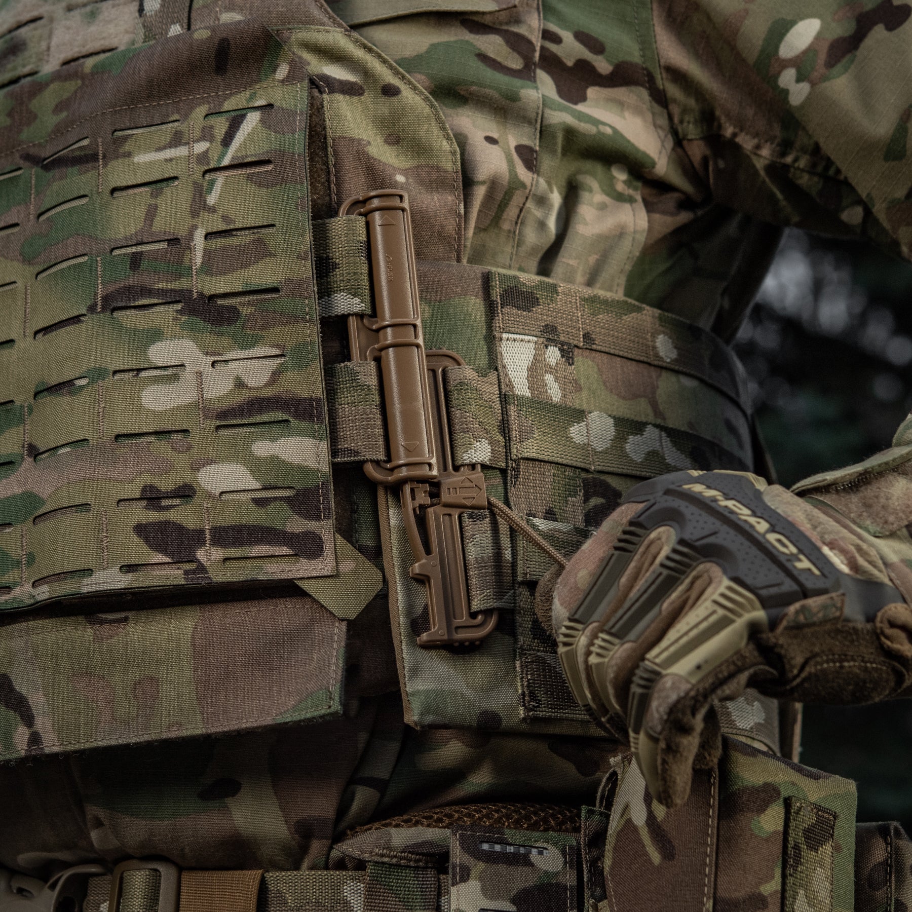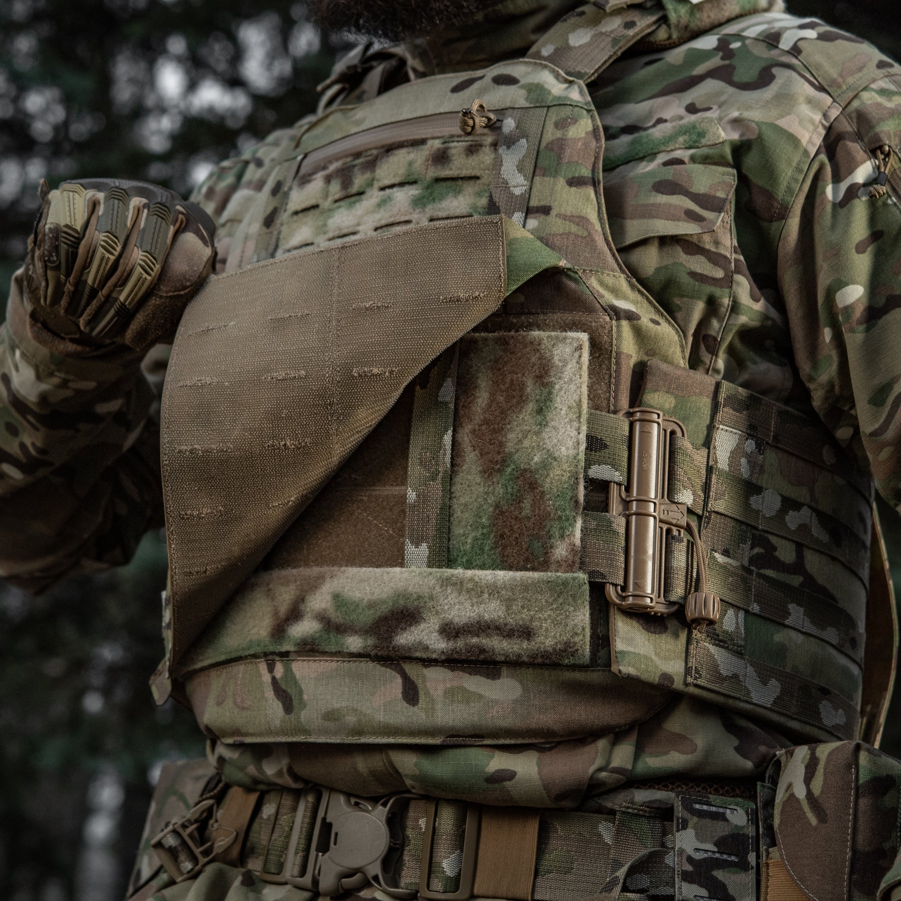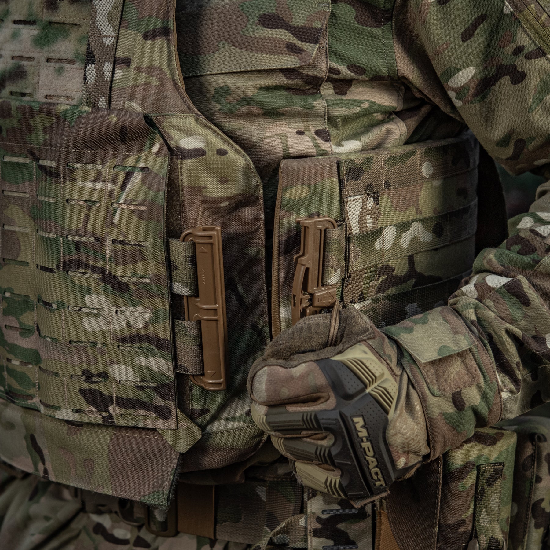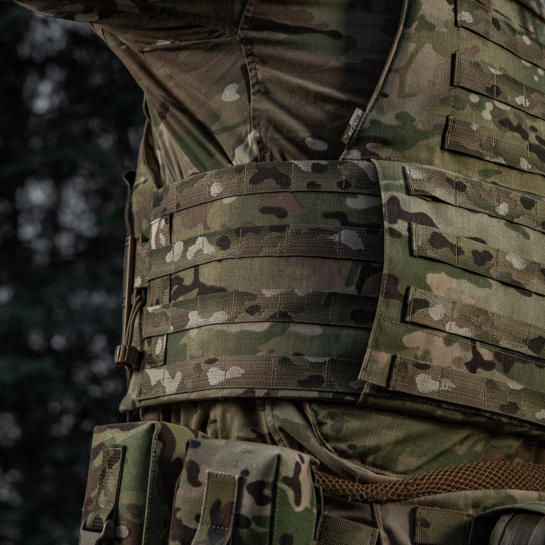 A key distinguishing feature of the M-Tac Plate Carrier Cover Sturm Gen.II Elite—and its main difference from previous generations—is the inclusion of quick-release Duraflex buckles on the cummerbund. These premium fasteners combine a simplified locking/unlocking system with low weight and exceptional strength (able to withstand high loads). The system allows for rapid donning and doffing with a swift upward or downward pull on the designated strap.
