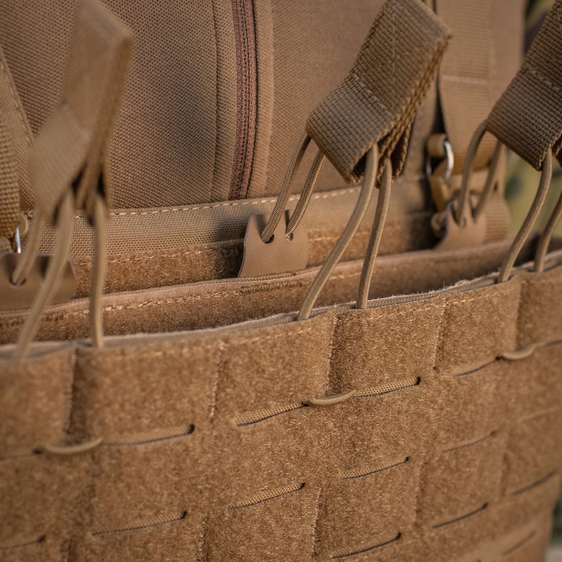 The Modular Chest Rig from M-Tac is a tactical chest rig that acts as an unloading system. Sewn from enduring Cordura 500D. The front panel is designed for three magazines and attaches firmly to the base with Woojin hooks and a velcro strap. The special straps hold the magazines in place, preventing them from accidentally falling out. The MOLLE interface allows you to attach additional pouches with gear or other equipment. The panel is detachable and can be easily replaced with a different modular insert with velcro straps.