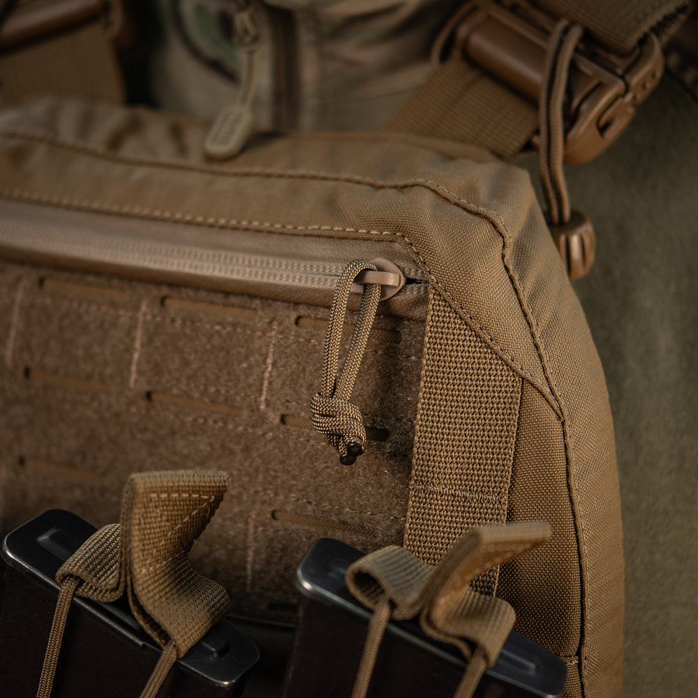 The carrier is made of Cordura 500D, ensuring exceptional resistance to abrasion, tearing, and heavy loads. Inside, 3D mesh inserts provide ventilation and cushioning for improved comfort during prolonged wear.
