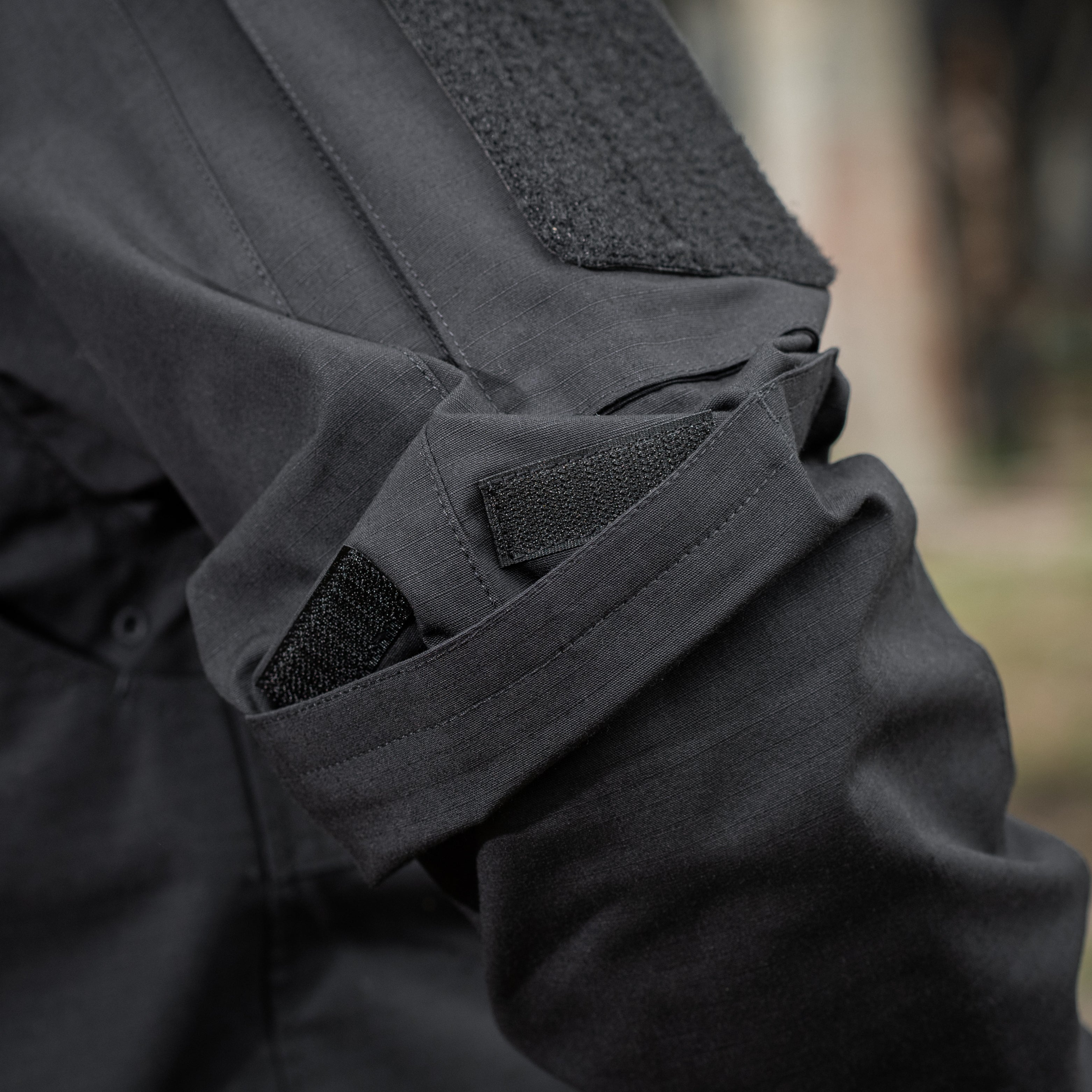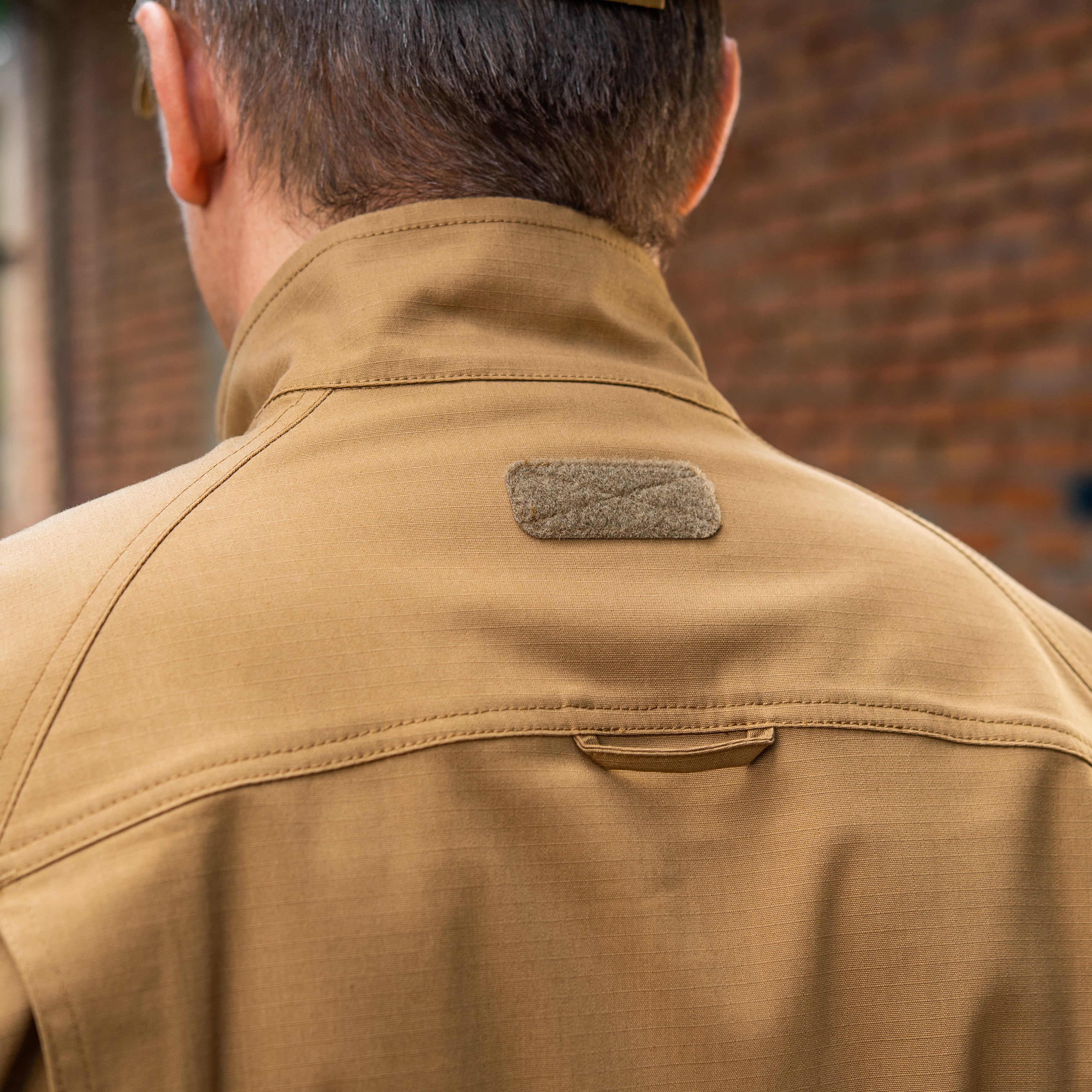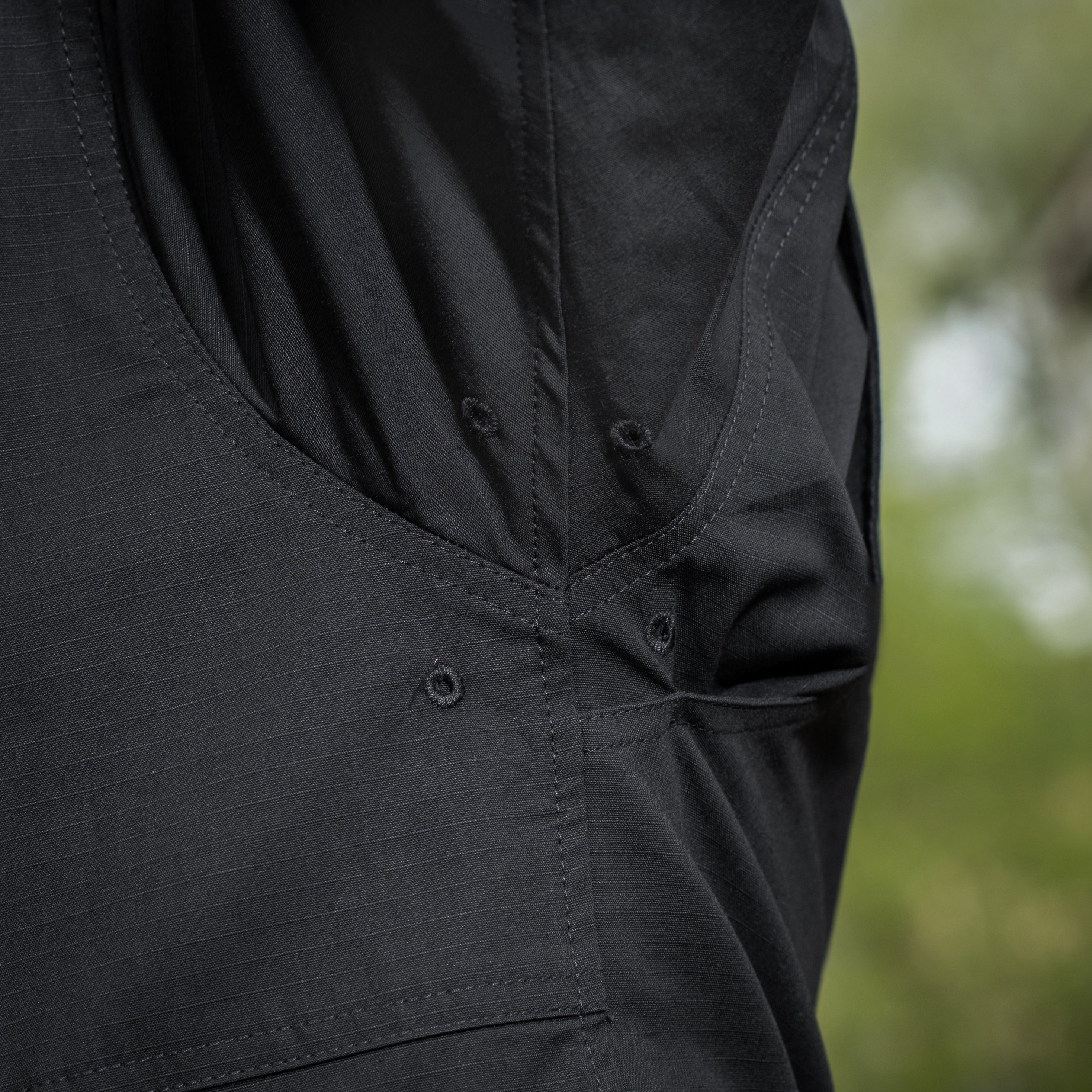 The back features a reinforced yoke in the upper section, with a loop panel under the collar for an IR marker. Along the armholes, expansion pleats are incorporated to maintain freedom of movement, even when wearing body armor or load-bearing equipment over the shirt. The sleeves are also equipped with loop pockets for installing soft elbow protection. The cuffs are adjustable with loop closure tabs.