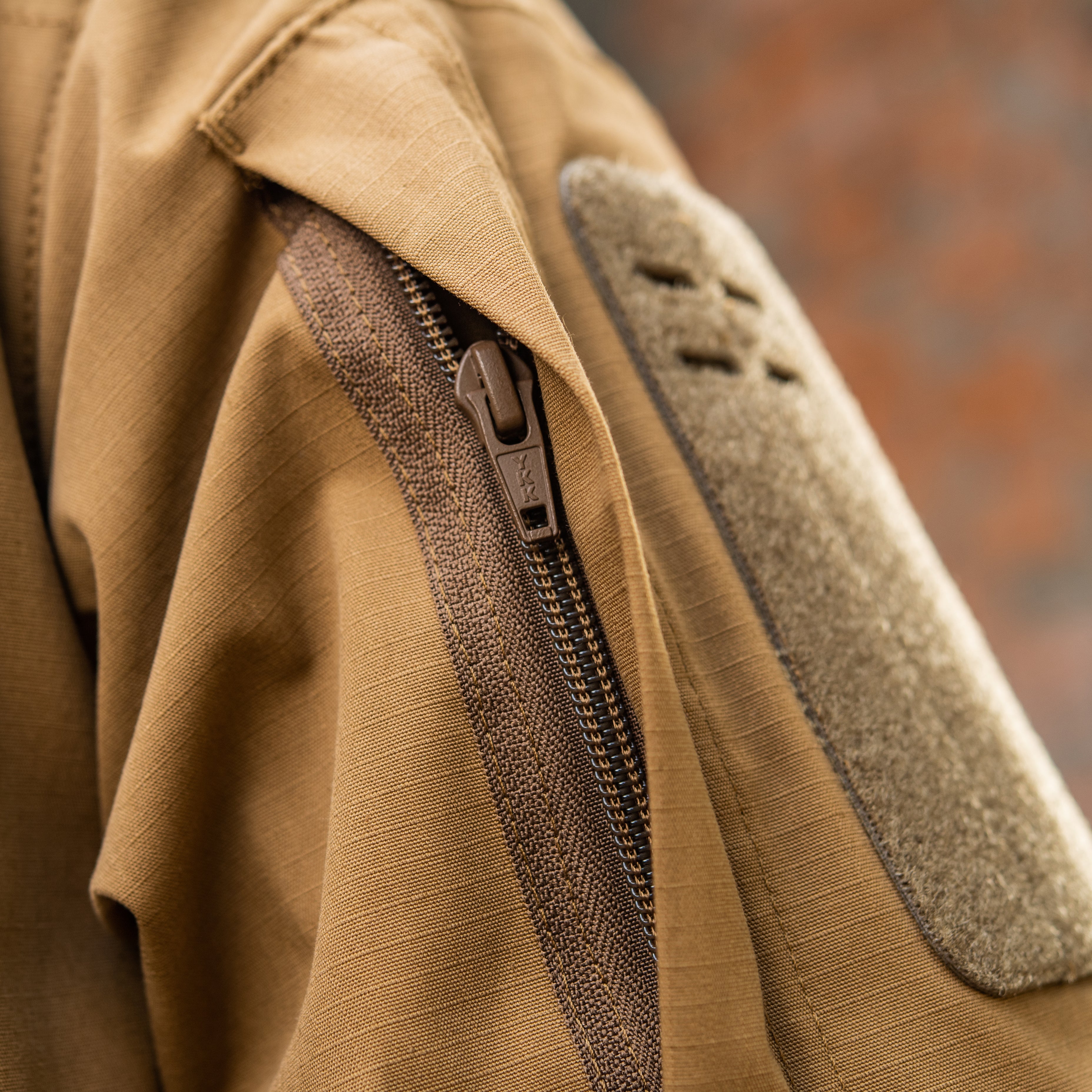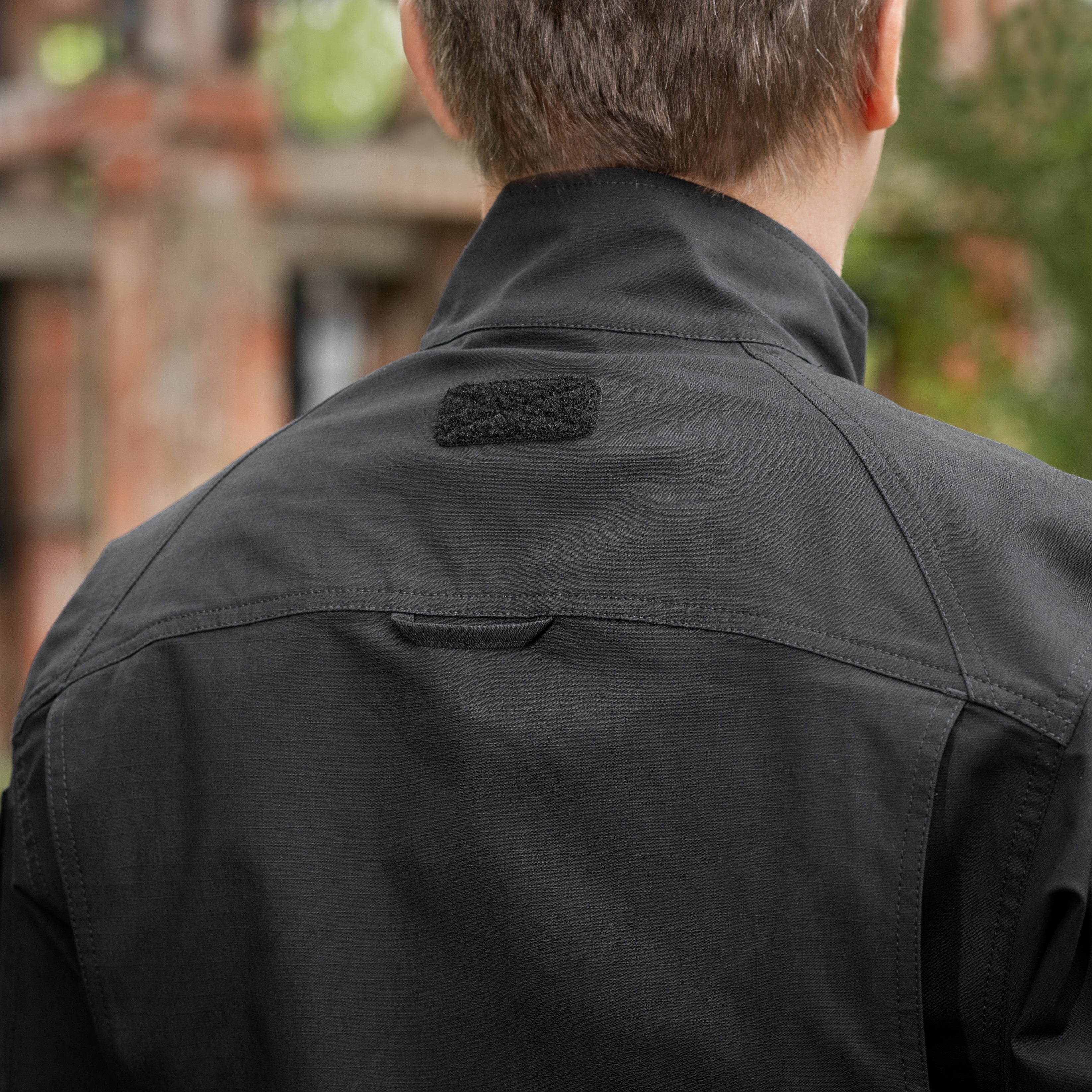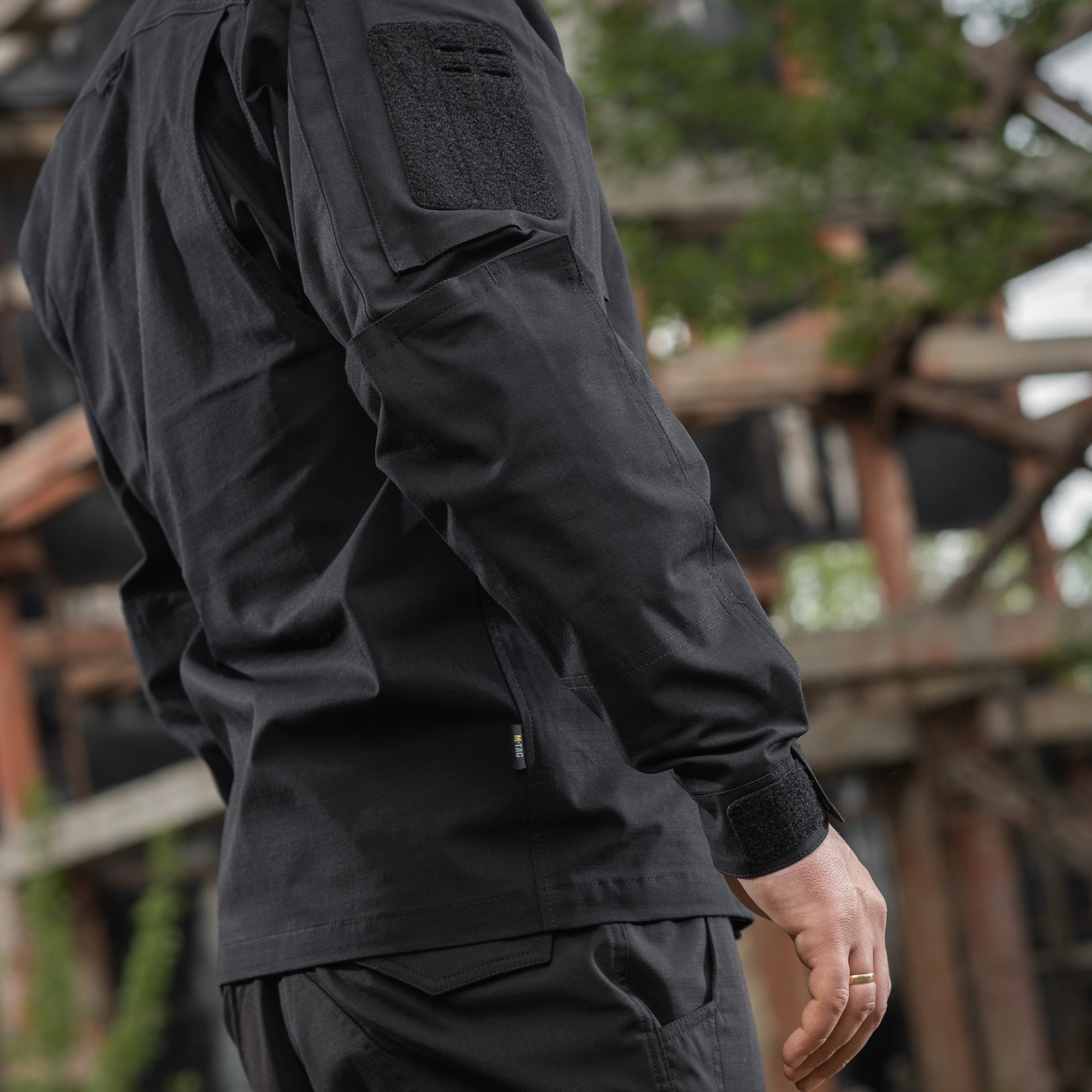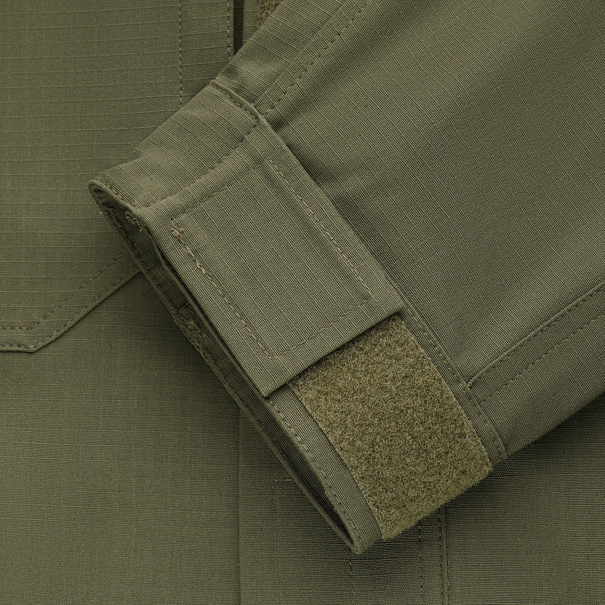 The back features a reinforced yoke in the upper section, with a loop panel under the collar for an IR marker. Along the armholes, expansion pleats are incorporated to maintain freedom of movement, even when wearing body armor or load-bearing equipment over the shirt. The sleeves are also equipped with loop pockets for installing soft elbow protection. The cuffs are adjustable with loop closure tabs.