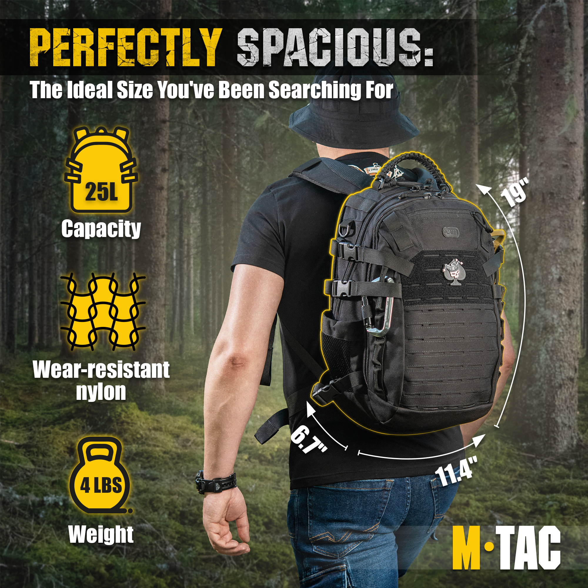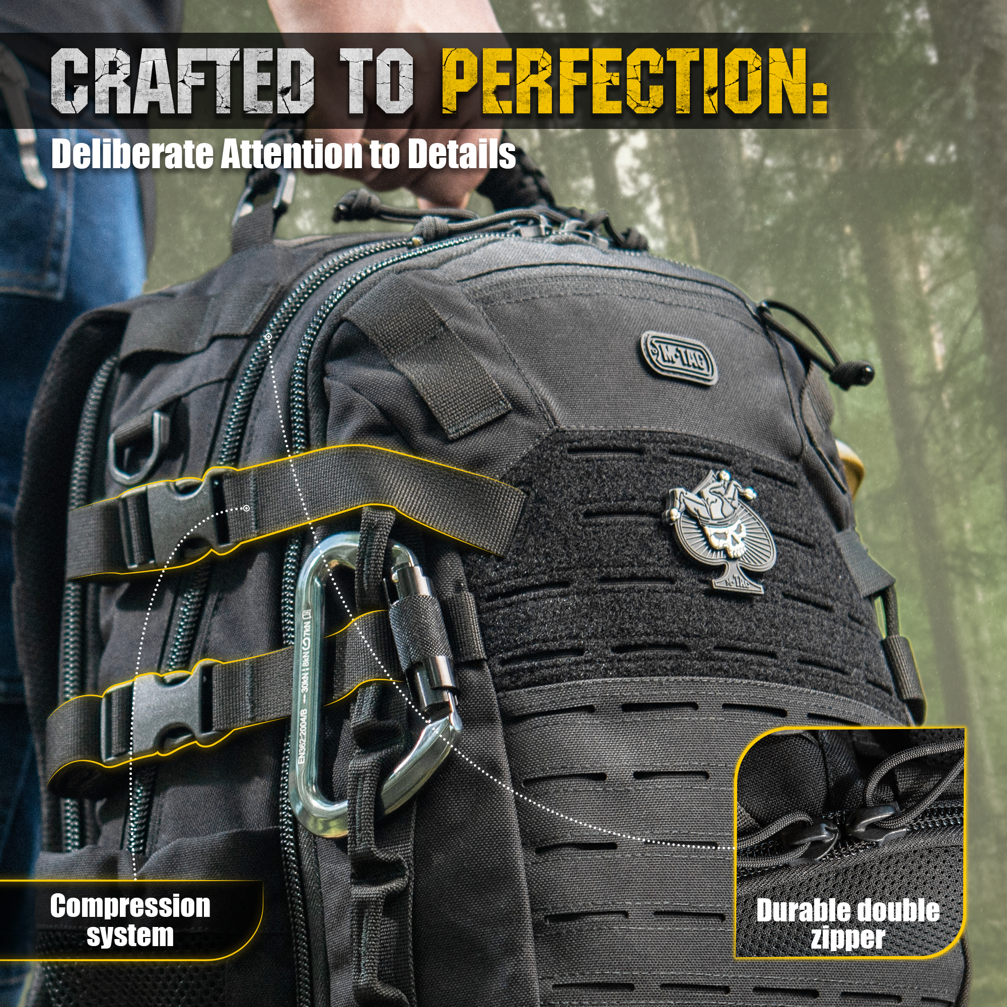 It is made from high-quality, wear-resistant Nylon. YKK, a world leader in hardware production, supplies zippers. The front of the backpack is equipped with the MOLLE LASER CUT system, allowing you to increase its volume with additional pouches as needed.
