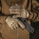 The M-Tac tactical all-purpose gloves Assault Tactical Mk.4 are designed for a muliporpose use. This model has a reinforced palm pad made of genuine leather that will prevent severe injuries and bruises during falls, and prevent slipping even when wet. The gloves feature damping pads over the knuckles. This feature absorbs shock and ensures your hands stay well-protected during rigorous activities. The gloves are designed to last, so you can rely on them to safeguard your hands in any situation. The cuff closes with hook and loop fastener, which creates additional comfort. These gloves will accompany and protect you while motorcycling, during a workout, in combat, or any other outdoor activity.