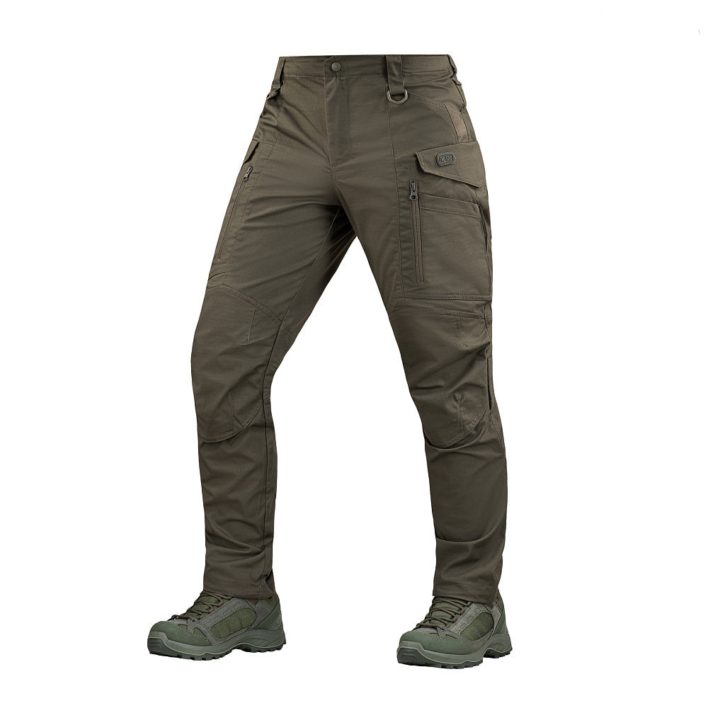 The M-Tac Conquistador Gen I Flex tactical pants will accompany you in any outdoor activities. Wear them to work, to a shooting range, on a hiking or camping trip, or a combat mission. Sewn from Rip-Stop Flex material, these cargo pants are abrasion resistant and are not prone to parching, so they will last you for many years to come. This highly breathable fabric also features dirt- and water-resistant Teflon coating to protect your legs from the outside world. These work pants have elastic inserts in the waist and on the thighs that ensure that you have complete freedom of movement. The pants have 8 pockets, so you can carry and evenly distribute all your gear and kit. The pockets are also additionally enforced on the upper seems, so you can clip your knife or flashlight without damaging the fabric. There are two D-rings sewn to the beltline, so you can attach even more gear. The back pockets have zippers to protect whatever is inside. The cargo pocket has a pouch on top of it that fill house an AK or an M4 magazine. The main cargo pocket can be closed with a hook and loop fastener and with a zipper. Pockets on the knees allow for dampers to be inserted to further protect your knee joints from impact. The bottom cuffs of the trousers come with elastic strings, so they can be either tightened or loosened.