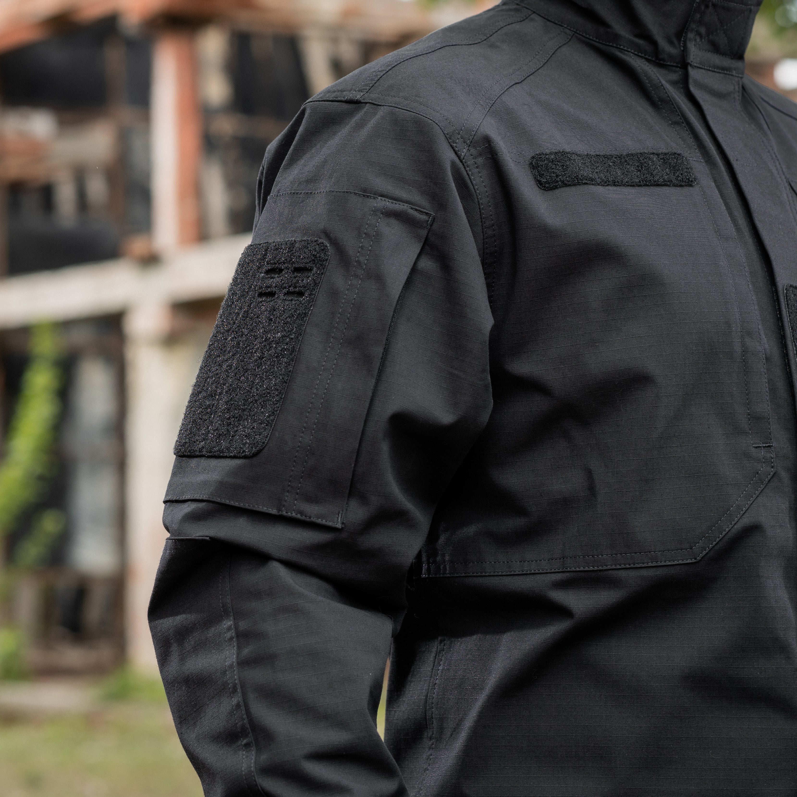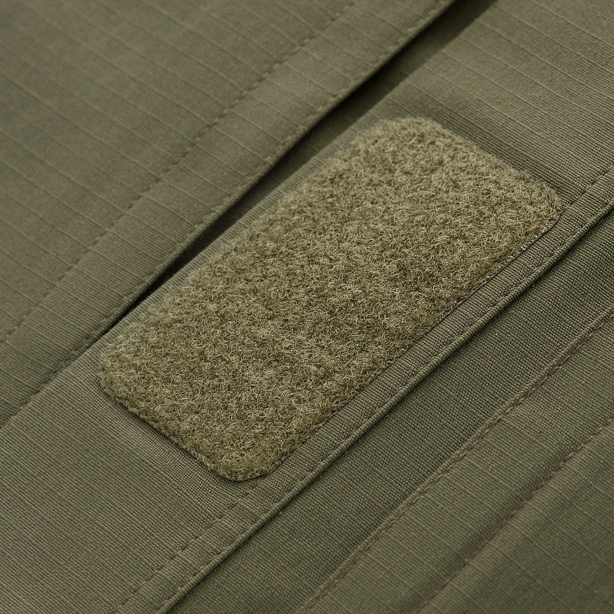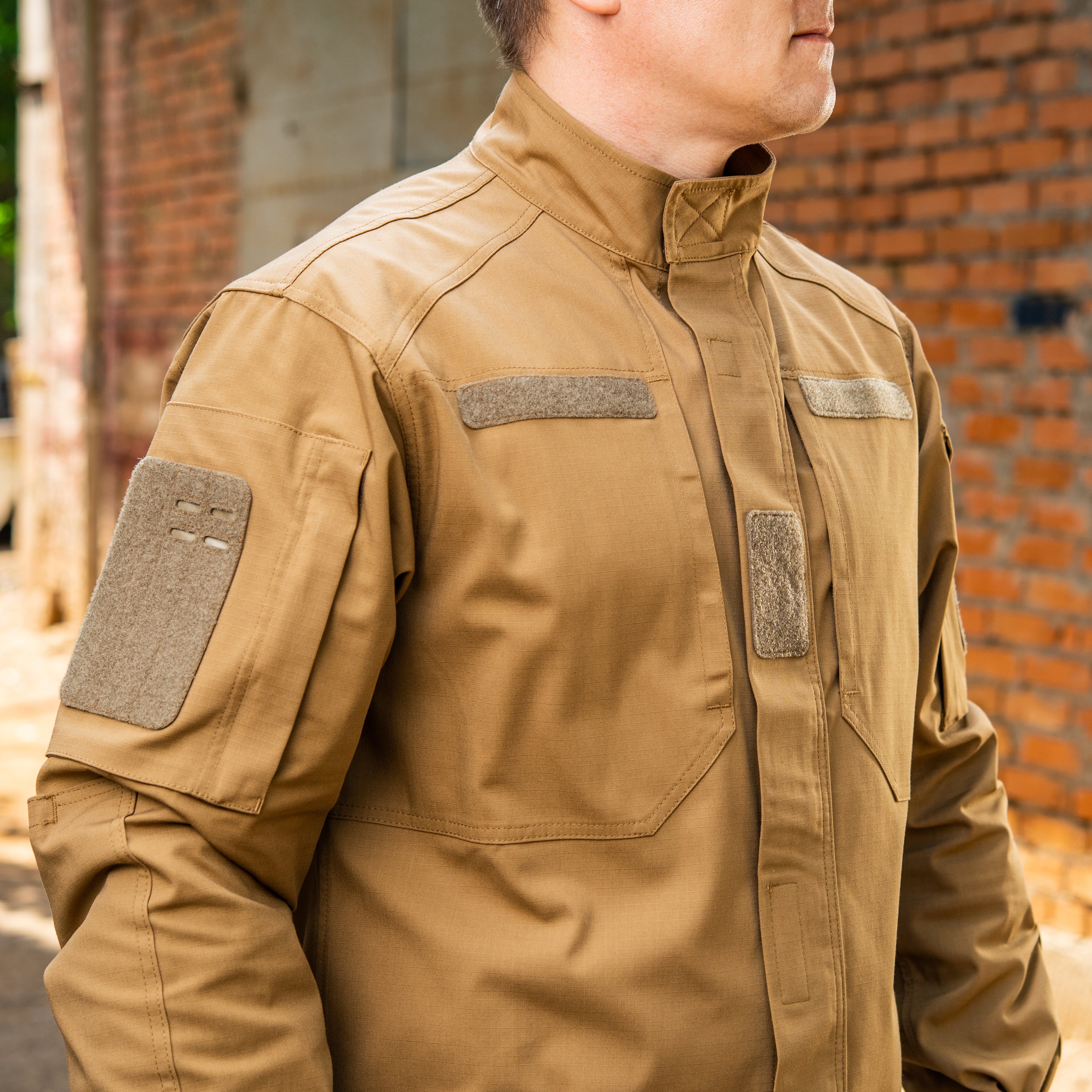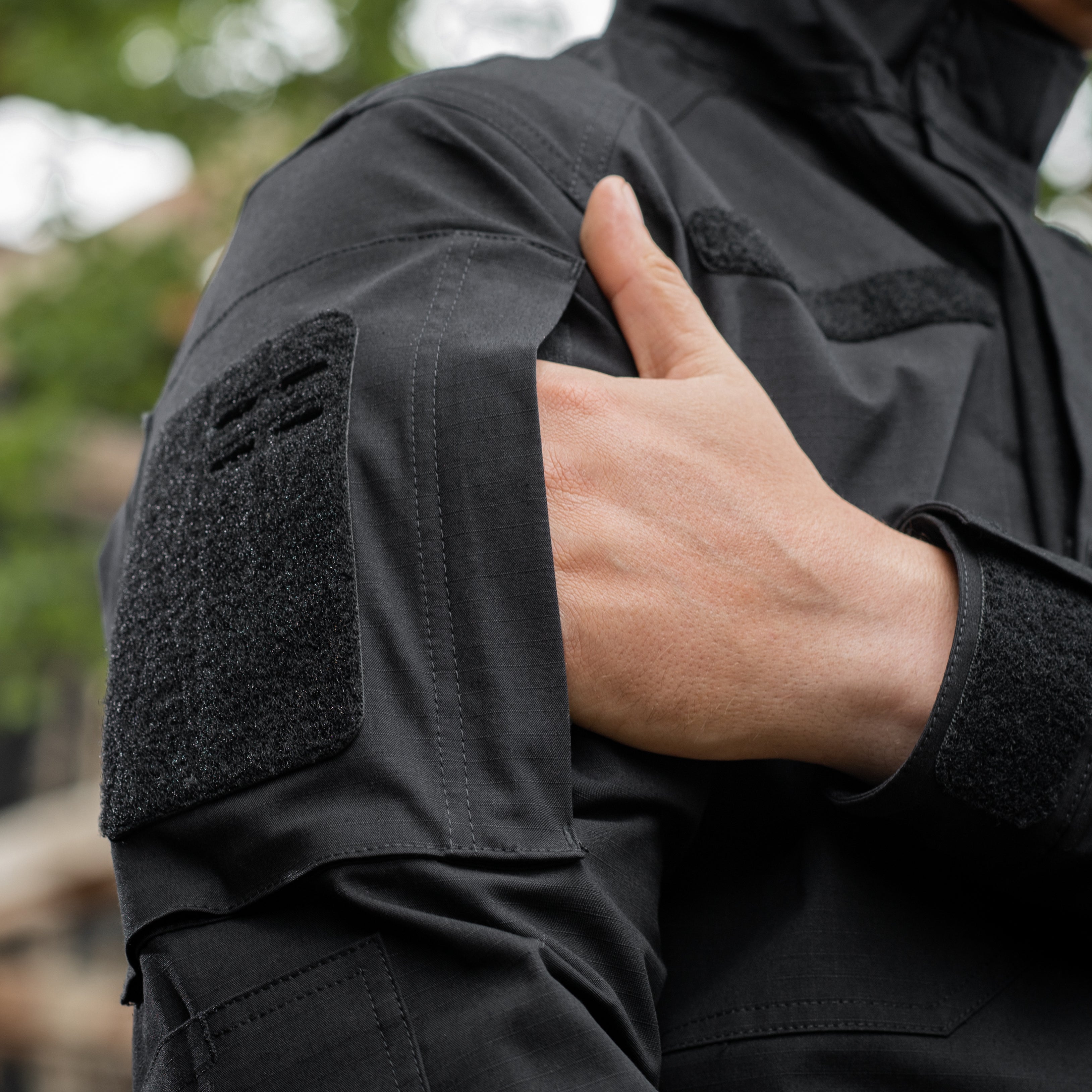 The back features a reinforced yoke in the upper section, with a loop panel under the collar for an IR marker. Along the armholes, expansion pleats are incorporated to maintain freedom of movement, even when wearing body armor or load-bearing equipment over the shirt. The sleeves are also equipped with loop pockets for installing soft elbow protection. The cuffs are adjustable with loop closure tabs.