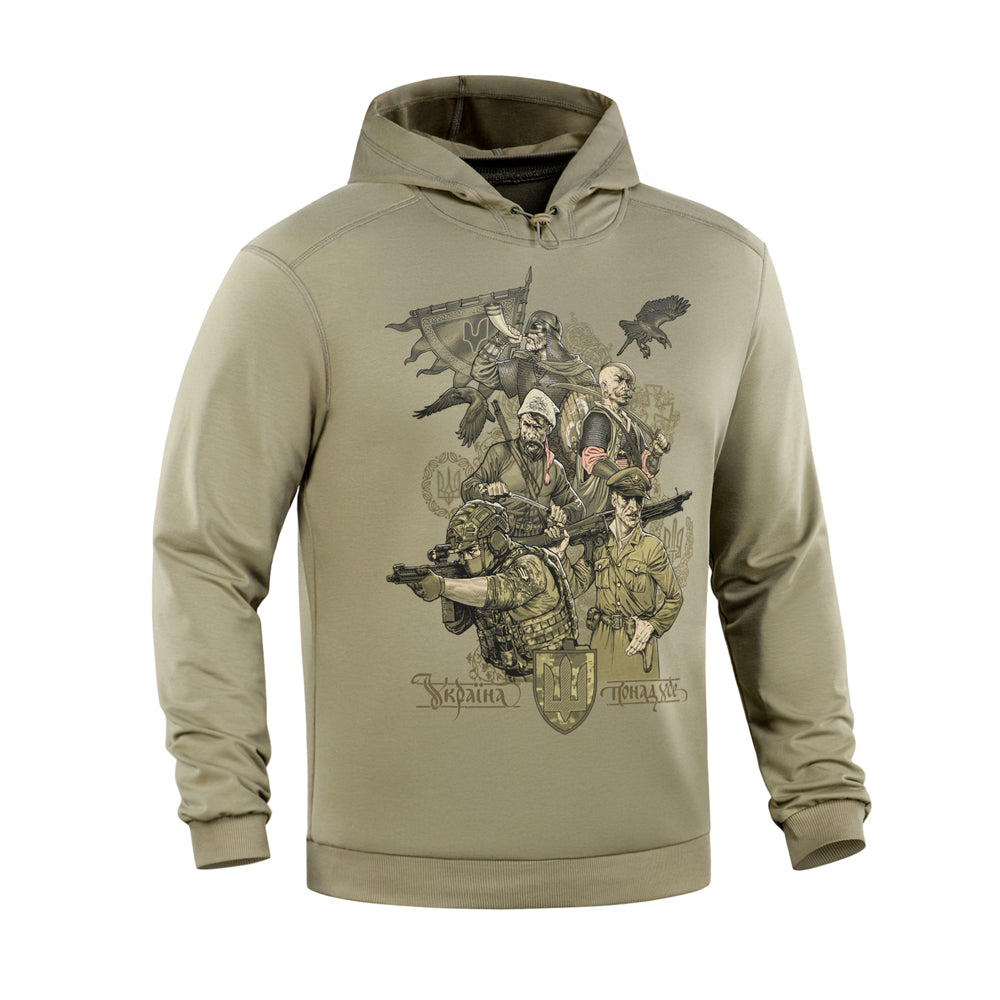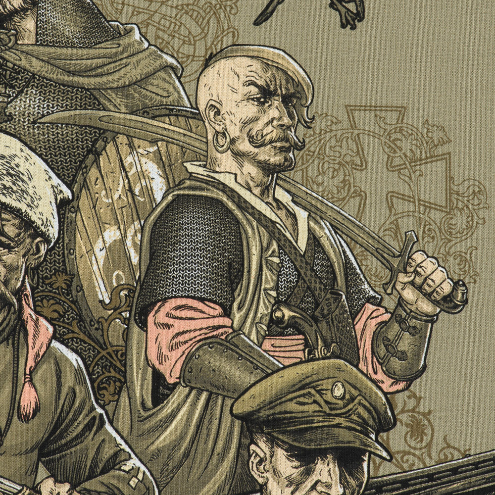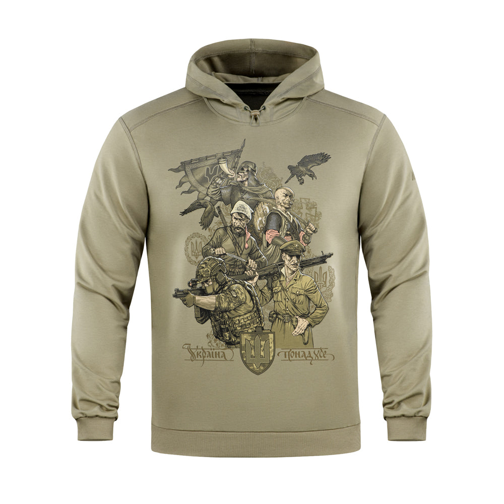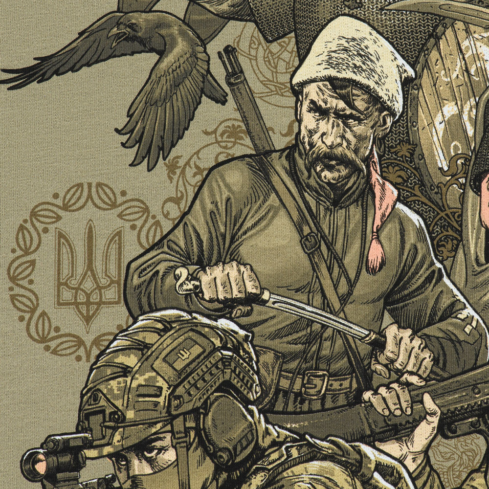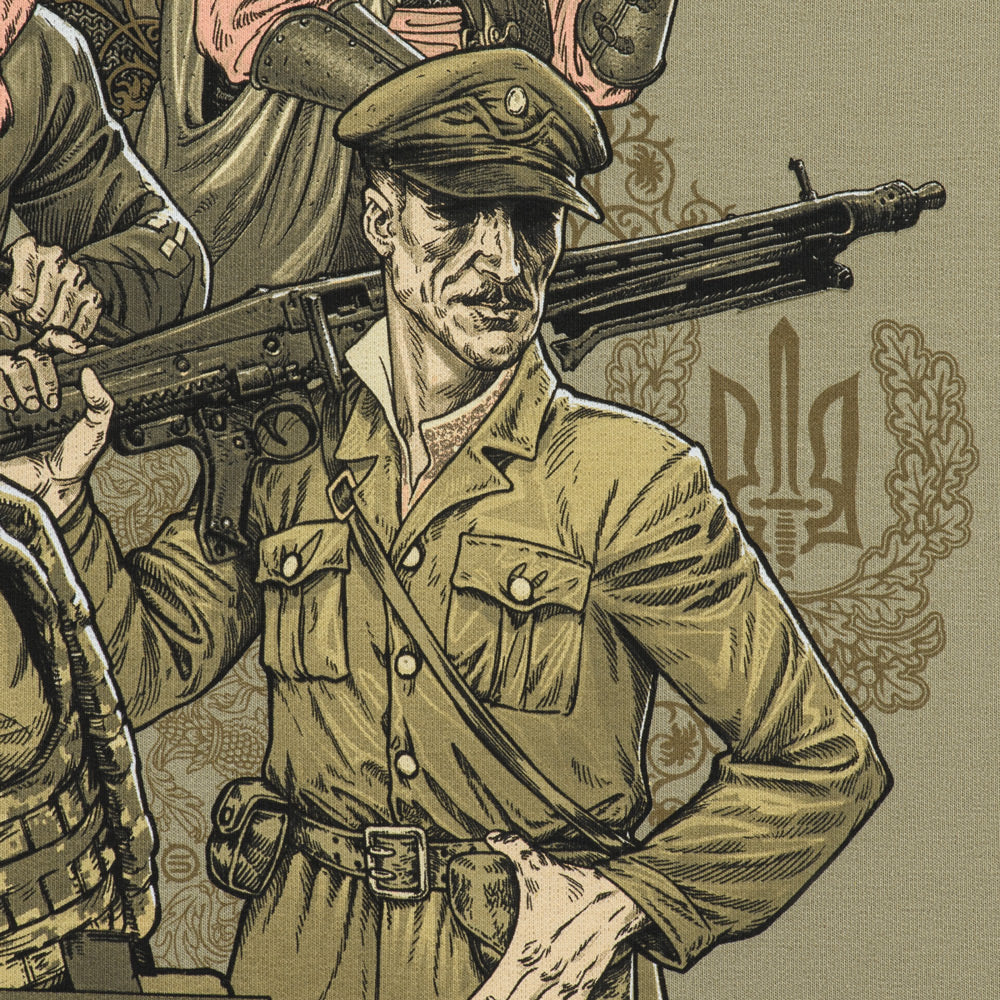 The print depicts different generations of Ukrainian warriors, united by a single goal: the fight for Ukraine's independence. The back of the hoodie features the text of the "March of Ukrainian Nationalists" (OUN Anthem), which for many years has been a powerful symbol of the Ukrainian liberation spirit.