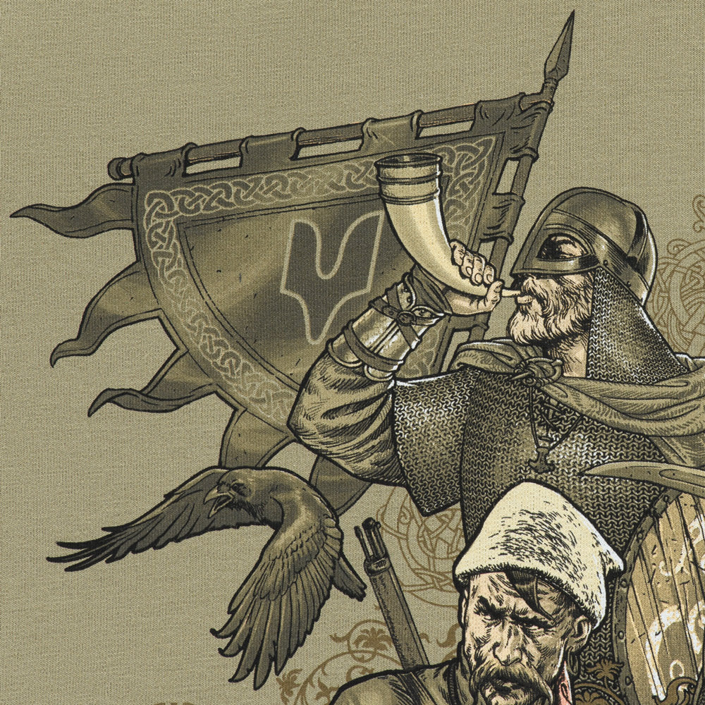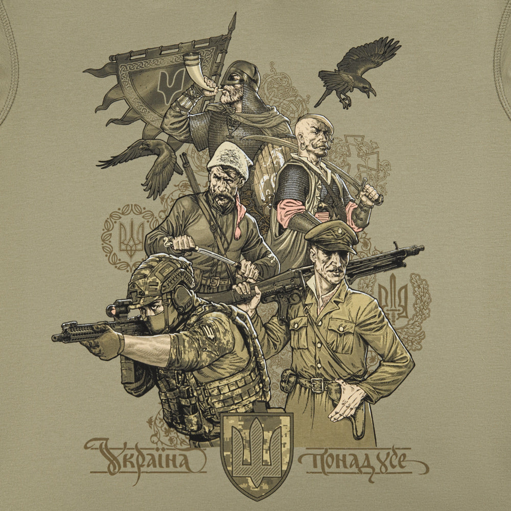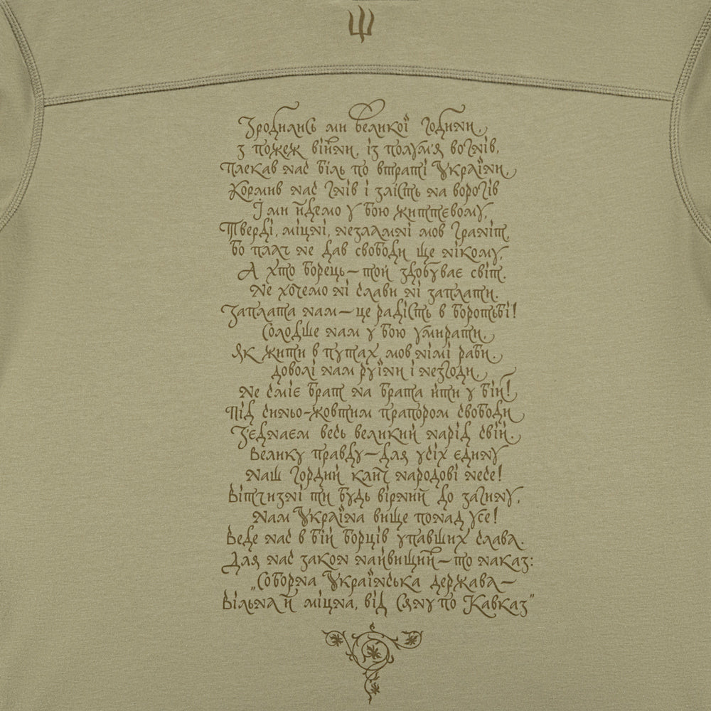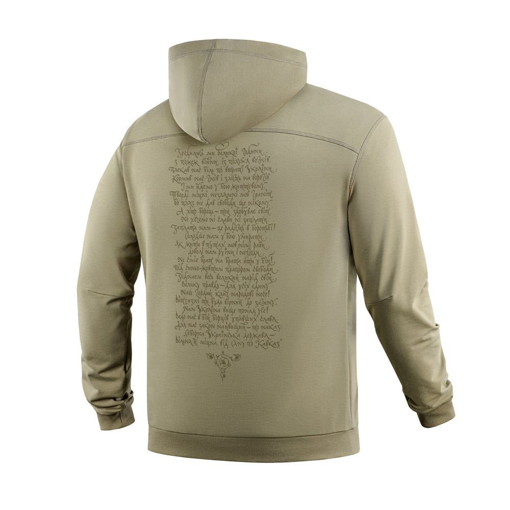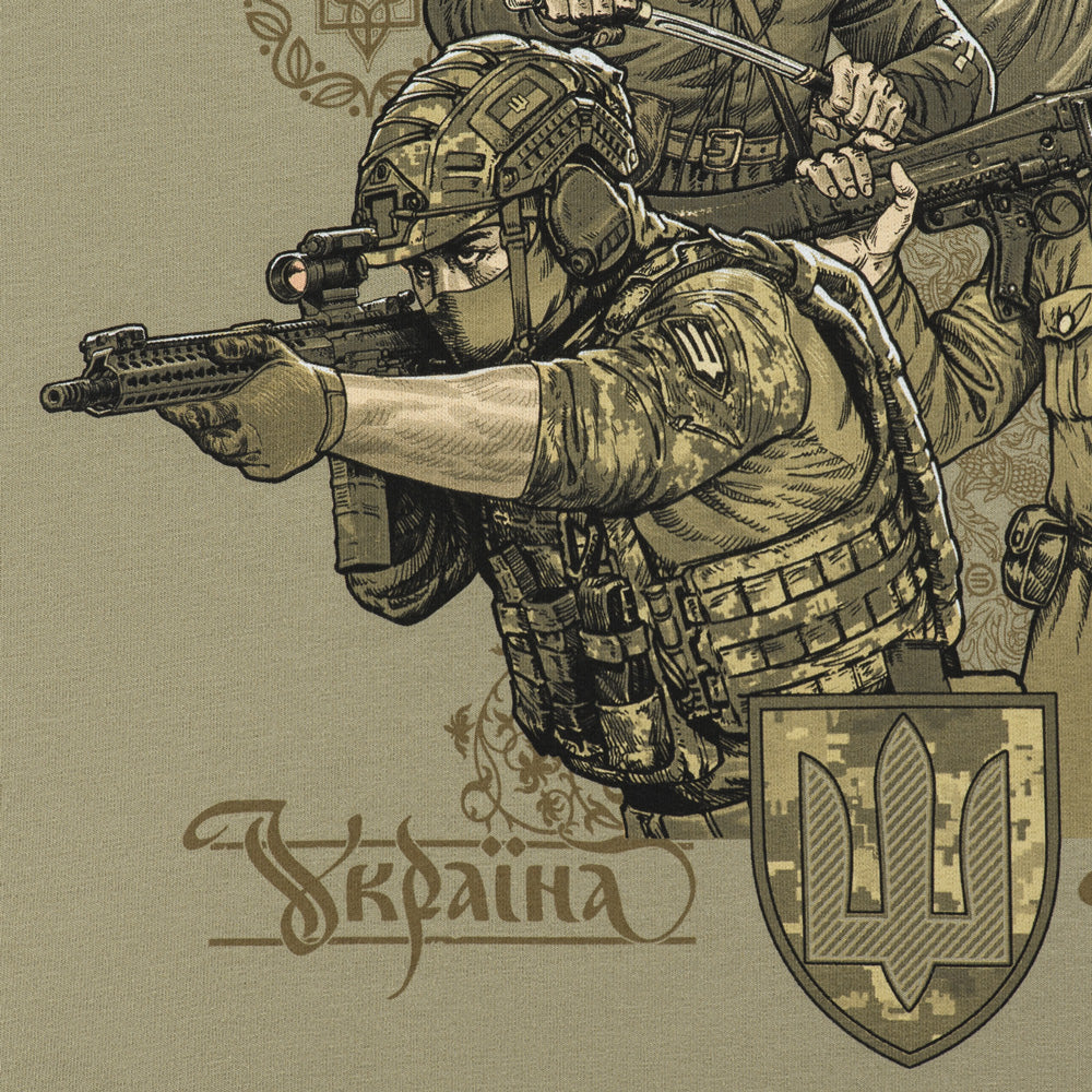 The print depicts different generations of Ukrainian warriors, united by a single goal: the fight for Ukraine's independence. The back of the hoodie features the text of the "March of Ukrainian Nationalists" (OUN Anthem), which for many years has been a powerful symbol of the Ukrainian liberation spirit.