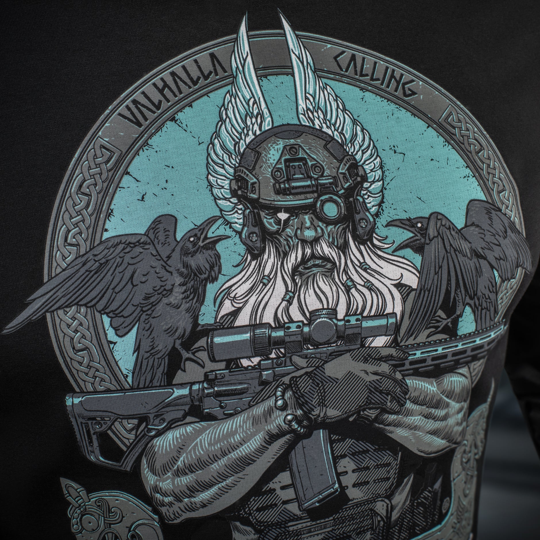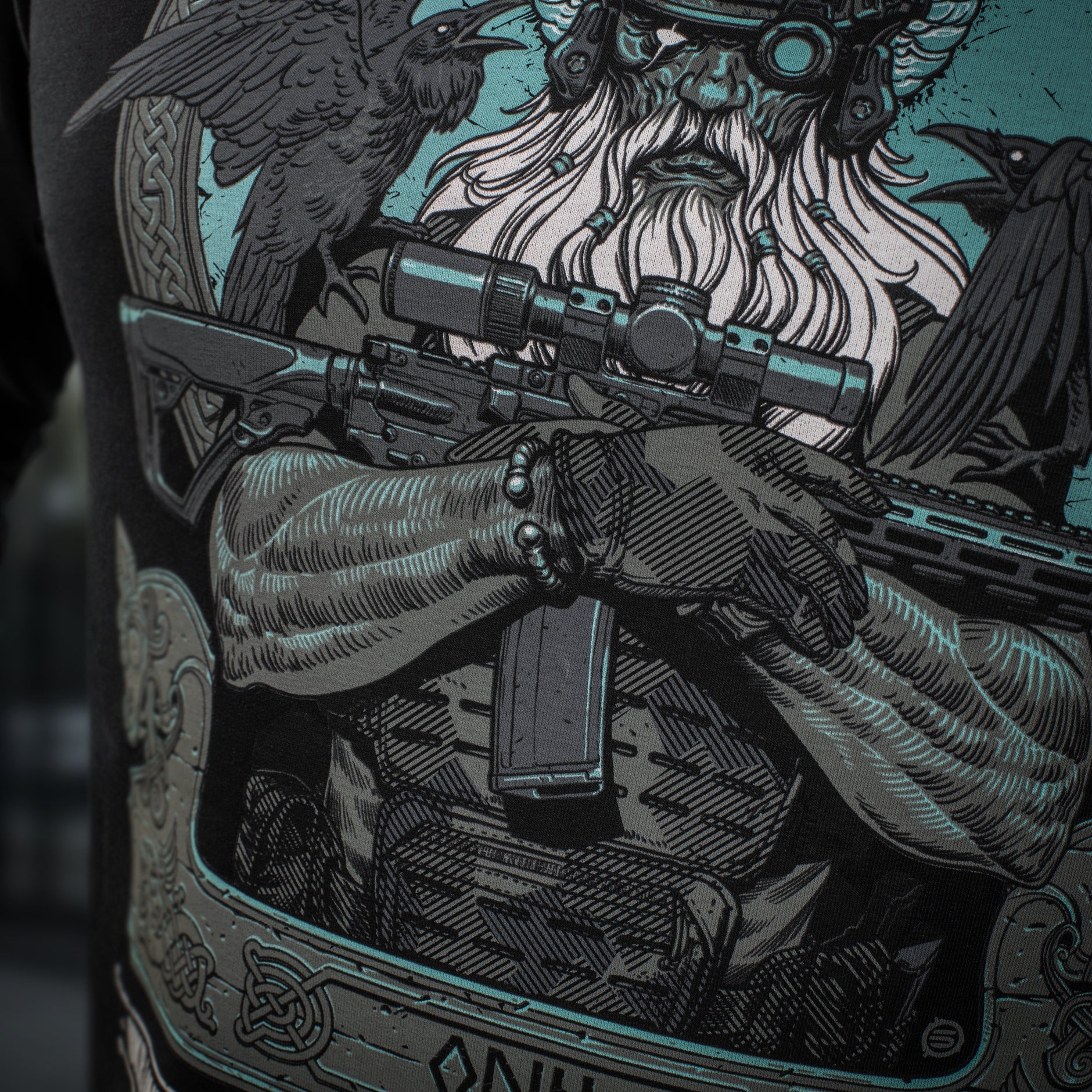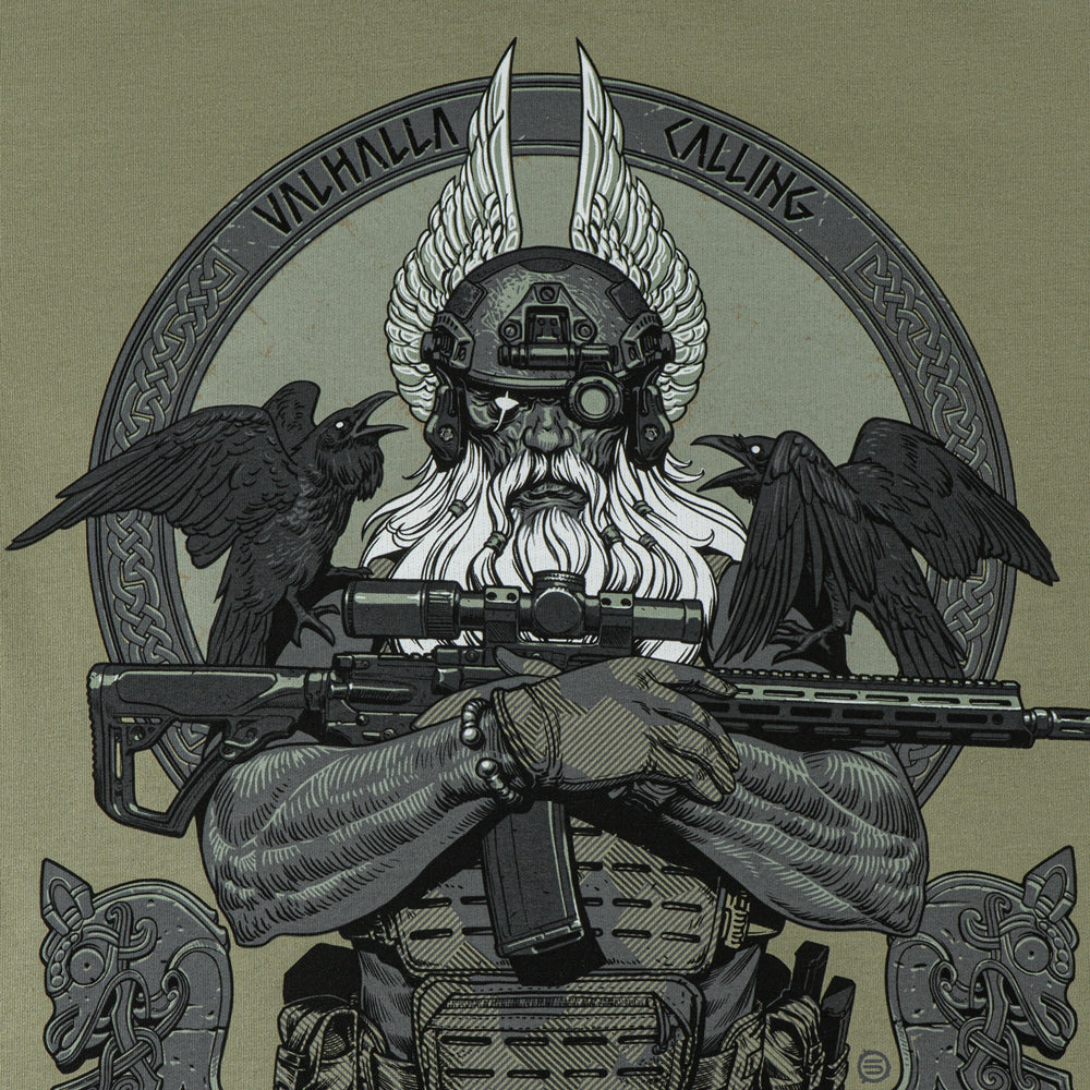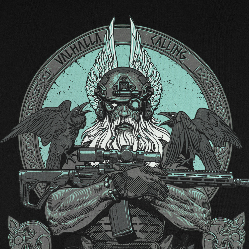 The striking graphic print depicts a determined Odin, who has exchanged his traditional spear (Gungnir) for a contemporary AR-15 rifle. Outfitted in modern combat gear, including a helmet with NVGs (Night Vision Goggles), he is prepared to lead his warriors into the final battle. Perched on Odin’s shoulders are his loyal companions—the ravens Huginn (Thought) and Muninn (Memory)—who daily fly over the Nine Worlds and report everything that has transpired back to the Allfather.