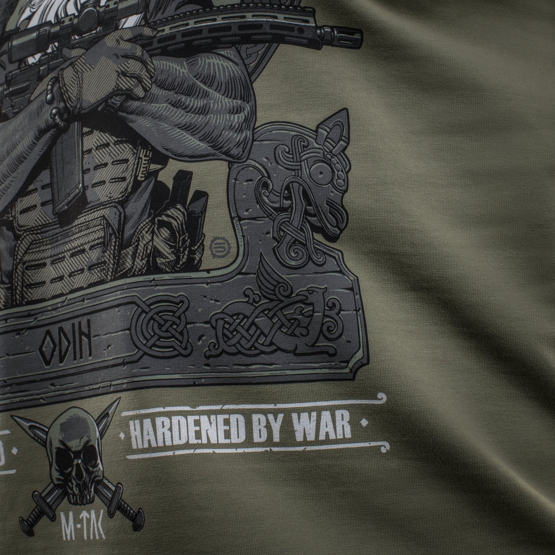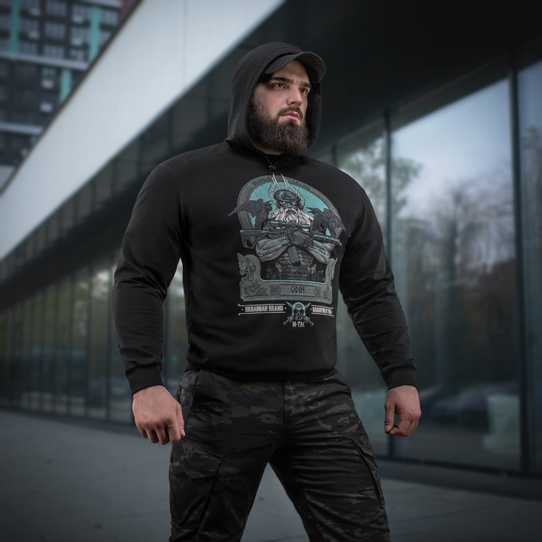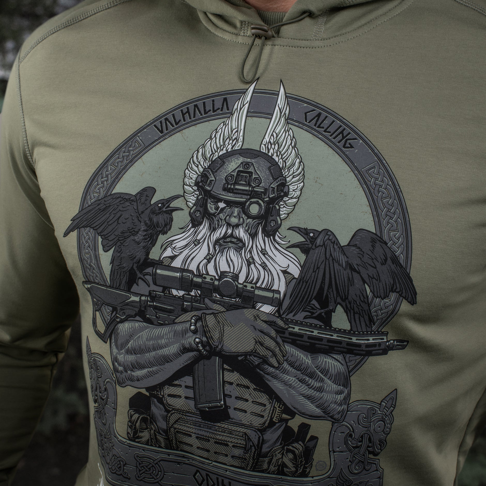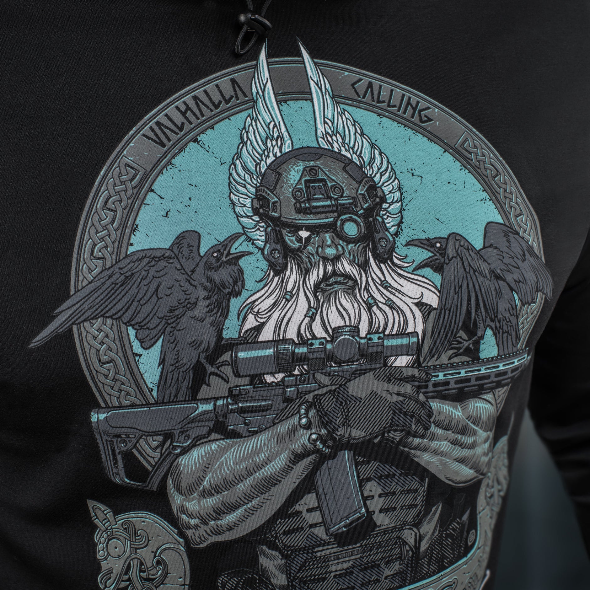 The striking graphic print depicts a determined Odin, who has exchanged his traditional spear (Gungnir) for a contemporary AR-15 rifle. Outfitted in modern combat gear, including a helmet with NVGs (Night Vision Goggles), he is prepared to lead his warriors into the final battle. Perched on Odin’s shoulders are his loyal companions—the ravens Huginn (Thought) and Muninn (Memory)—who daily fly over the Nine Worlds and report everything that has transpired back to the Allfather.