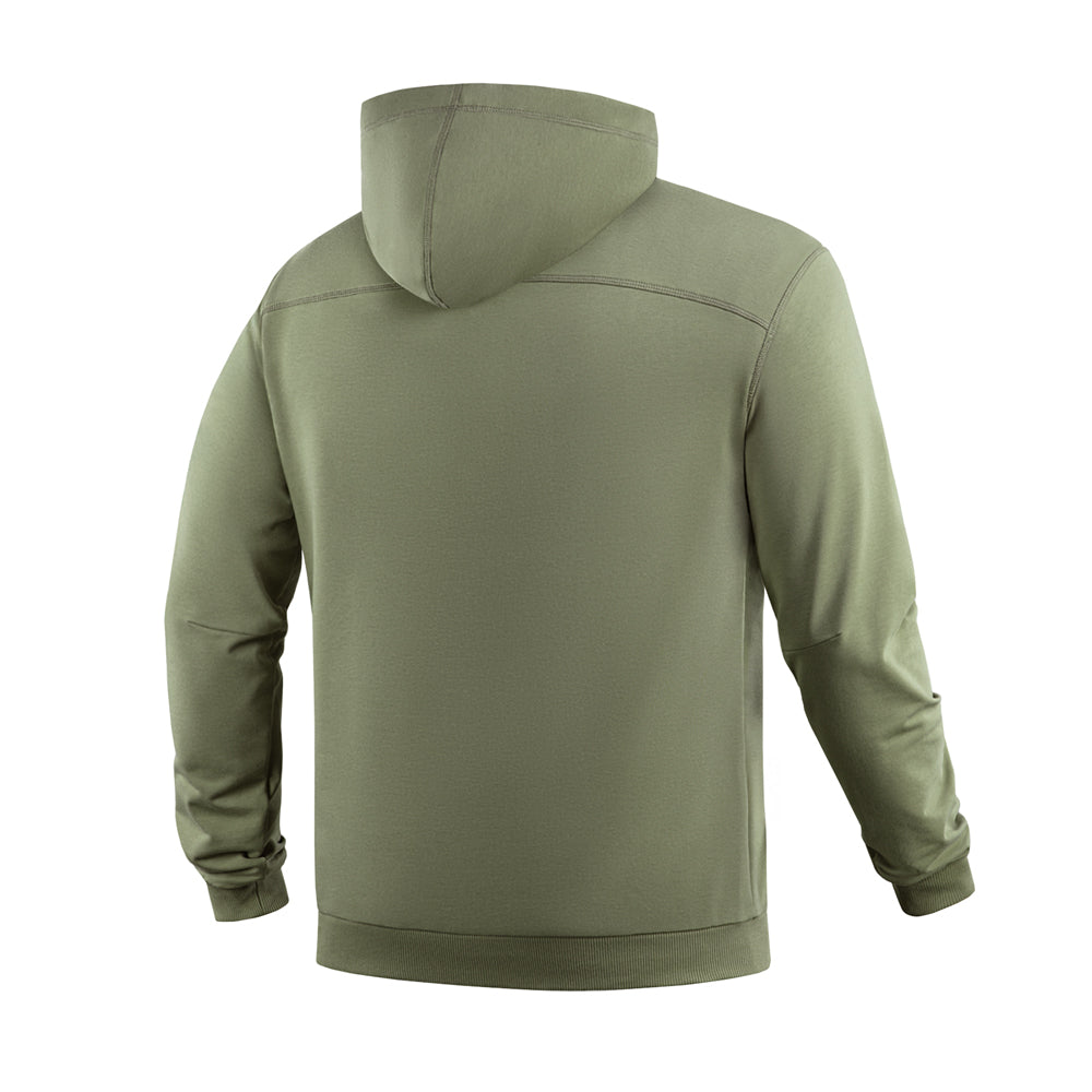 The loose fit of the M-Tac Odin Hoodie ensures unrestricted movement during physical activity. The comfortable hood is volume-adjustable and provides excellent protection against wind and adverse weather. The cuffs and hem are made from knitted elastic fabric, helping the hoodie maintain its shape and preventing cold air from entering the garment.
