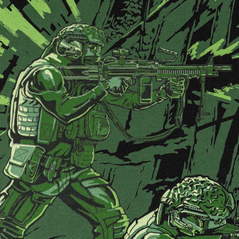 The basis for the print is an episode from the life of two comrades, depicted through the prism of a Night Vision Device. The image is complemented by the inscriptions: "one is none two is one" and "пліч-о-пліч" (Side by Side), which symbolize the value of camaraderie during the toughest trials of combat.