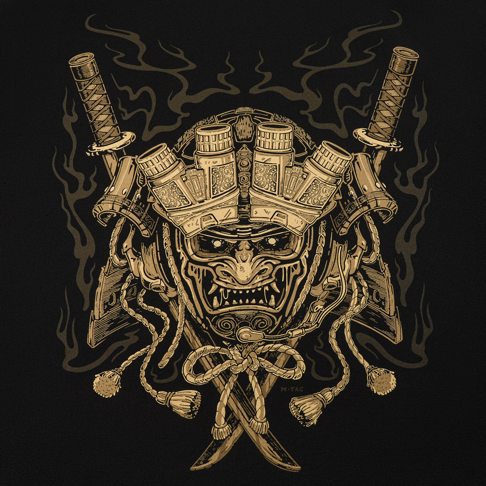 The T-shirt print depicts a samurai created through a fusion of past and present. His face is covered by a battle mask bearing the image of an Oni — a demon symbolizing terror, chaos, and natural disasters. The primary purpose of this part of the armor was not only to protect the samurai, but also to intimidate enemies and symbolically bestow the warrior with demonic power, creating the illusion of invincibility.