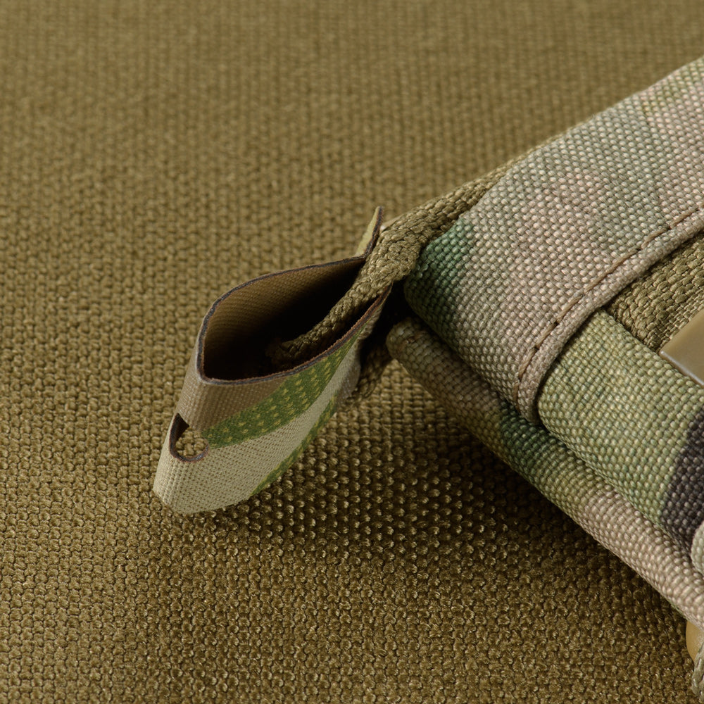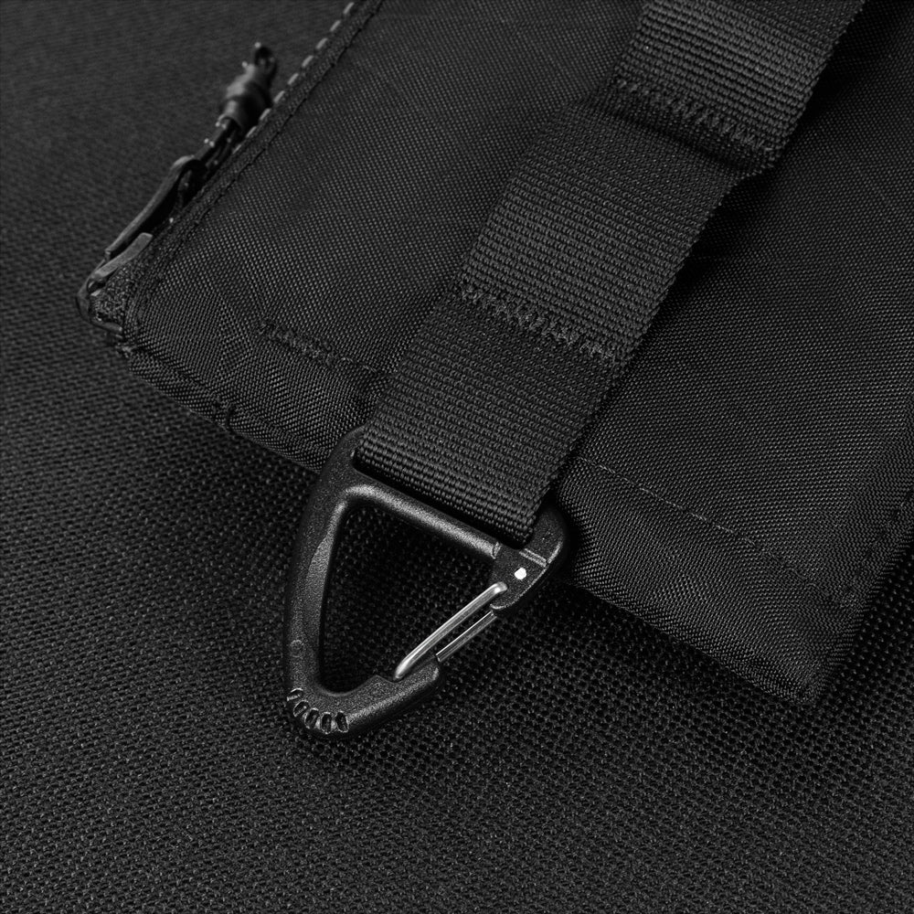 A Woojin Triangle Metal Hook carabiner is located on the right side of the wallet. Using it, you can attach the wallet to a belt loop on your pants. A D-ring is placed on the left side, allowing you to attach additional items to the wallet, such as a carabiner or keys. The rear of the product is equipped with a MOLLE strap that serves not only a decorative role but also allows you to attach a clip-on flashlight to the wallet.