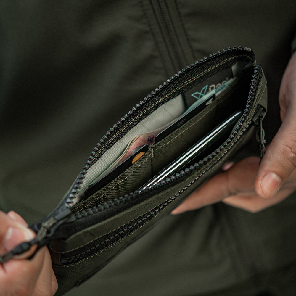 This wallet is made from the innovative X-PAC material. This material has become widely known among tactical gear manufacturers due to its successful combination of durability, light weight, and resistance to UV and water.