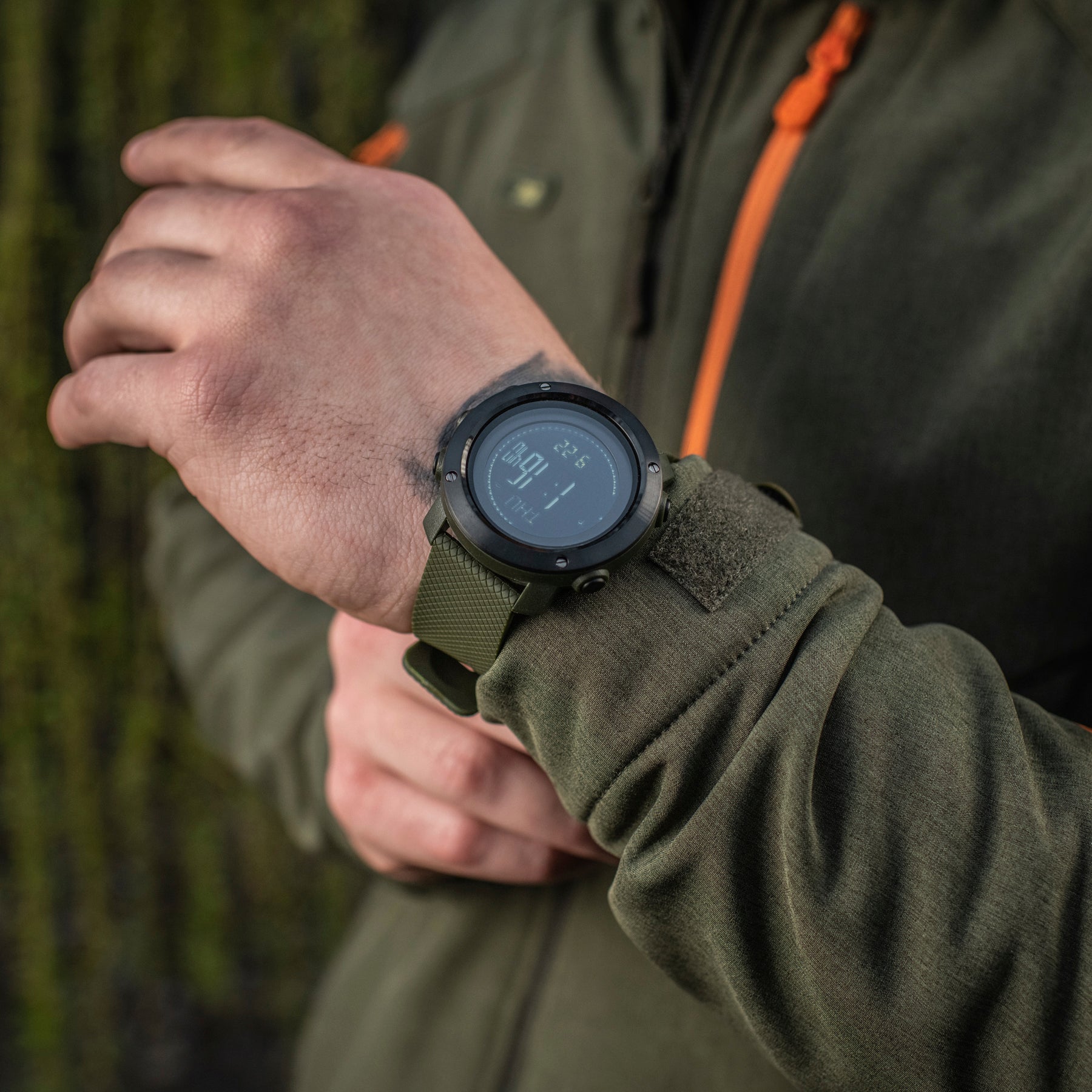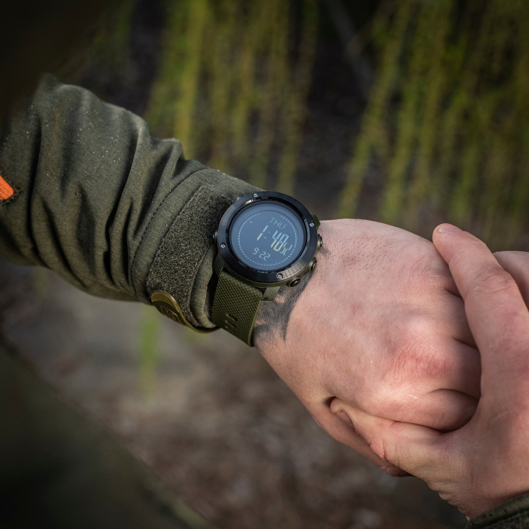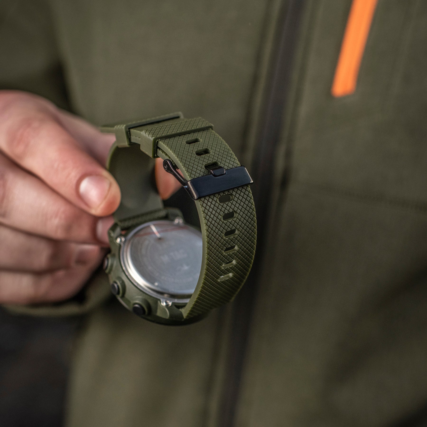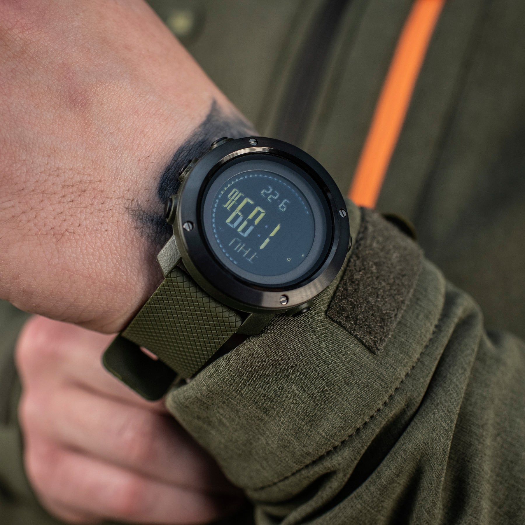 The watch with extensive functionality M-Tac. This model is an essential assistant to people who lead an active life, love to hike in the mountains, and are ideal for the military. The unique features possessed by the watch M-Tac will be useful not only for people involved in extreme sports such as skydiving but will be irreplaceable in everyday life. It can show you the atmospheric pressure and air temperature. By tracking the watch, you can predict in advance the deterioration of health and distribute your workload well at present. M-Tac multifunction tactical watch is equipped with a rugged, durable case made of polycarbonate + rugged stainless steel bezel. Glass is made of organic polycarbonate, which resists scratches and chips without any problem. Water-resistance 3 ATM. The watch features multifunctionality for versatile use, making it an ideal choice for tactical missions and everyday using.