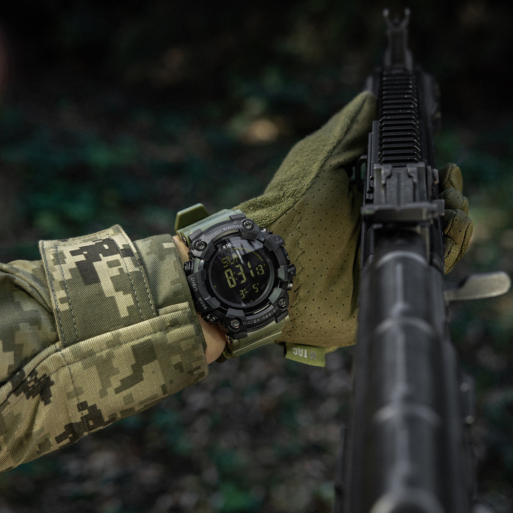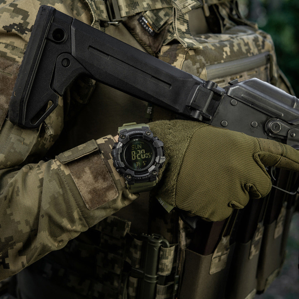M-Tac has released a new tactical watch, model 2037, which will be a valuable addition to your gear. This model offers a wide range of features, including a compass, LED backlight, stopwatch, timer, and alarm clock. You can find more information about its functions in the "Operating Instructions" that come with the watch. The watch case is made of ABS plastic, a durable and impact-resistant polymer known for its ability to withstand physical damage, moisture, and high temperatures.