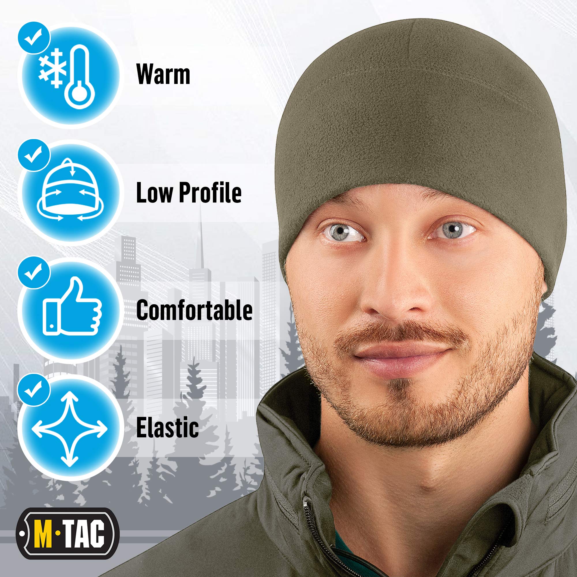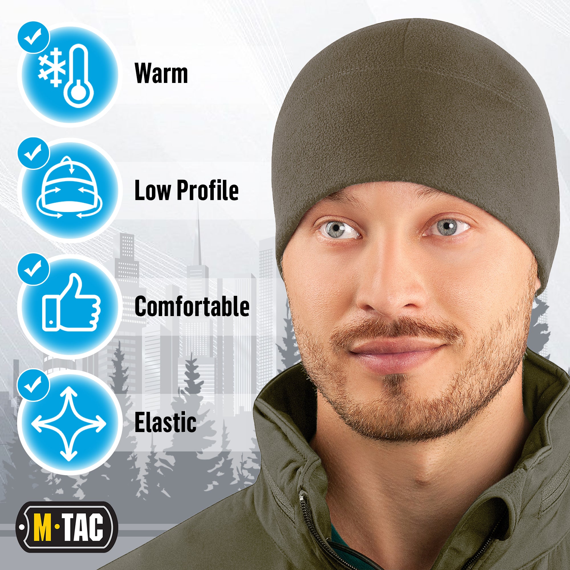 The light and warm fleece hat for cool and cold weather from M-Tac. Fleece Watch Cap Elite is made of lightweight and shape-retaining microfleece to keep you warm for many winters to come. The material does not absorb moisture and dries quickly to prevent itching and irritation. Need more than just protection from the weather? The low profile of this black tactical beanie allows for a helmet to be easily fitted on top. Soft and comfortable black beanie for men for any outdoor cold-weather occasion.