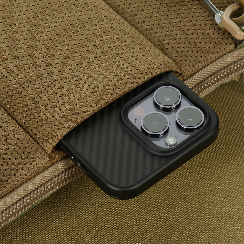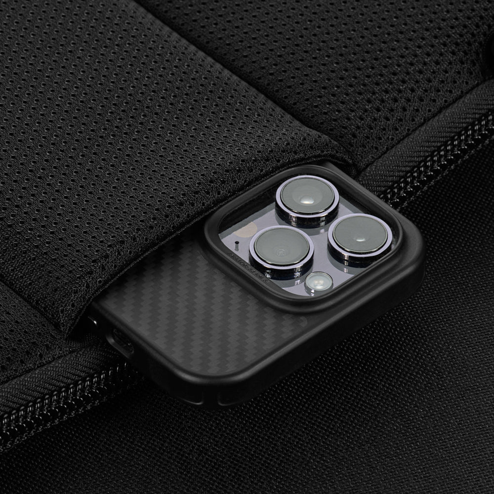The back side features a cushioned mesh panel and a dedicated pocket for a phone.