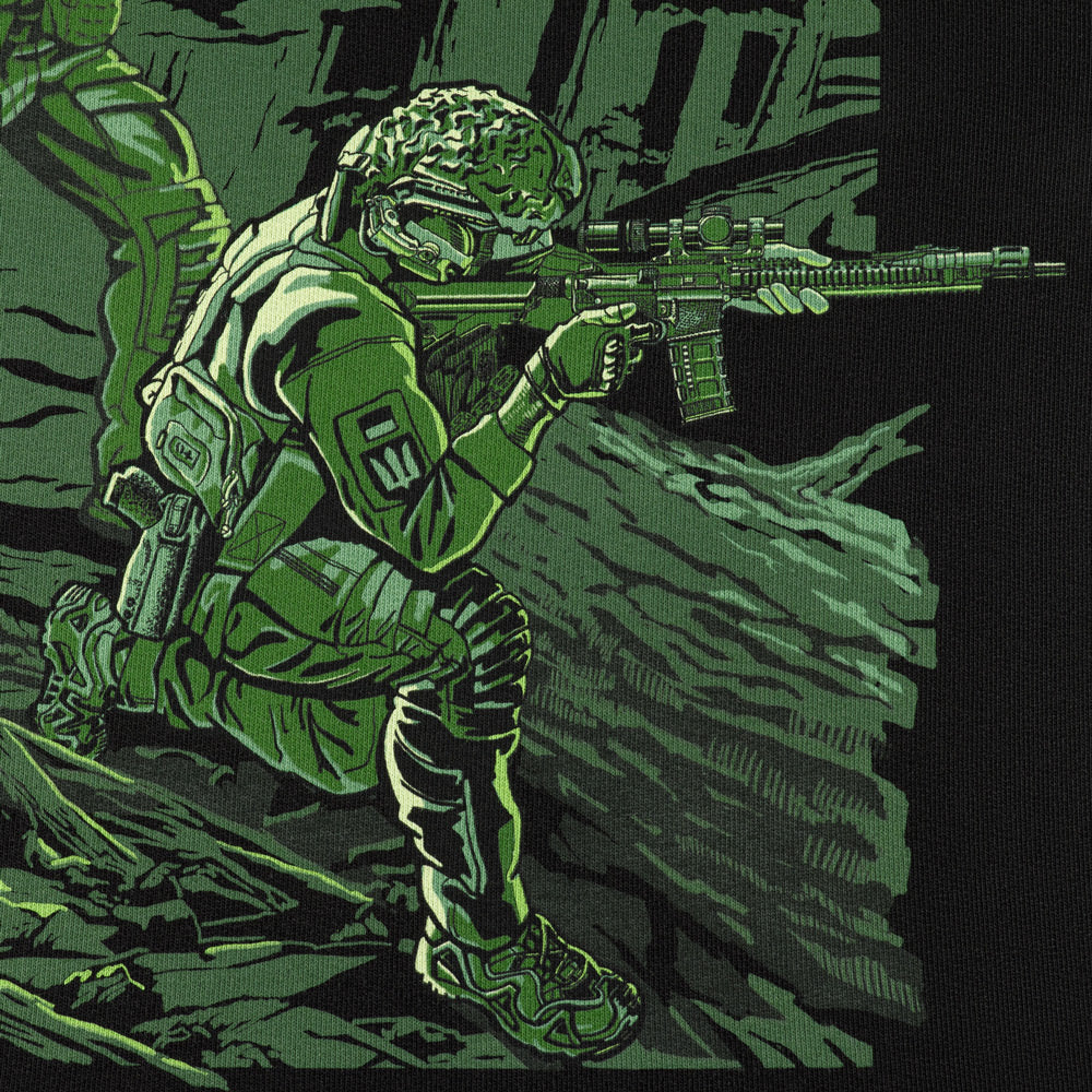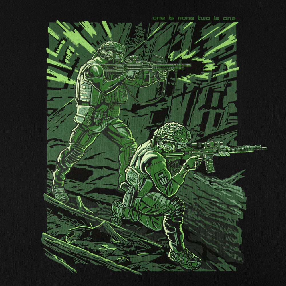 The basis for the print is an episode from the life of two comrades, depicted through the prism of a Night Vision Device. The image is complemented by the inscriptions: "one is none two is one" and "пліч-о-пліч" (Side by Side), which symbolize the value of camaraderie during the toughest trials of combat.