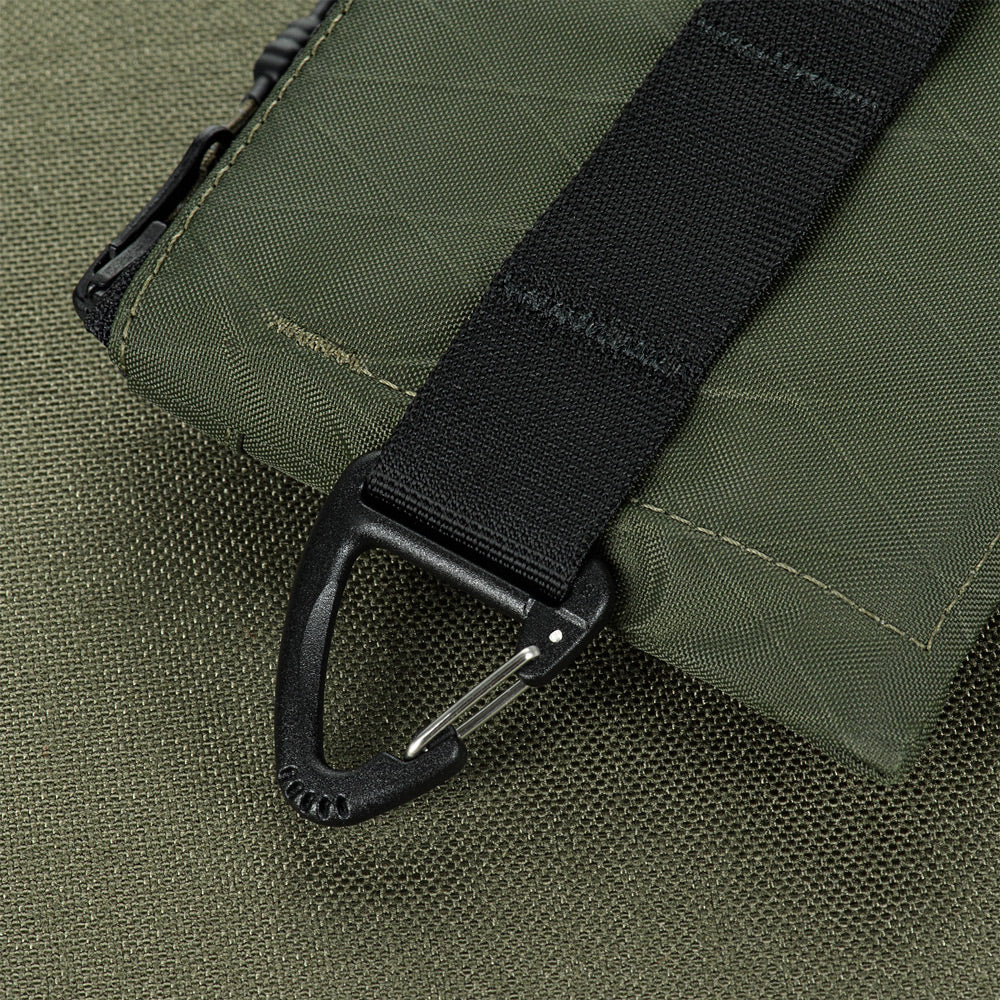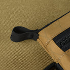 A Woojin Triangle Metal Hook carabiner is located on the right side of the wallet. Using it, you can attach the wallet to a belt loop on your pants. A D-ring is placed on the left side, allowing you to attach additional items to the wallet, such as a carabiner or keys. The rear of the product is equipped with a MOLLE strap that serves not only a decorative role but also allows you to attach a clip-on flashlight to the wallet.