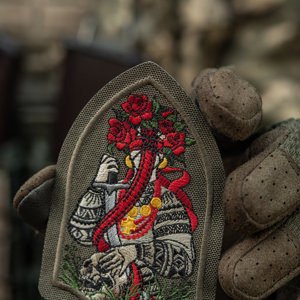 The patch features an embroidered Motanka doll in traditional attire, armed with a saber to defend her lineage. Her blank face is intentional, rooted in ancient Slavic beliefs. The patch embodies the resilience of the nation and the most important desire of all Ukrainians.
