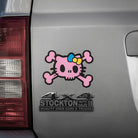The sticker features a stylized and aggressive Hello Kitty—the famous Japanese pop culture character, typically depicted as a white Japanese Bobtail cat with a bow on her head. This image was originally conceived by Shintaro Tsuji, the owner of a Japanese toy company, back in 1974. After extensive work, Tsuji managed to create his ideal, universally appealing hero, giving birth to the Hello Kitty image.