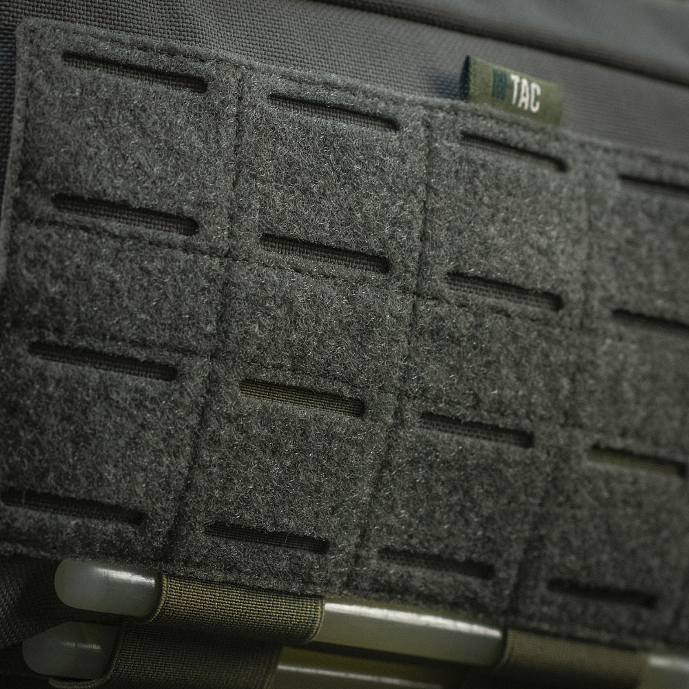 On the front, a Laser Cut Velcro panel enables mounting equipment, patches, or identifiers.