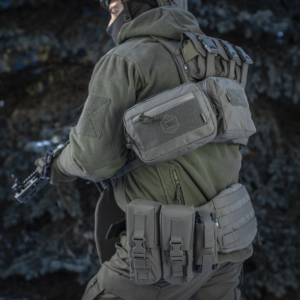 The pouch attaches to gear via a Laser Cut MOLLE system made from Cordura Squadron, making it compatible with cummerbunds, chest rigs, plate carriers, or assault panels. A front Velcro panel is available for patches or identifiers, and the signature Hex-style design with the M-Tac logo adds a modern tactical look.