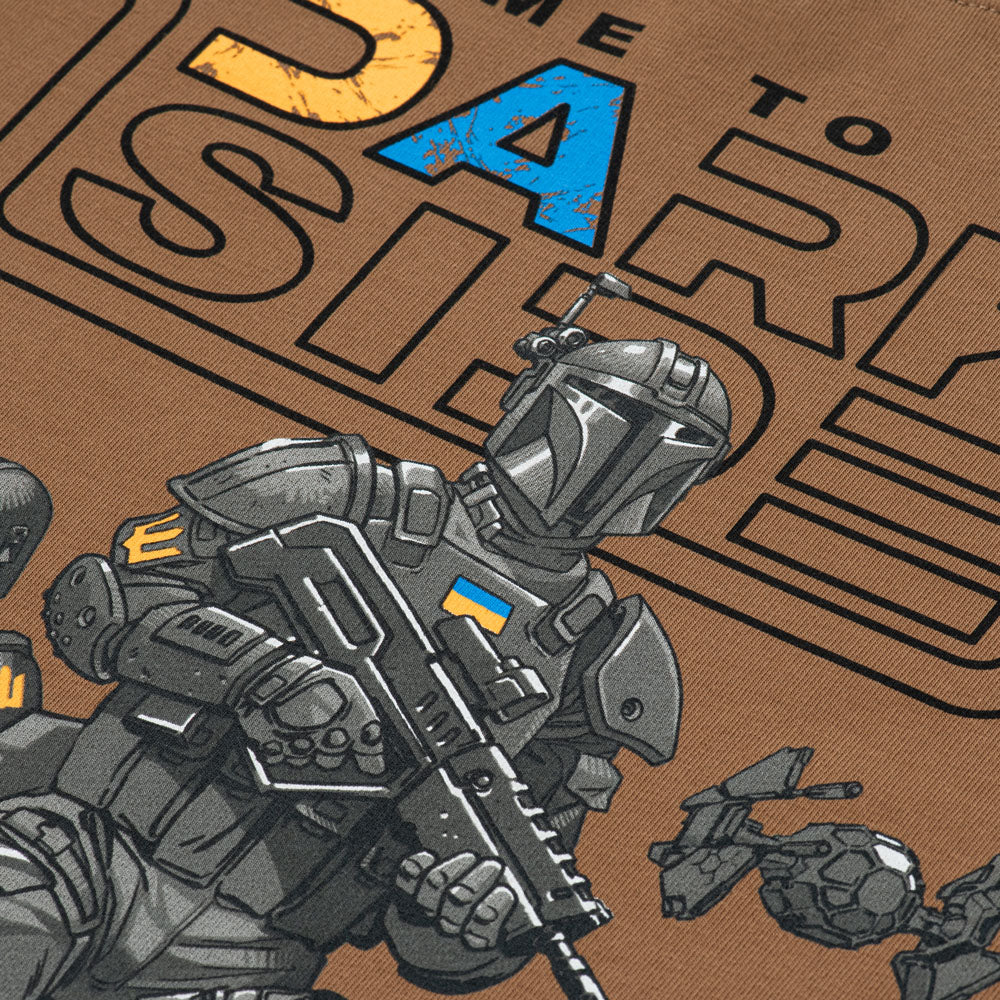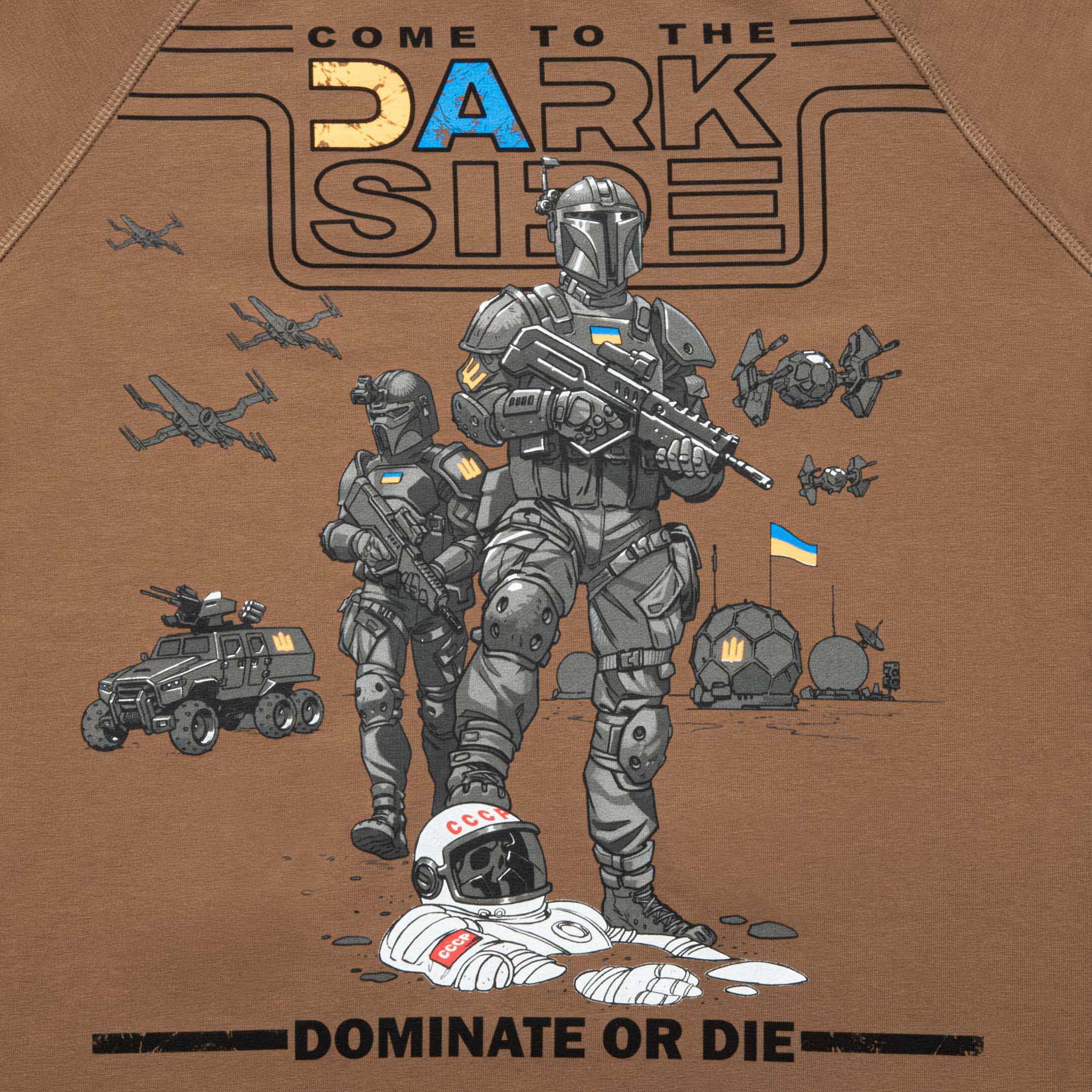 The unique print is especially relevant in today’s realities. It depicts Ukrainian astronauts armed and standing over fallen Soviet enemies, symbolizing strength and resistance. The inscriptions “Come to the Dark Side” and “Dominate or Die” highlight the individuality and character of the wearer.