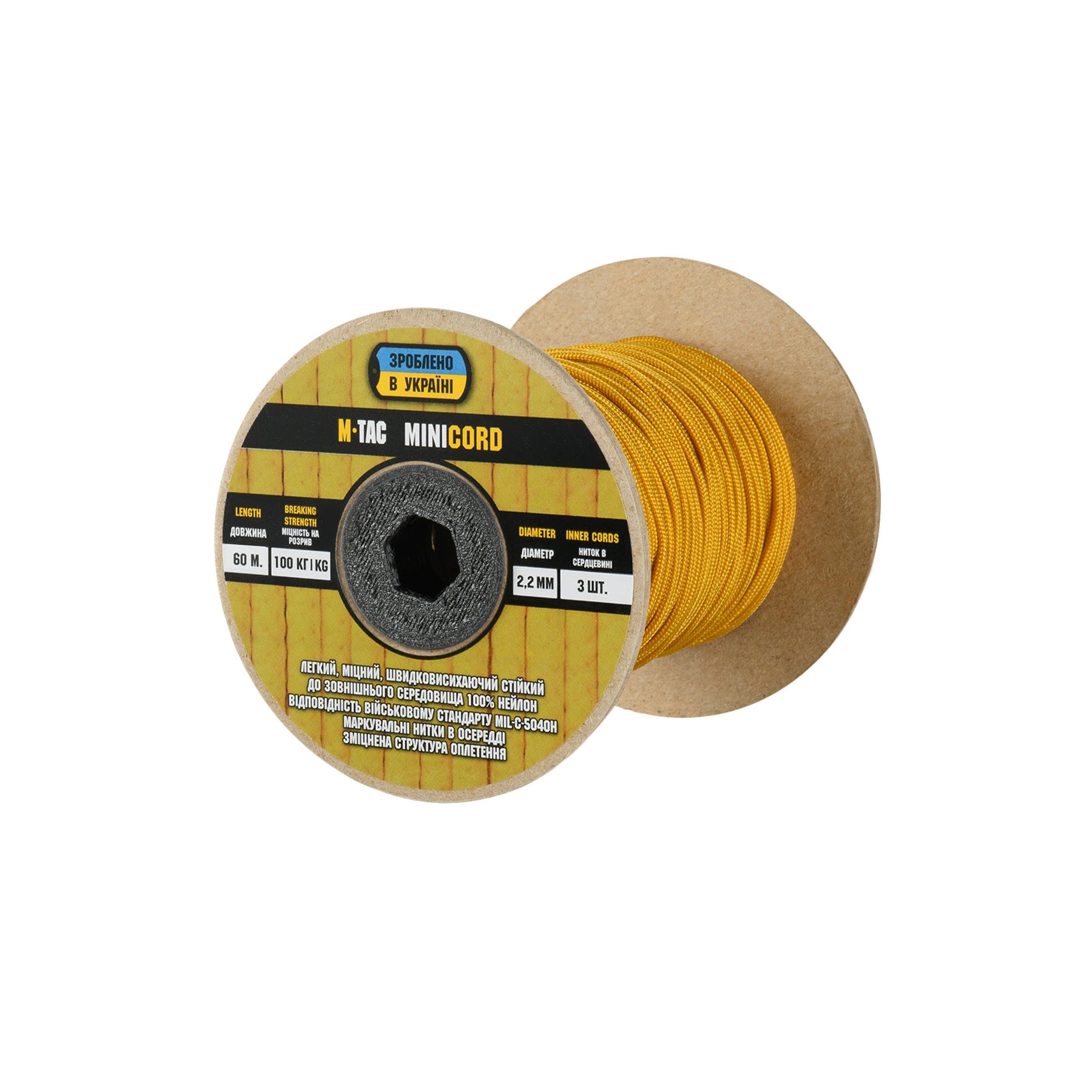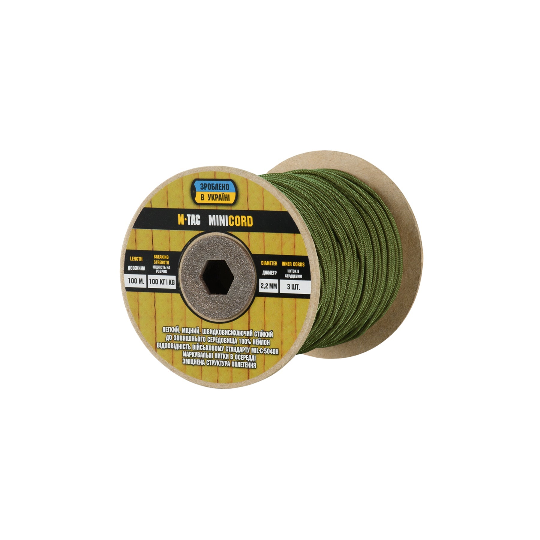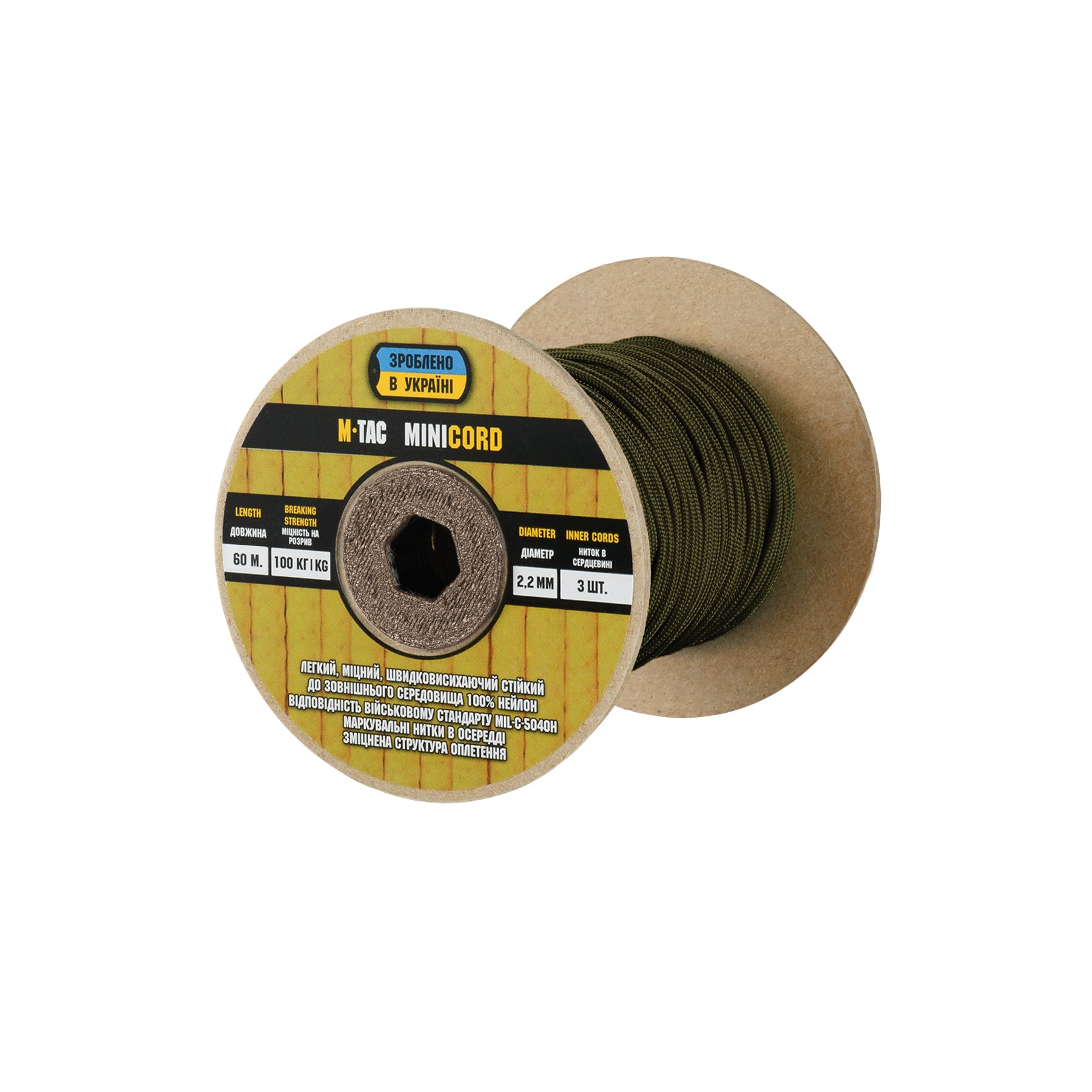 It is made of 100% nylon — a lightweight yet highly wear-resistant material. The cord consists of a reinforced outer braided sheath and an inner core, which together provide high tensile strength while keeping weight to a minimum. For ease of use and storage, the paracord is supplied on a pressed cardboard spool.