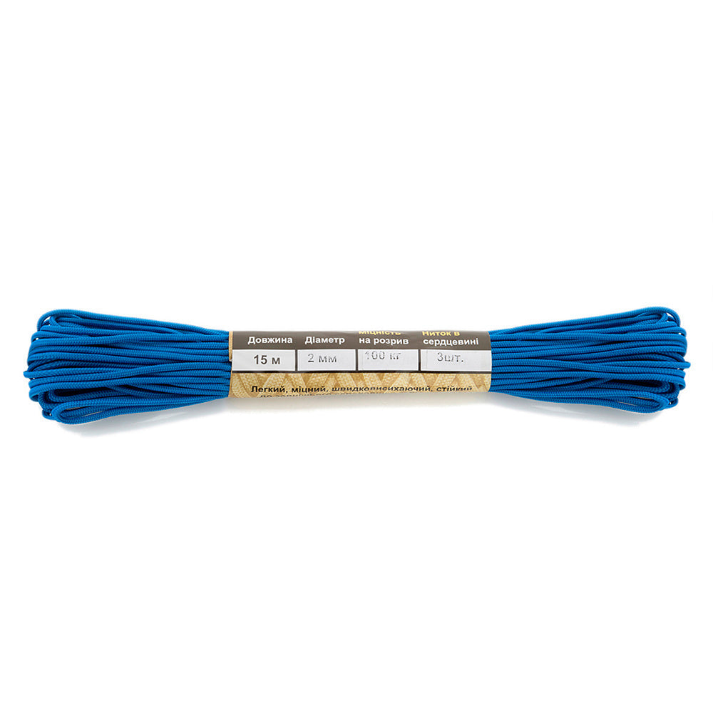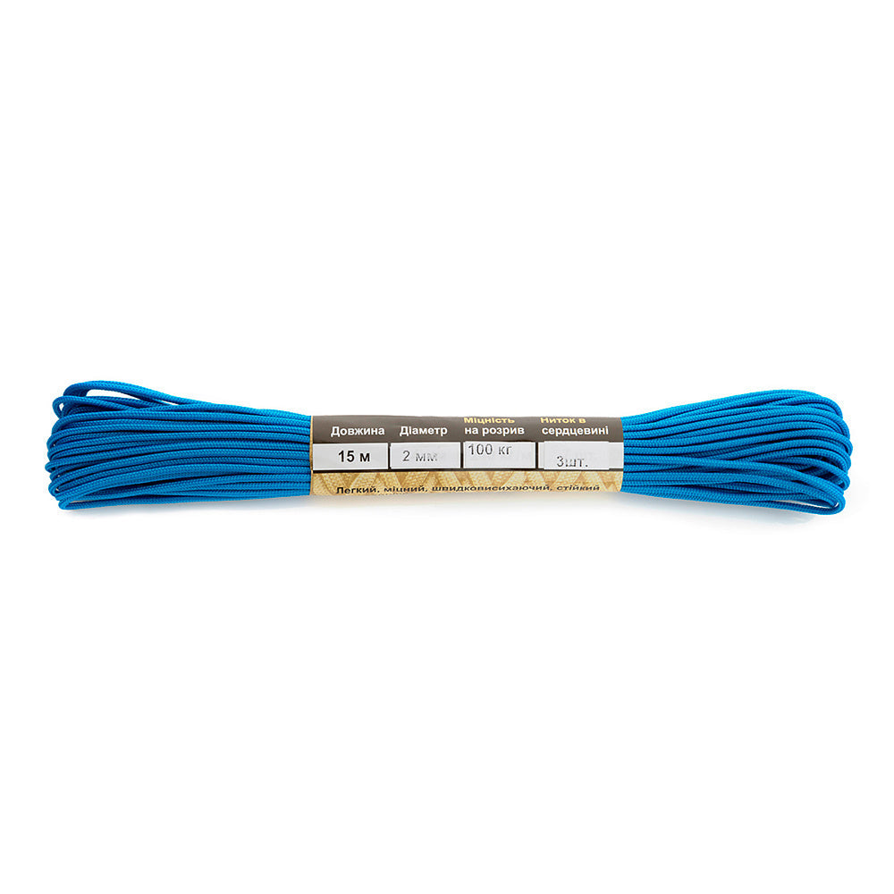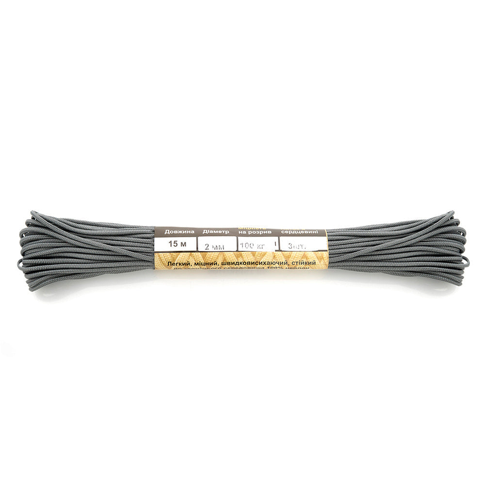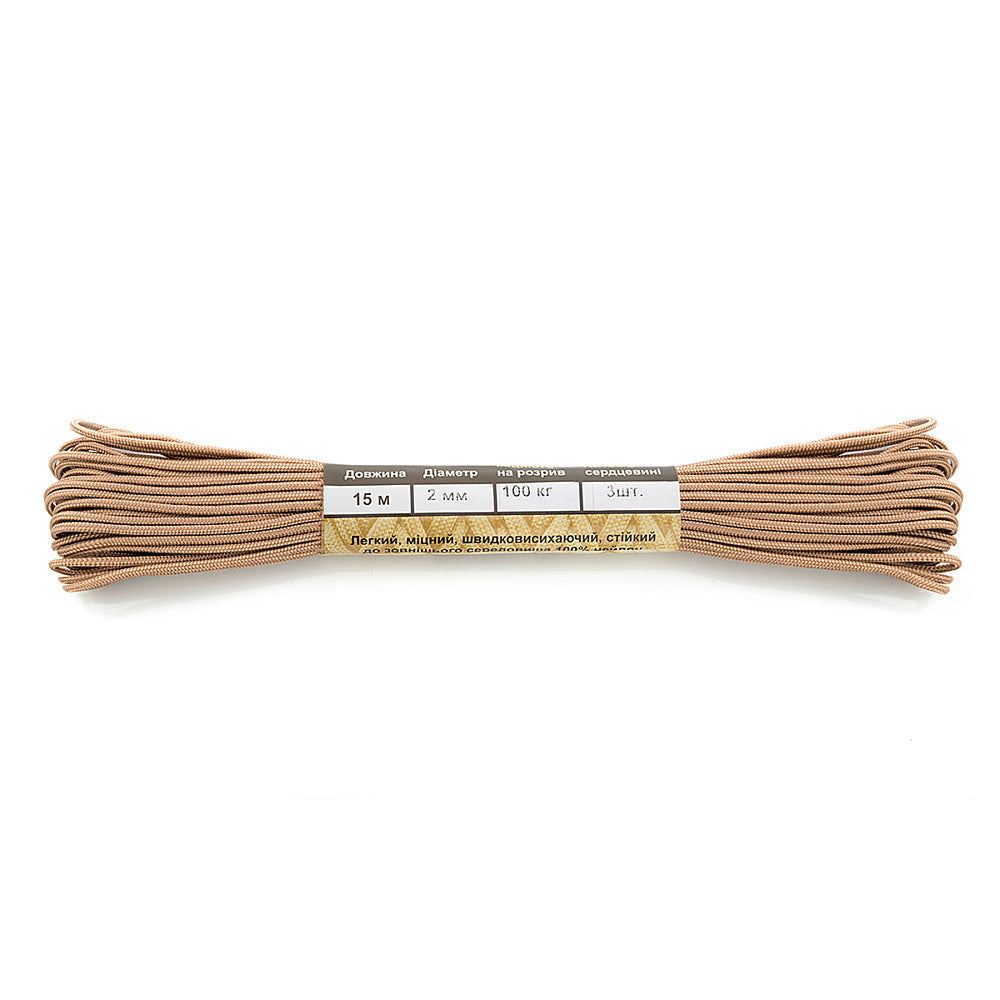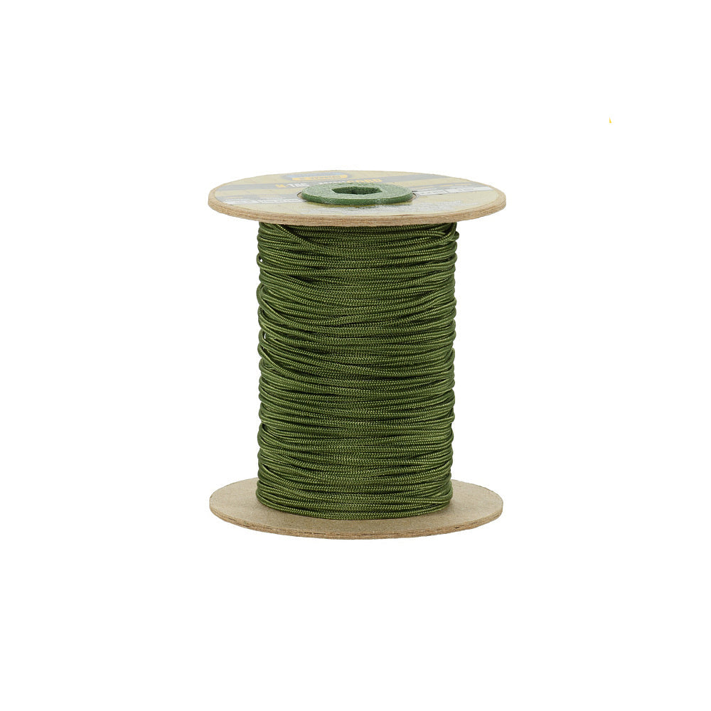 It is made of 100% nylon — a lightweight yet highly wear-resistant material. The cord consists of a reinforced outer braided sheath and an inner core, which together provide high tensile strength while keeping weight to a minimum. For ease of use and storage, the paracord is supplied on a pressed cardboard spool.
